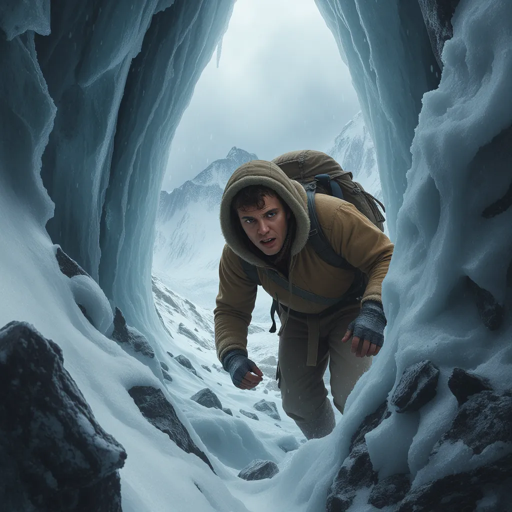 Группа медленно продвигается по узкому ледяному ущелью, каждое движение требует сосредоточенности. Скользкие камни и снежные заносы становятся всё частыми, слышны трески льда и гул ветра. Внезапно одна из верёвок ослабляется, угрожая срыву! Наступил критический момент: можно попытаться укрепить верёвку быстро или искать обходной путь, что затянет ход экспедиции.