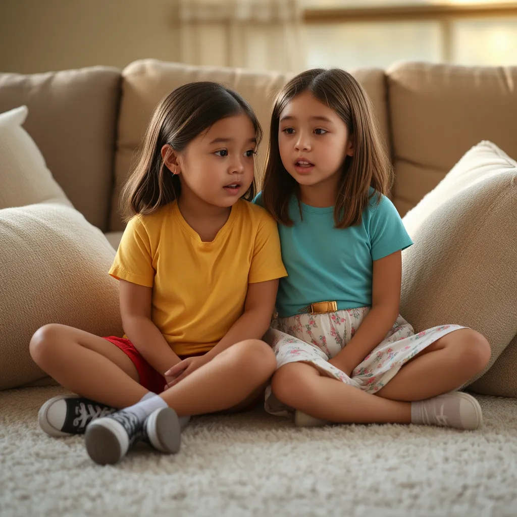 At Sofia’s cozy home, in a softly decorated living room filled with warm tones and gentle afternoon light, Sofia and Lily sat close together on a plush rug. Sofia, an 8-year-old Latina girl wearing a plain yellow t-shirt and red shorts with black sneakers and white socks, softly sang alongside Lily, an 8-year-old brunette girl with shoulder-length hair wearing an aqua blue t-shirt, a white skirt with a floral pattern, a gold belt, and white sneakers with white socks. Their voices blended gently as they sang in memory of their fallen friend Isabella, sharing a quiet moment of remembrance and comfort.