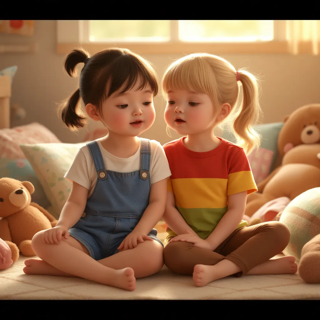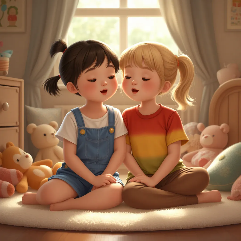 In Daisy’s warmly lit bedroom, Mei and Daisy sat side by side on a soft, colorful rug surrounded by plush stuffed animals and cozy pillows. Mei, a 7-year-old Asian girl with a small ponytail wearing blue shorts overalls over a white t-shirt, gently joined Daisy, a 6-year-old blonde girl with a ponytail and bangs in her red-to-yellow-to-green gradient t-shirt and brown pants. Their soft voices blended as they sang a tender lullaby in memory of their lost friend Isabella. Sunlight streamed softly through the window, casting a gentle glow over them, filling the room with a peaceful and heartfelt atmosphere that contrasted with their sadness.