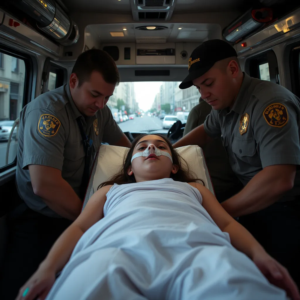 Isabella was carefully loaded onto a backboard by the paramedics, her small frame trembling with weakness. They quickly placed an oxygen mask over her face, the cold air helping her breathe easier amid the distress. Her face was pale, and she was vomiting blood, a clear sign of the severe trauma she had endured. The urgency in the ambulance was palpable as the medical team rushed her to the hospital, determined to give her the care she desperately needed.