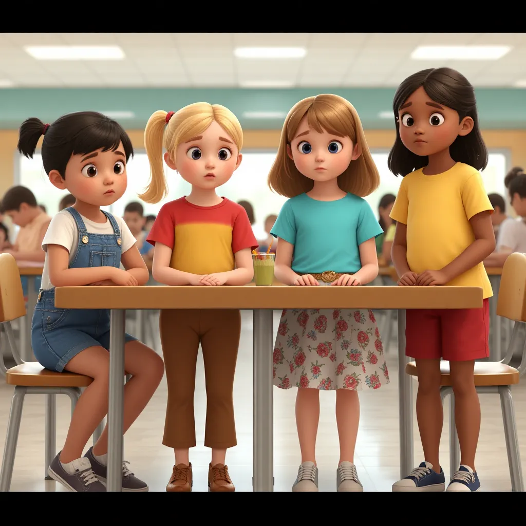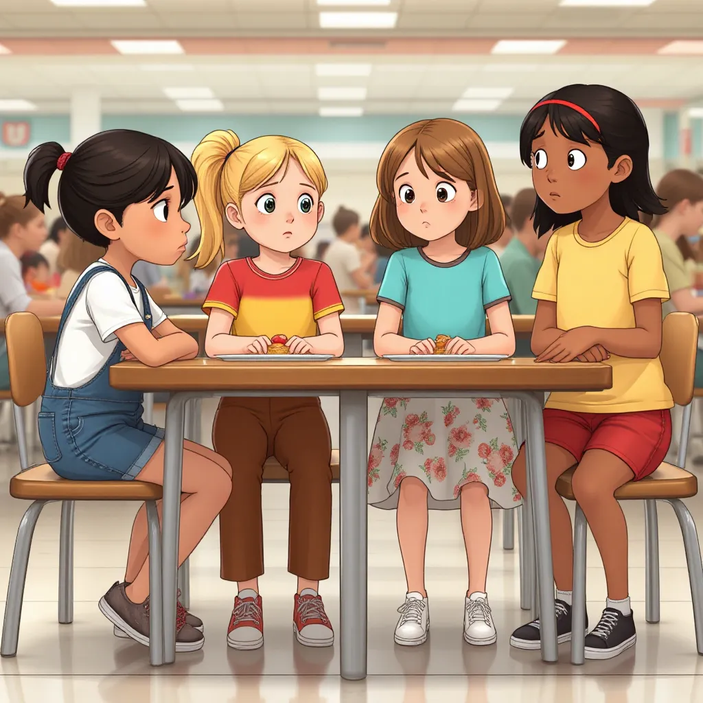 During lunchtime at school, Mei and Daisy sat together at a table with their other best friends, Lily and Sofia. Lily, an 8-year-old brunette girl with shoulder-length hair, wore a plain aqua blue t-shirt, a white skirt with a floral pattern, a gold belt, and white sneakers with white socks. Sofia, also 8, was a Latina girl dressed in a plain yellow t-shirt, red shorts, and black sneakers with white socks. The group chatted happily, but soon the conversation shifted when Daisy asked softly, “Where’s Isabella? She didn’t come with us today.”