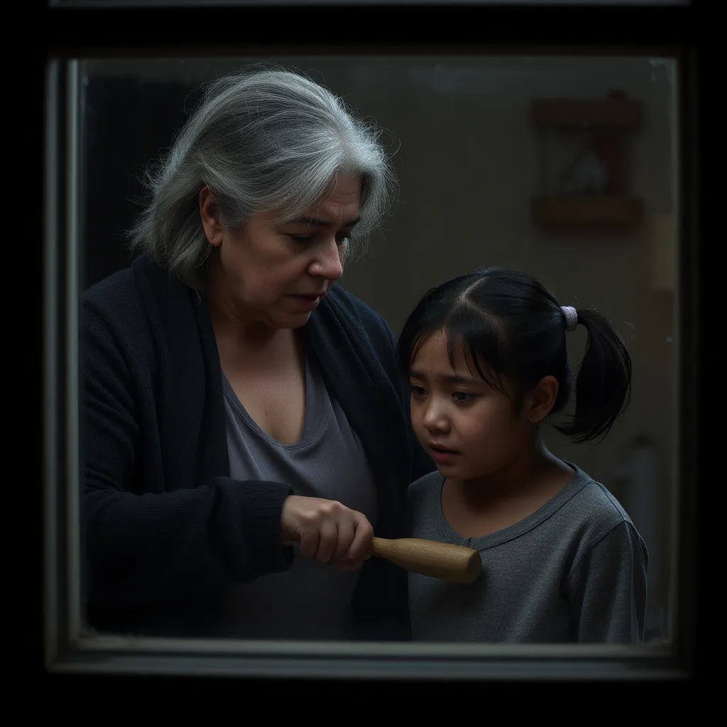After school, as the girls were walking home together, they suddenly heard loud, uncontrollable crying coming from a nearby house. Curious and worried, they cautiously approached and peeked through the window. Inside, they saw Mrs. Finster, her stern grey eyes fierce, holding a wooden paddle and angrily whipping Isabella. The 9-year-old girl was crying uncontrollably, her face streaked with tears, overwhelmed by fear and pain.