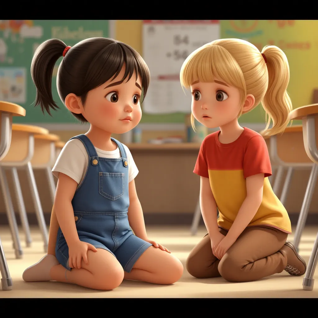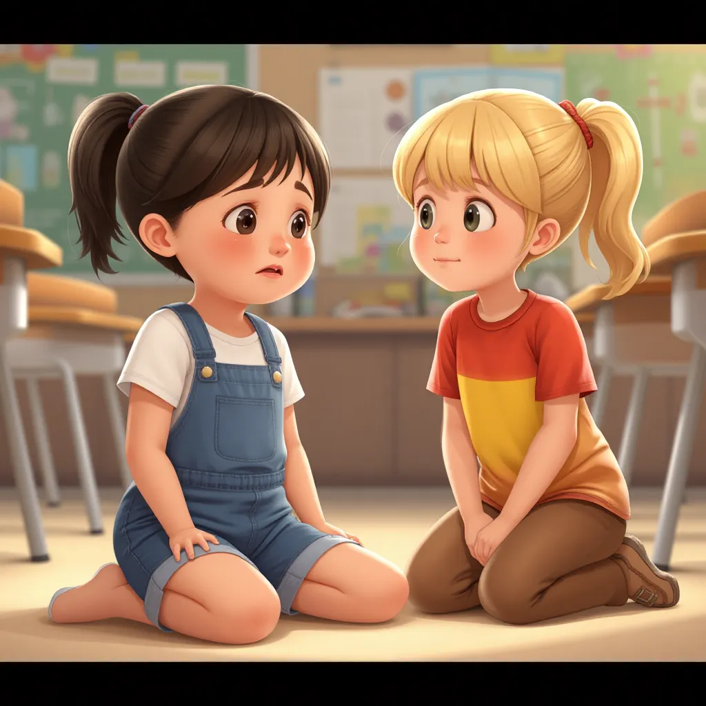 The scene unfolds in a lively elementary school classroom bathed in soft morning sunlight. Mei, the 7-year-old Asian girl with her small ponytail, is sitting on the colorful classroom floor, tears streaming down her cheeks as she quietly cries. She’s still wearing her blue shorts overalls over a white t-shirt. Next to her kneels Daisy, Mei’s caring 6-year-old best friend, a blonde girl with a ponytail and bangs. Daisy is dressed in a vibrant t-shirt fading from red to yellow to green and brown pants. She looks deeply concerned, gently asking Mei with a soft voice, “Mei, what’s wrong?”