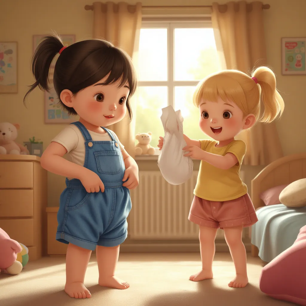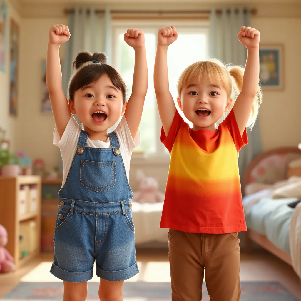 In Daisy’s bright and cozy bedroom, Mei had just finished rebuckling her blue shorts overalls after tossing the diaper out the window with Daisy’s help. Filled with relief and joy, the two girls looked at each other, grinning from ear to ear. Suddenly, they raised their fists in the air and screamed happily, their voices full of excitement and triumph.