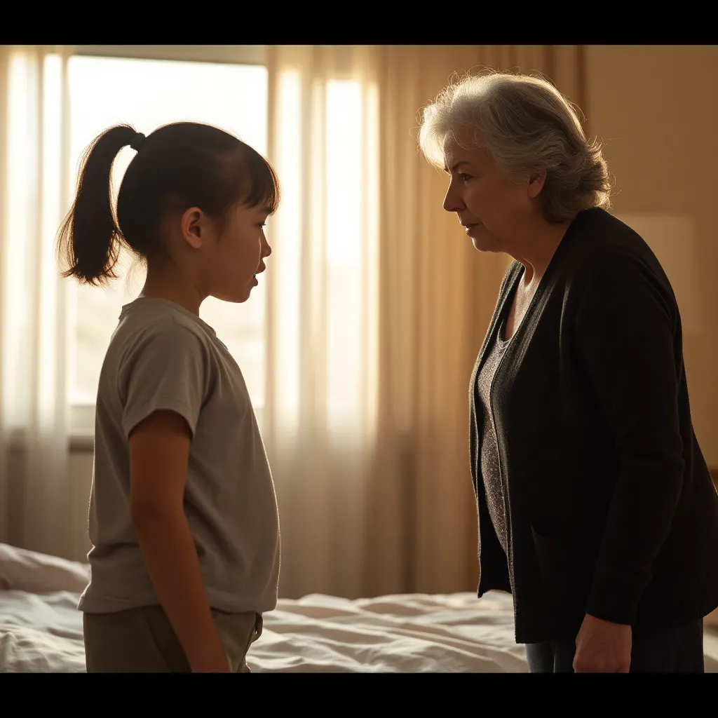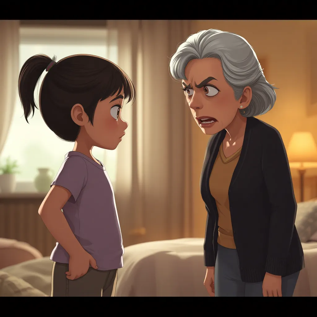 The tense morning scene played out like a live-action drama. Mei, a small 7-year-old Asian girl with a neat ponytail, stood firmly in her colorful casual outfit, her young face full of defiance and confusion. Across from her stood Mrs. Finster, the stern 65-year-old babysitter, her grey hair framing a harsh expression and narrowed eyes filled with impatience. She was clad in a plain dark cardigan over a blouse, her voice sharp and commanding as she shouted down at Mei.