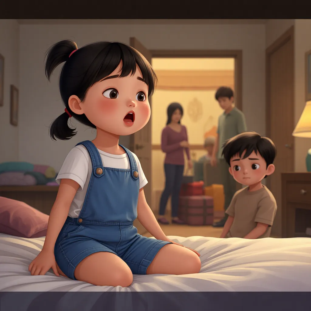 Mei, the lively 7-year-old Asian girl with her small ponytail, is sitting on her bed wearing blue shorts overalls over a white t-shirt. She’s happily singing a cheerful tune, her face full of joy and movement as she bounces slightly with the rhythm. In the background, her parents are hurriedly packing bags, moving around with purpose. Mei’s 10-year-old brother stands nearby with a scowl, arms crossed, clearly annoyed about the babysitter coming over, casting a shadow of tension in the otherwise warm family scene.