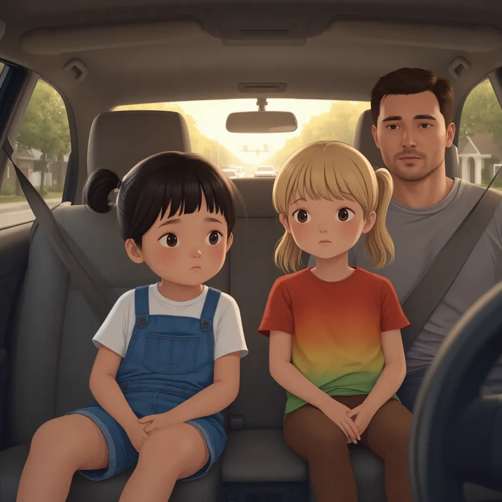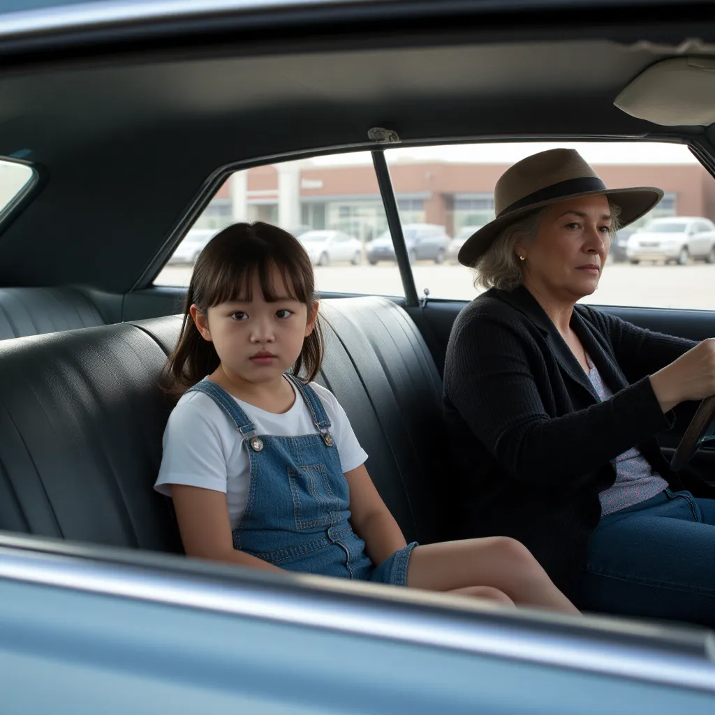 Mei, still wearing her white t-shirt and blue shorts overalls, sat quietly in the backseat of Mrs. Finster’s vintage 1965 Cadillac. The large car’s leather seats creaked softly as Mei fidgeted nervously, her small hands clutching the edges of the seat. Outside, the world blurred past through the windows.
