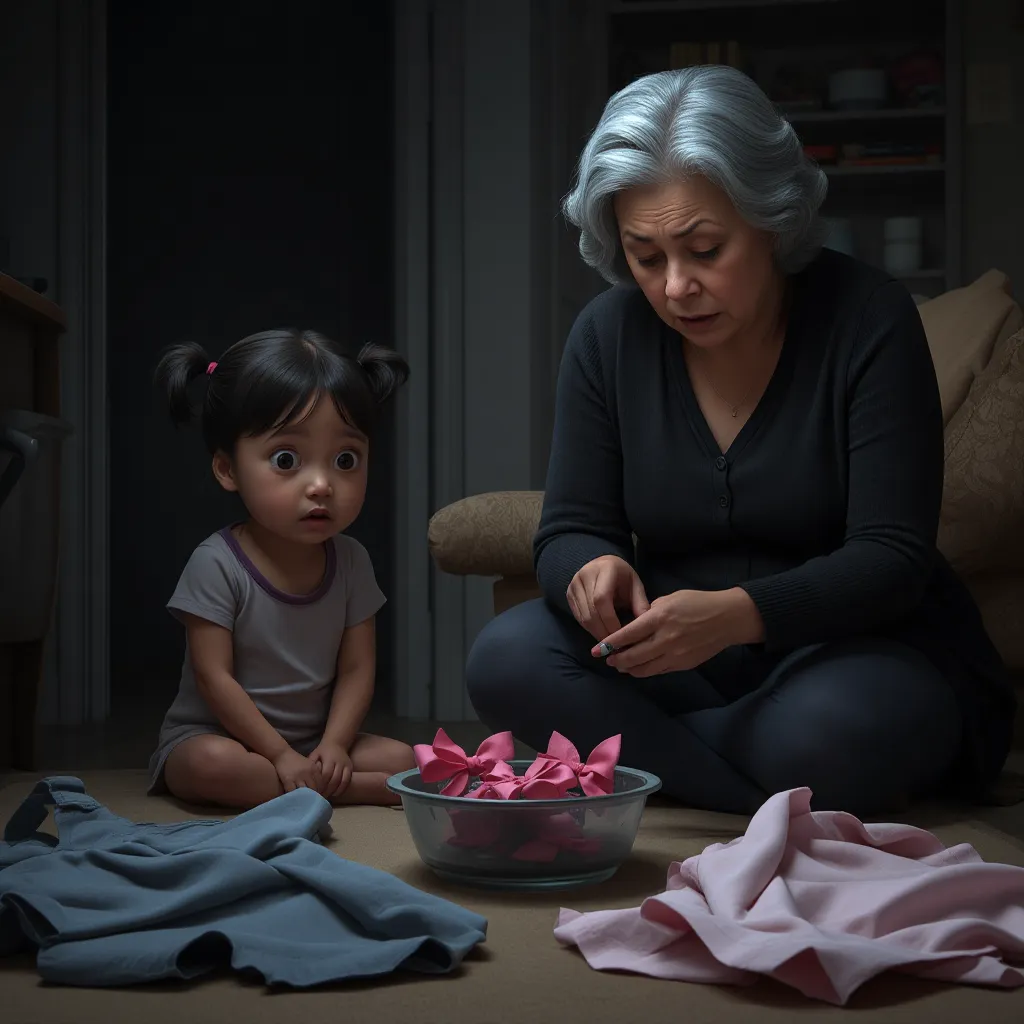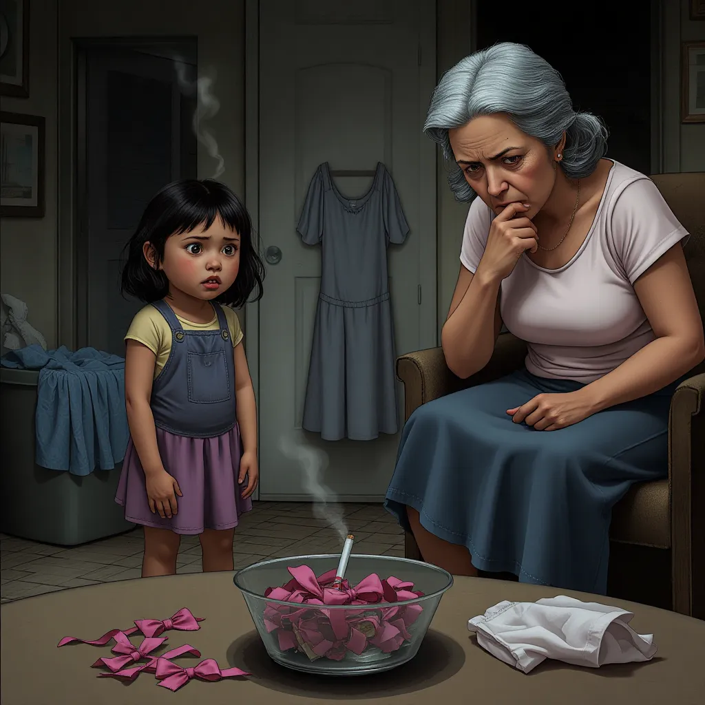 Inside the dimly lit house, the tension was thick as Isabella sat quietly, her ponytails undone by Mrs. Finster’s strict command. The pink ribbon bows were discarded into an ashtray, where Mrs. Finster crushed them beneath the heel of her Marlboro cigarette, smoke curling upward in the stagnant air.