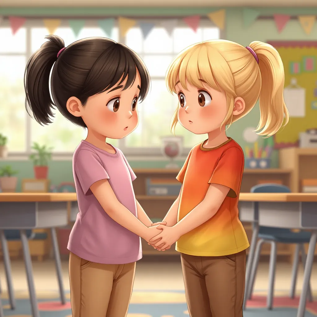 Mei sniffled, struggling to find the words, reluctant but comforted by Daisy’s warm presence. The busy classroom background contrasted with this tender moment between two young friends.