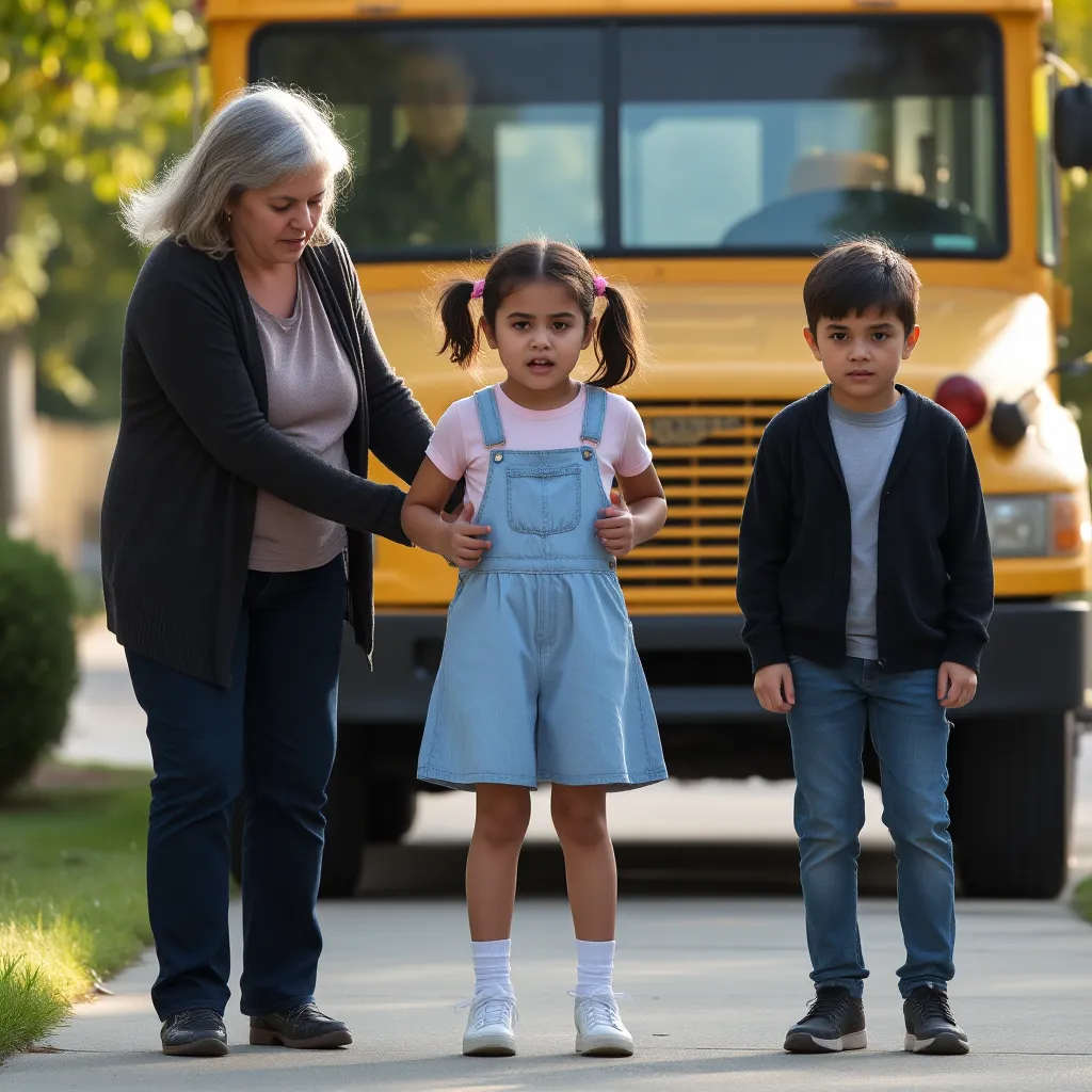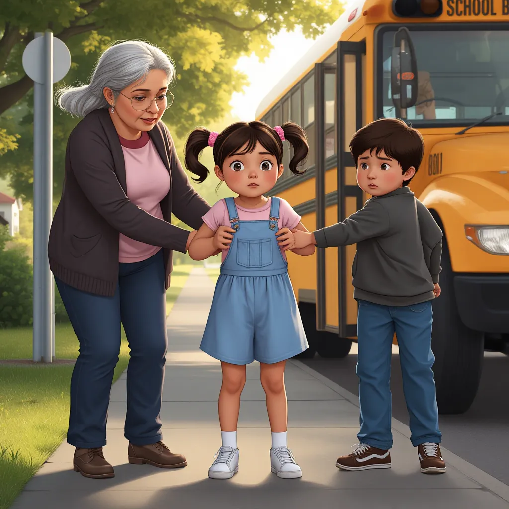 The next morning, Mrs. Finster and Mei’s brother waited near the bus stop with intense focus. As Mei and Daisy climbed onto the school bus together, their eyes filled with hope for a carefree day, Mrs. Finster suddenly spotted Isabella—Mei’s other close friend. Isabella was a 9-year-old Latina girl with ponytails tied by pink ribbon bows, wearing light blue skirt overalls over a plain light pink t-shirt, white sneakers, and white socks.