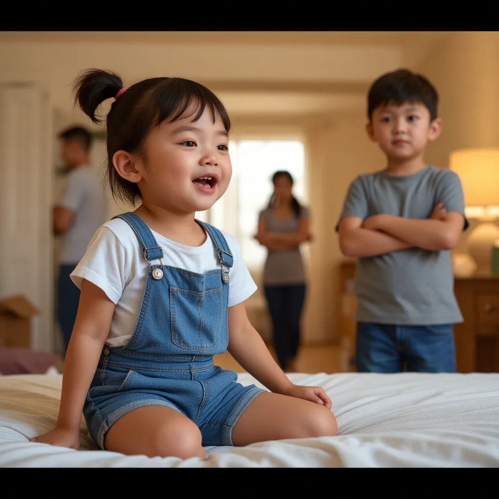 Mei, a cheerful 7-year-old Asian girl with long black hair tied in a small ponytail, sat on her bed wearing casual blue shorts overalls over a white t-shirt. She was happily singing a song, her eyes sparkling with excitement. Meanwhile, her parents were busy packing their bags in another room, preparing to go out for the evening. Mei’s mean 10-year-old brother was standing nearby, arms crossed and a frown on his face, clearly not thrilled about the upcoming babysitter staying with them. The atmosphere was a mix of excitement and irritation as Mei looked forward to having company while her brother dreaded the interruption.
