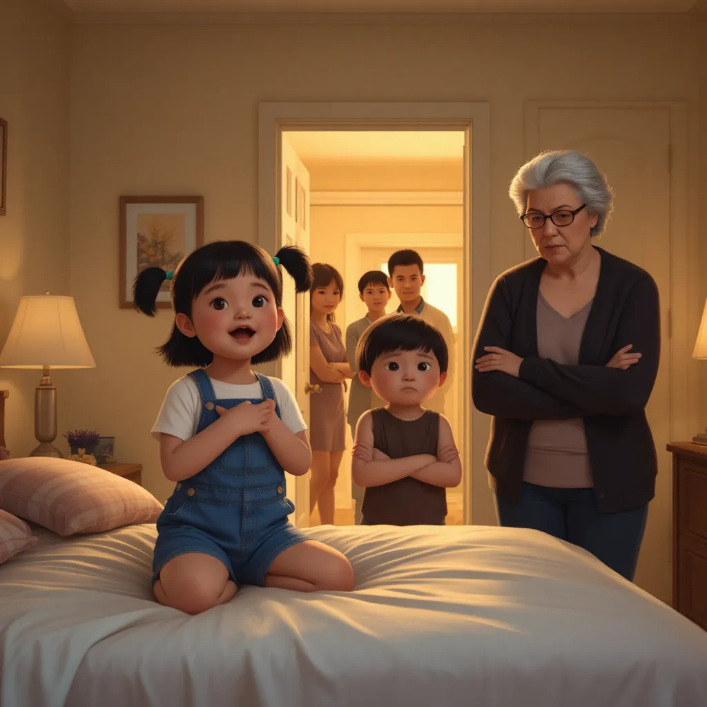 As Mei continued happily singing on her bed, the doorbell rang signaling the arrival of the babysitter. Soon, Mrs. Finster, a mean-looking 65-year-old woman with short, grey hair and sharp eyes, stepped into the warmly lit room. She wore a stern expression and a plain, dark cardigan over a blouse, carrying a small bag. Mei’s brother immediately straightened up, his scowl deepening as Mrs. Finster entered. Mei, still full of energy, glanced at her with cautious curiosity. The parents quickly said their goodbyes, handed over the keys, and headed out the door, leaving the siblings under Mrs. Finster’s watchful gaze.
