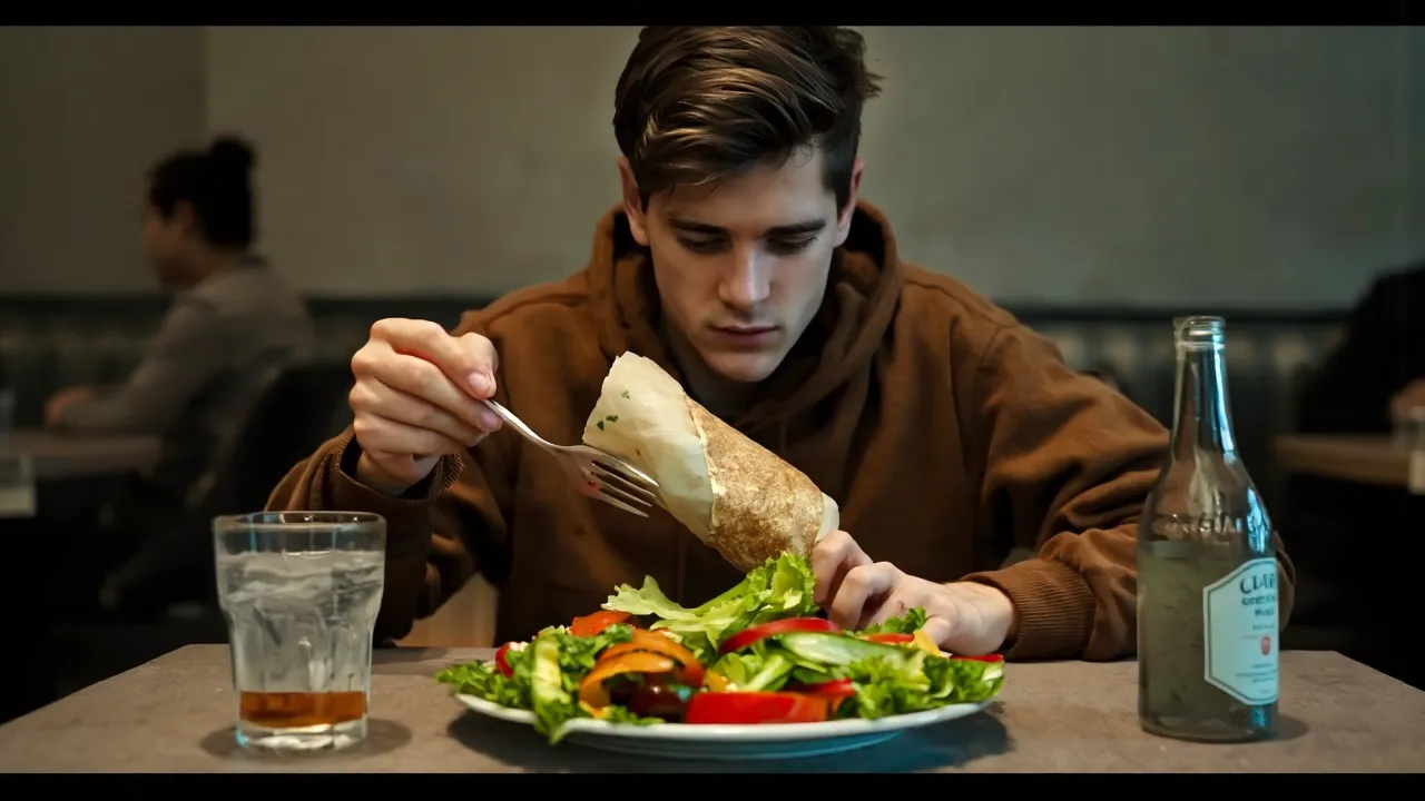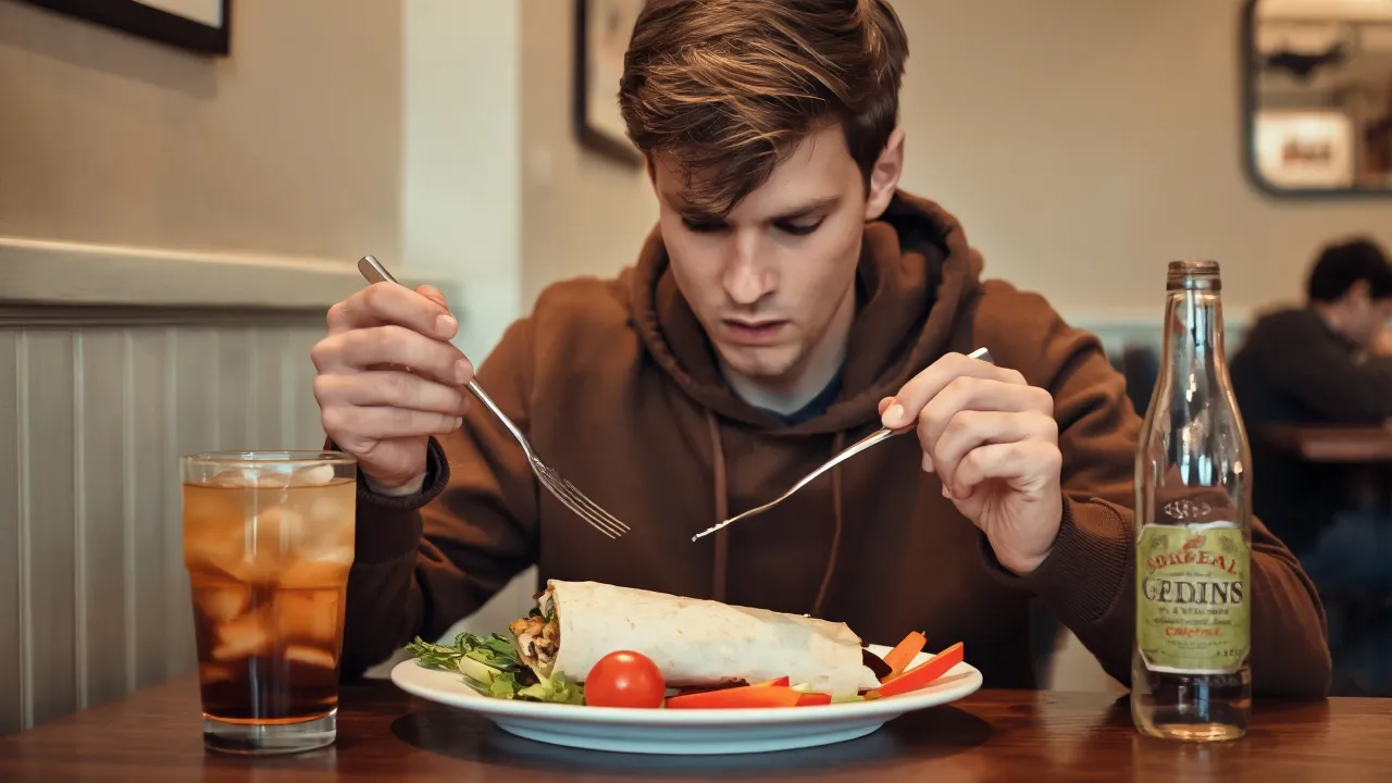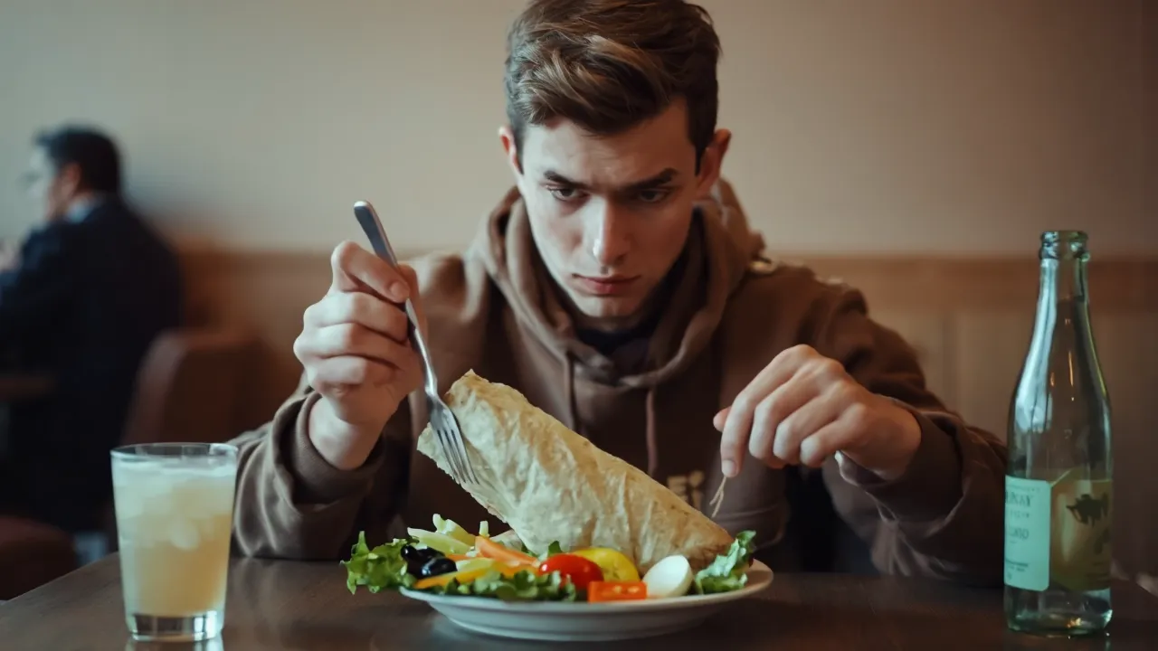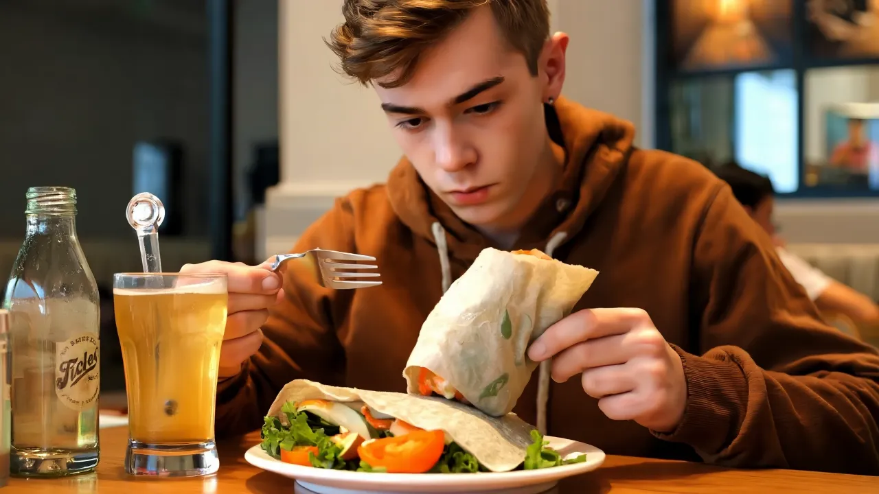 A young man wearing a brown hoodie is intently preparing to eat a large wrapper on a plate decorated with fresh vegetables. He holds a fork and knife with a focused expression, surrounded by a glass of iced drink and a vintage-style bottle. The background features soft, muted colors and a hint of another person sitting in a cafe, enhancing the cozy atmosphere.
