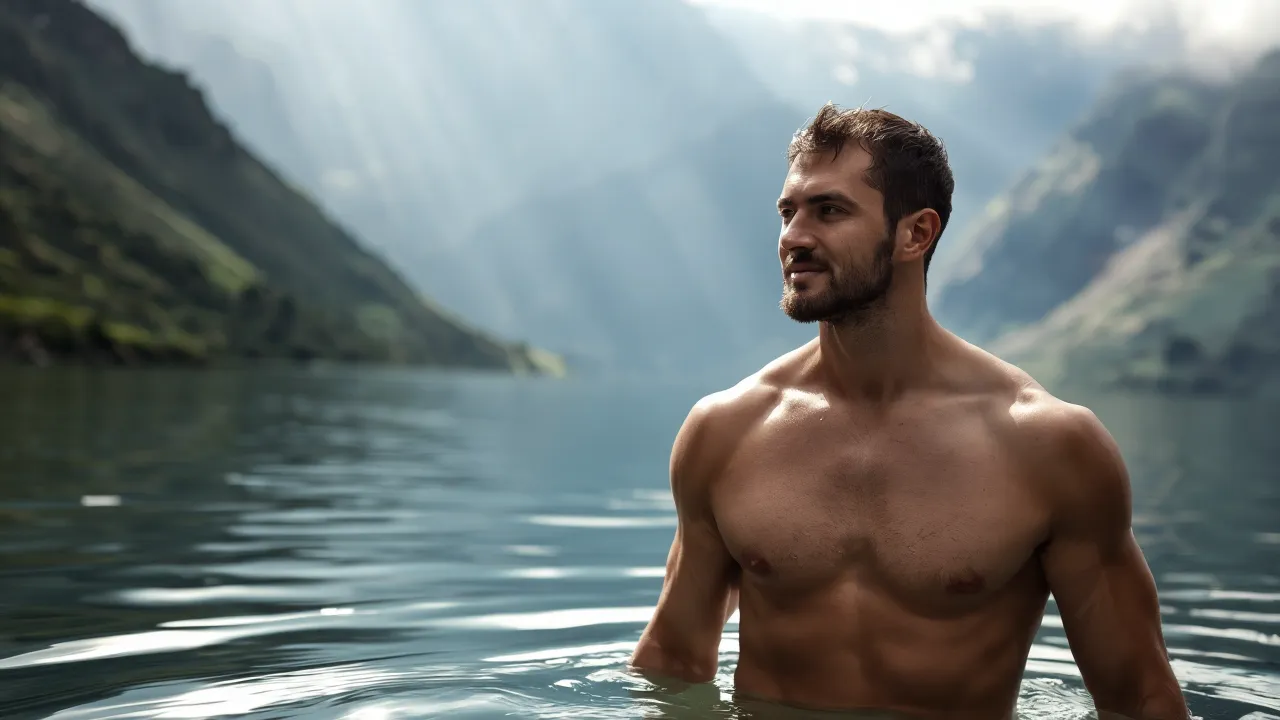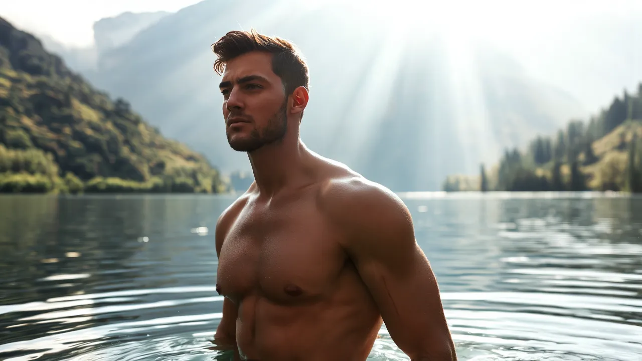 A shirtless man stands in a serene lake, the water reaching mid-chest, his expression peaceful as he gazes out of the corner of his eye. Sunbeams filter through the mountains in the background, illuminating his strong physique and creating a tranquil atmosphere. The surrounding landscape includes lush vegetation and misty hillsides, enhancing the natural beauty of the scene.