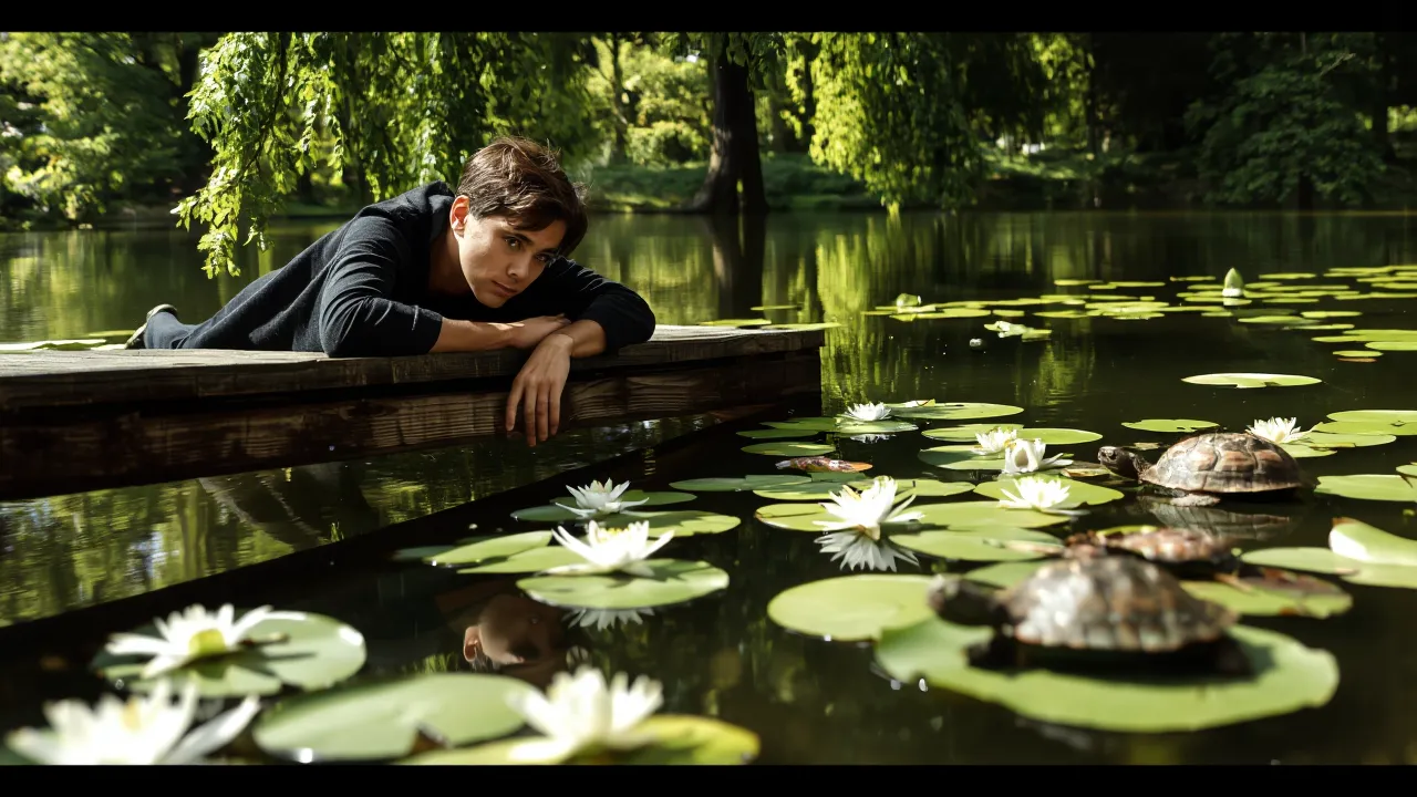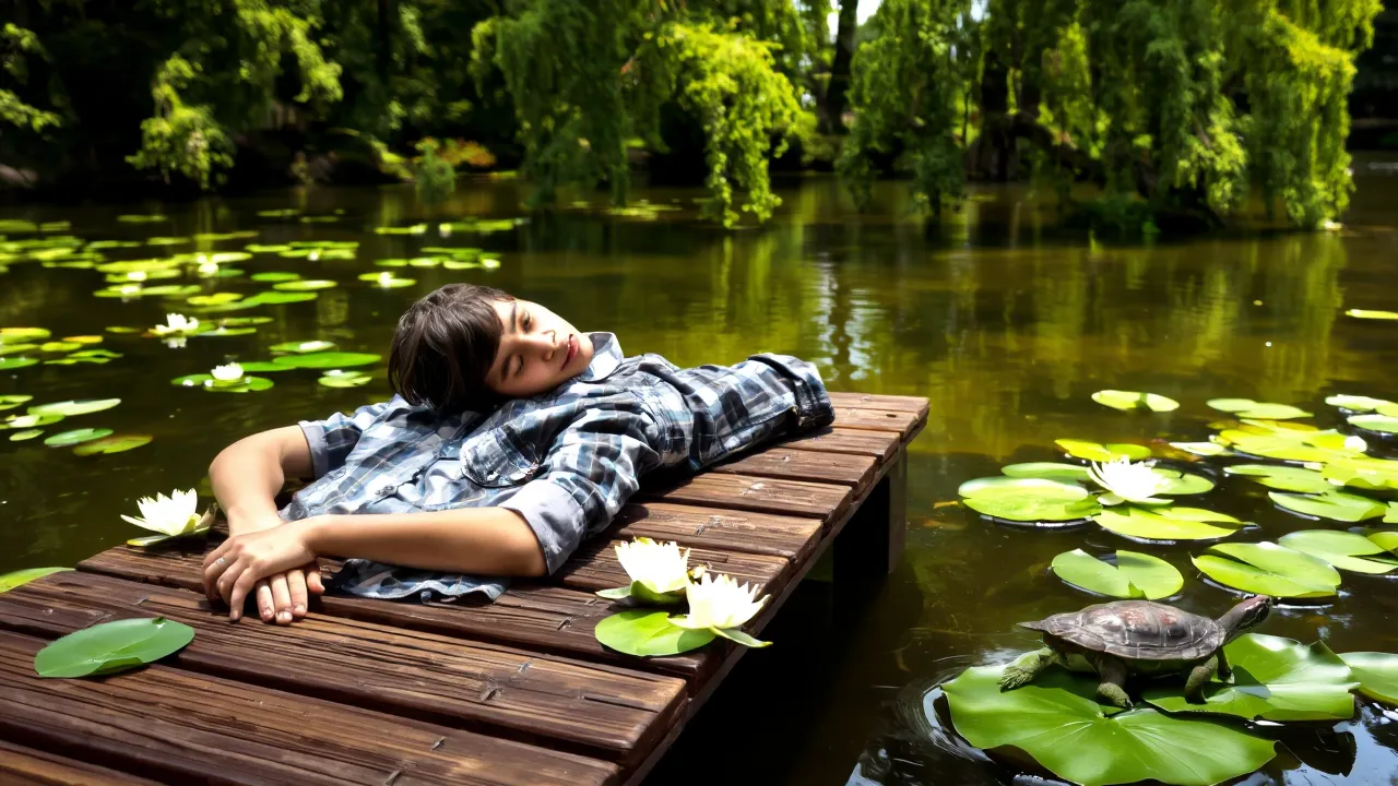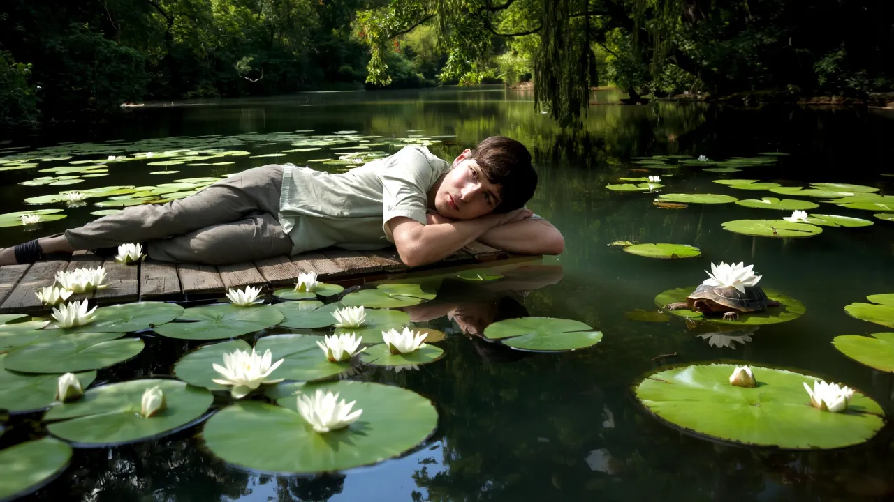 A young man lies on a wooden bridge over a serene pond, thoughtfully gazing into the water. Around him, delicate white lilies float on green lily pads. To the right, a turtle rests on a lily pad, while soft sunlight filters through the leafy trees in the background, creating a tranquil atmosphere.