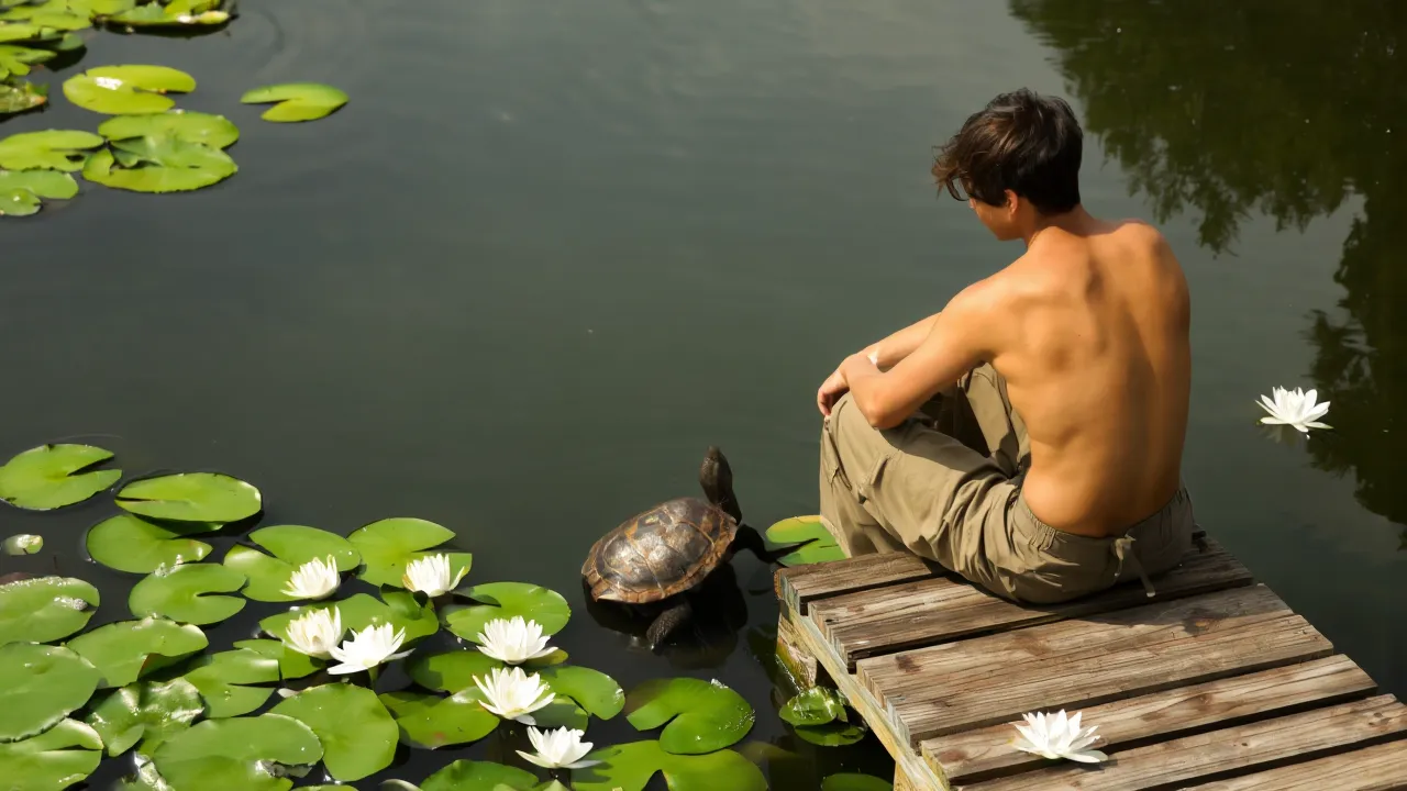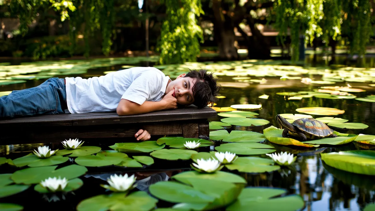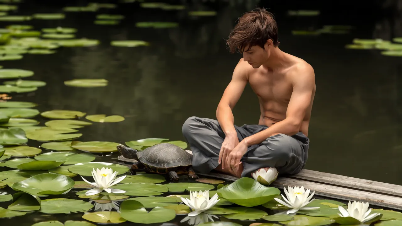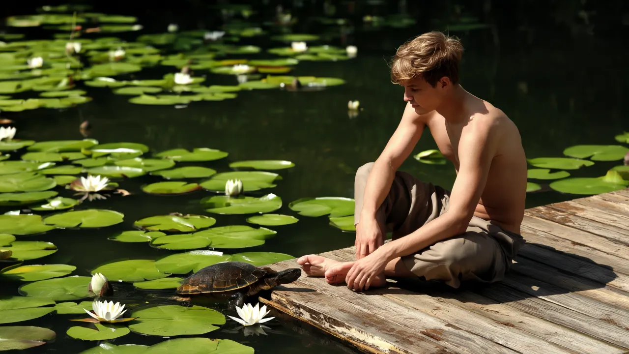 A young man lies on a wooden bridge over a serene pond, thoughtfully gazing into the water. Around him, delicate white lilies float on green lily pads. To the right, a turtle rests on a lily pad, while soft sunlight filters through the leafy trees in the background, creating a tranquil atmosphere.
