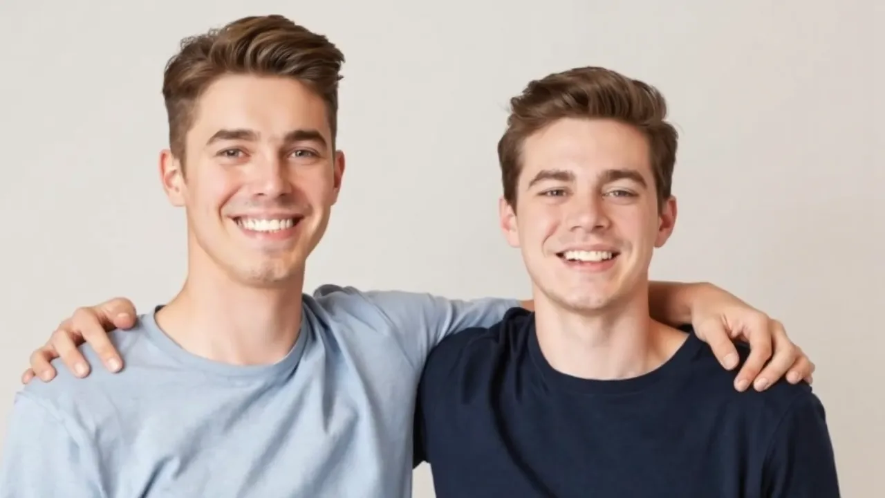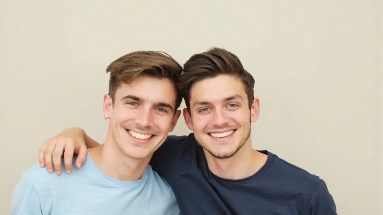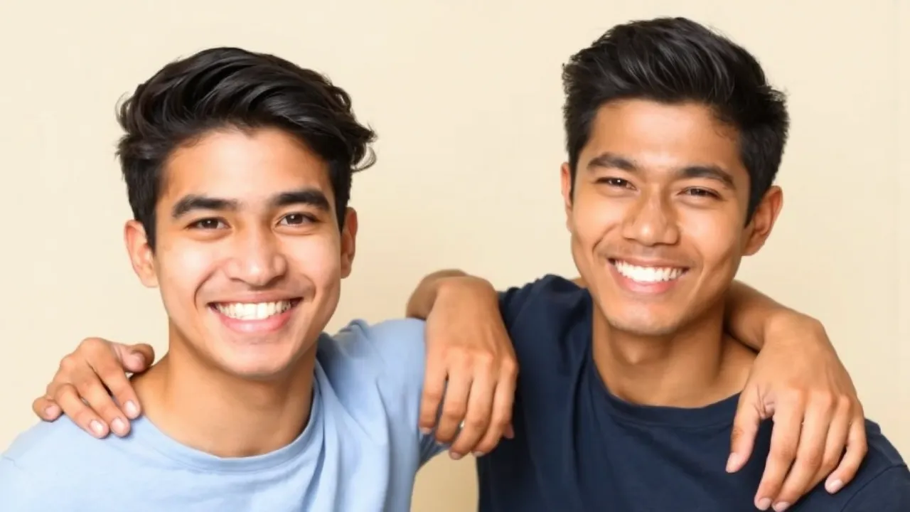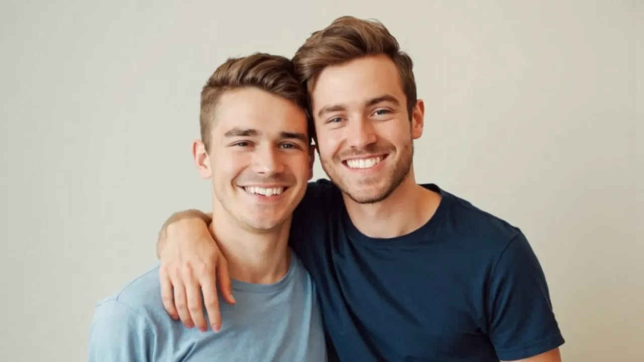 Two young men smile happily at the camera, standing close together. The man on the left is wearing a light blue T-shirt, while the one on the right is wearing a dark blue T-shirt. The background is neutral and soft, emphasizing their cheerful expressions. One man has his arm around the other’s shoulder, displaying a sense of camaraderie and happiness. Both have combed hair and exude a cheerful and friendly atmosphere.