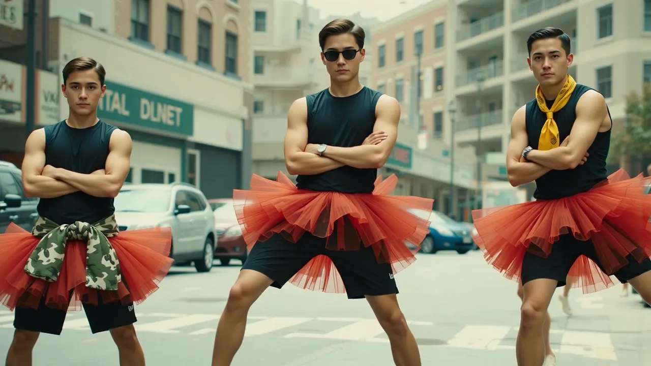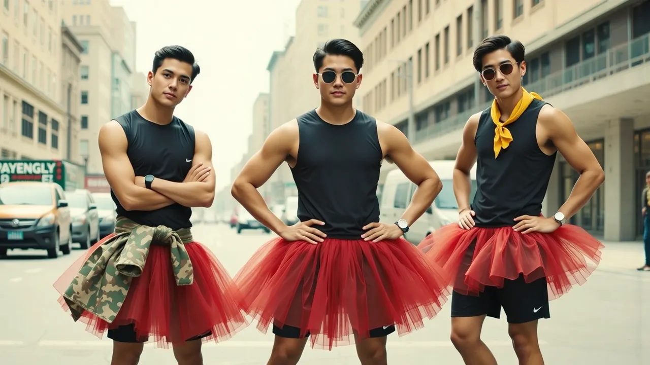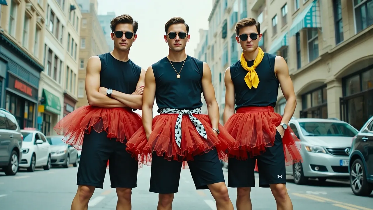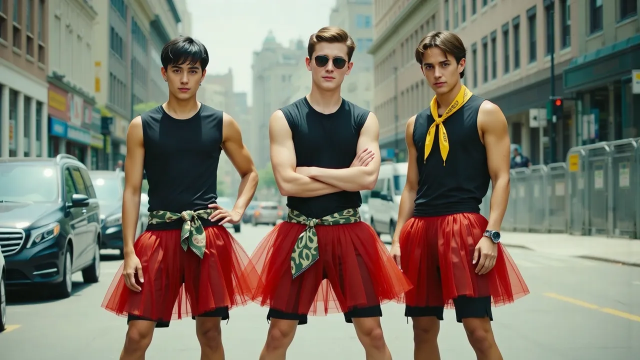 Three young men pose confidently on a city street, each wearing a black sleeveless shirt and black shorts. They sport red tulle skirts layered over their shorts, adding a playful twist to their outfits. Each has a distinct accessory: one wears a camouflage jacket tied around his waist, another has a yellow bandana and sunglasses, while the third features a yellow bandana at the neck and a watch. The background showcases an urban setting with buildings and vehicles, enhancing the dynamic and bold fashion statement.