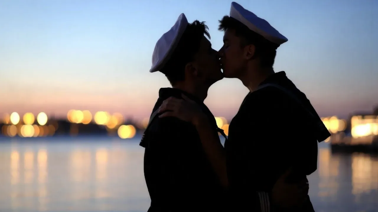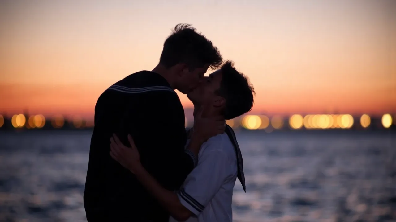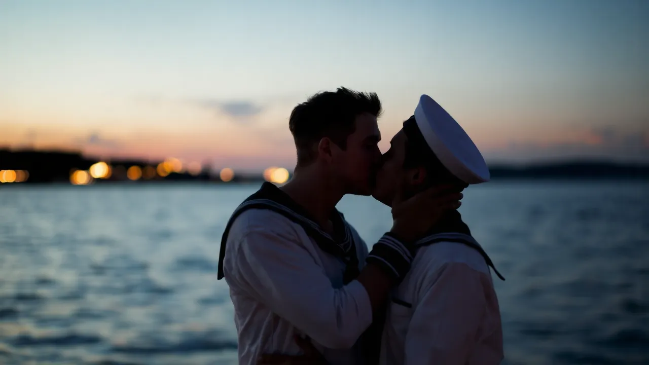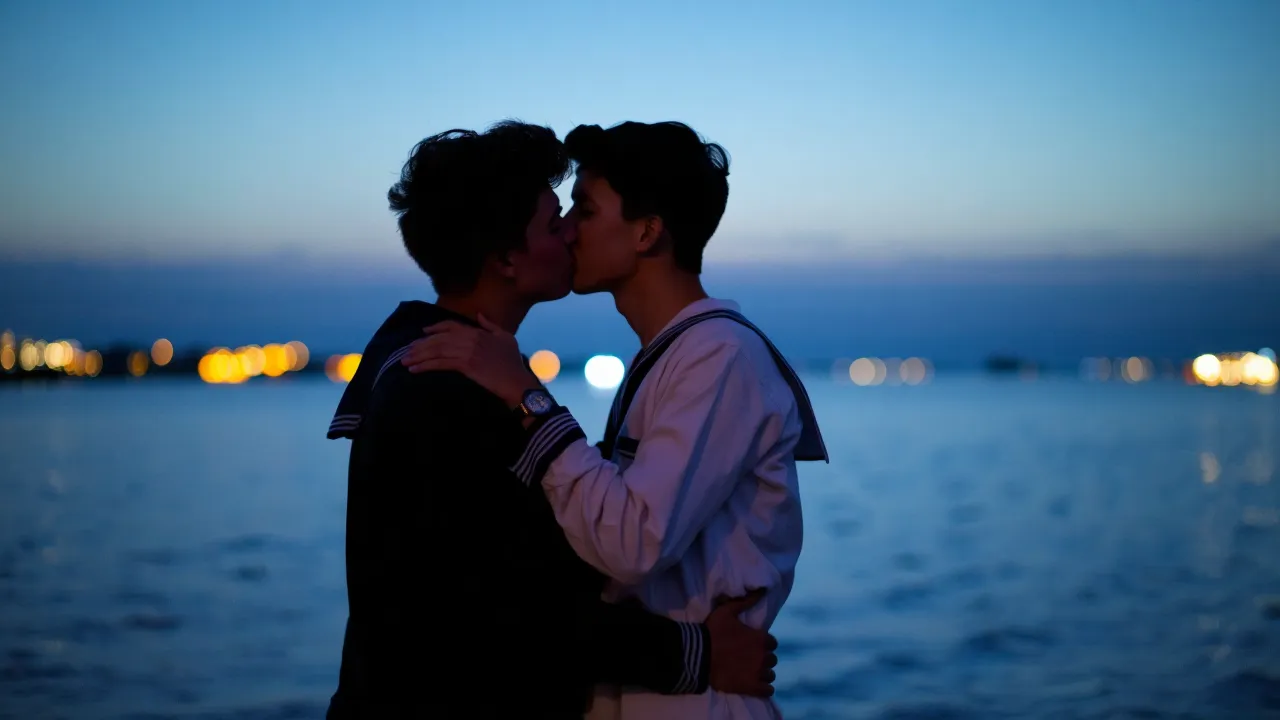 Two young men dressed in sailor uniforms kiss affectionately while standing together by the water. The background features a softly lit horizon at dusk, creating a romantic atmosphere with blurred lights reflecting on the water. Their embrace is tender, emphasizing the connection between them.