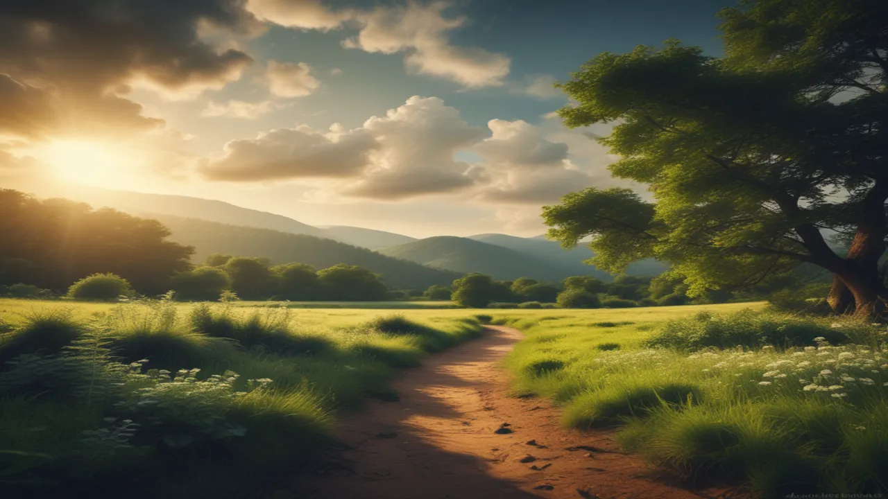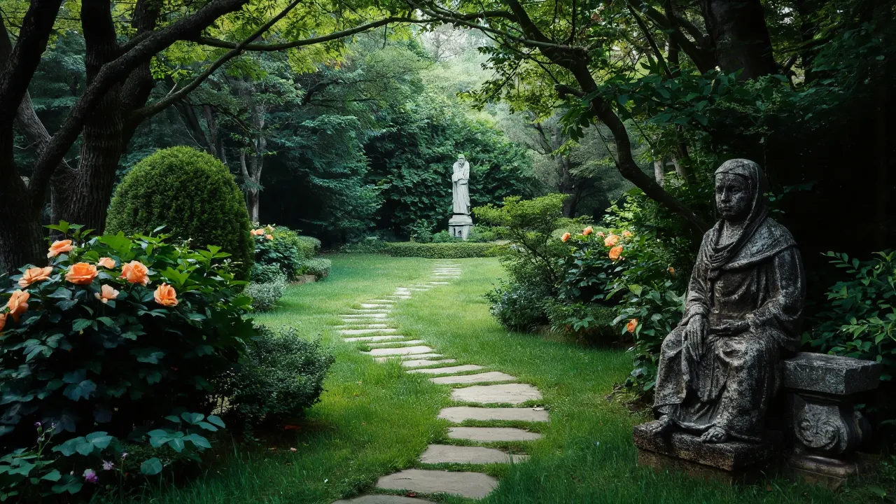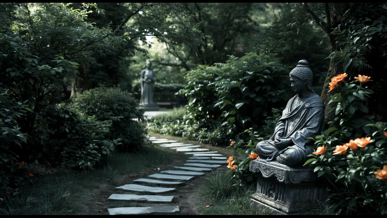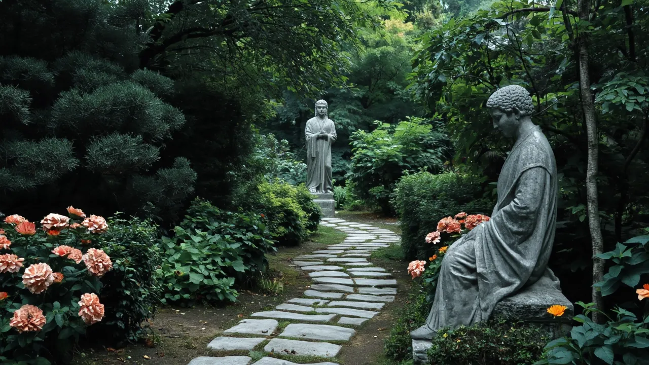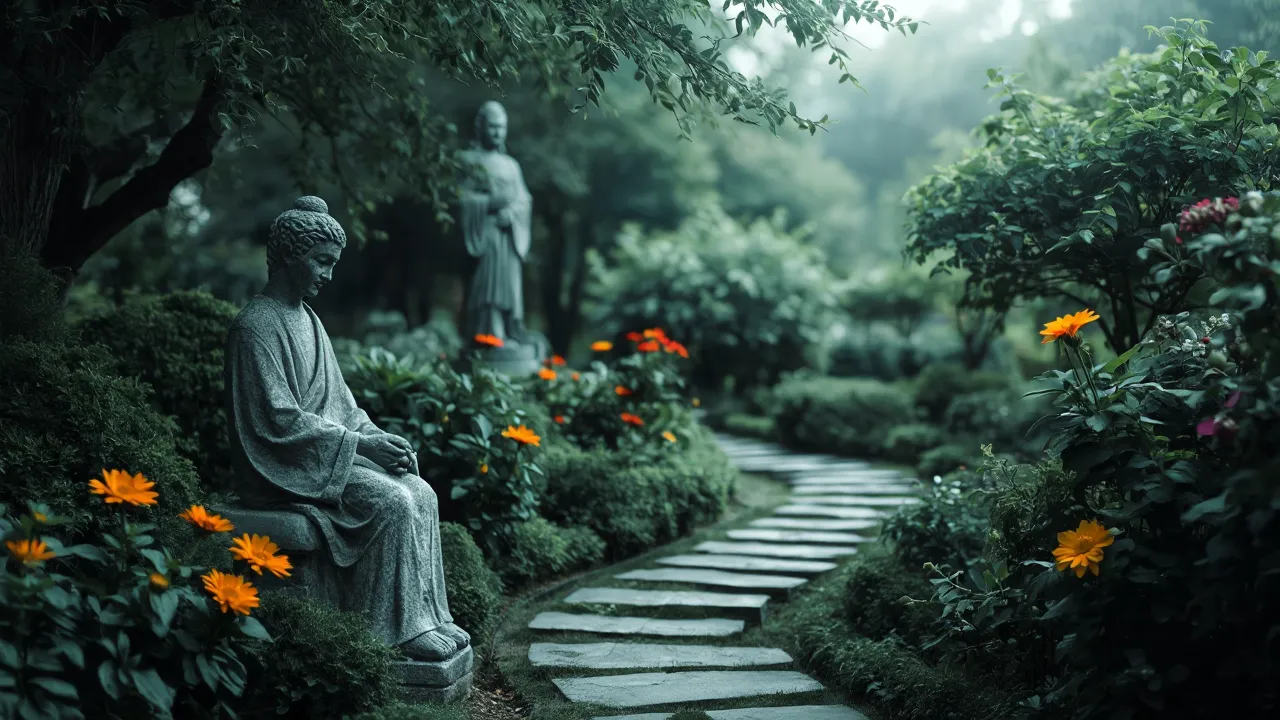 A serene garden scene featuring a stone statue of a seated figure dressed in robes, surrounded by lush greenery and blooming flowers. A winding stone path leads through the foliage toward another distant statue partially obscured by plants. Soft, muted colors with hints of blue and orange create a tranquil atmosphere, while soft light filters through the trees above.