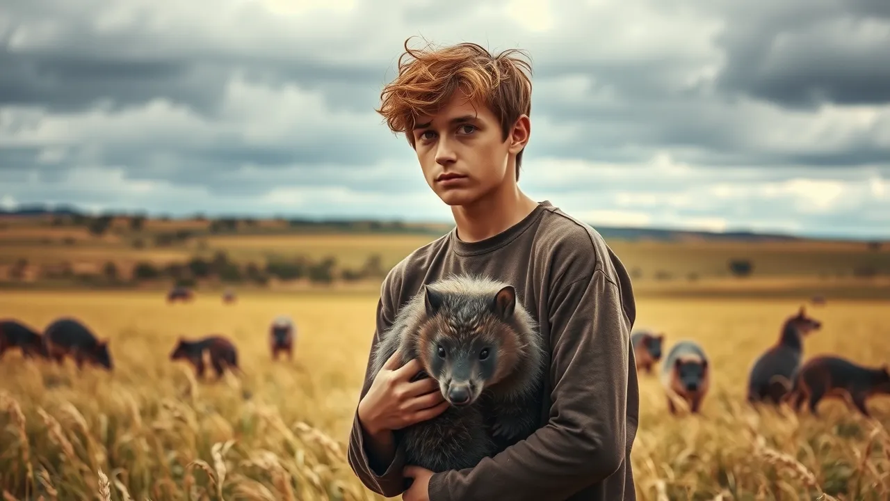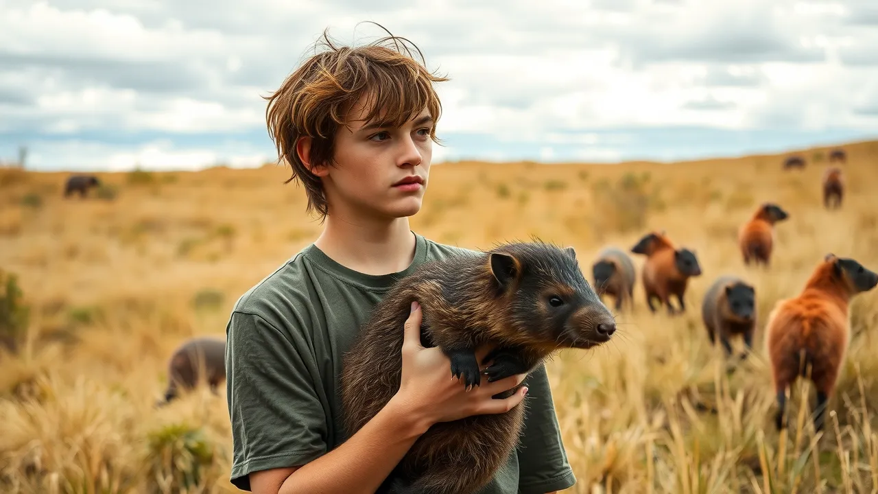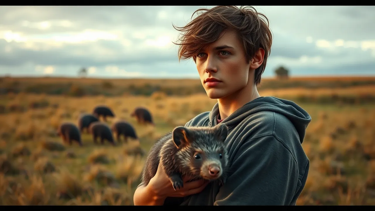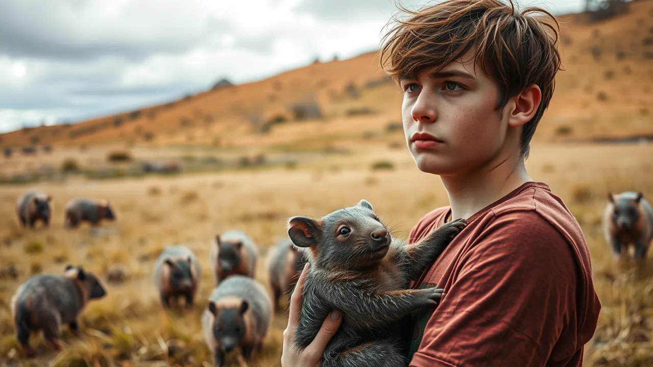 A young man with disheveled hair stands in a grassy field, holding a wombat close up. He has a serious expression, staring into the distance. Several wombats are visible in the background, surrounded by a warm, muted landscape under a cloudy sky. The scene conveys a sense of connection with nature, highlighting the young man’s bond with the wombat.
