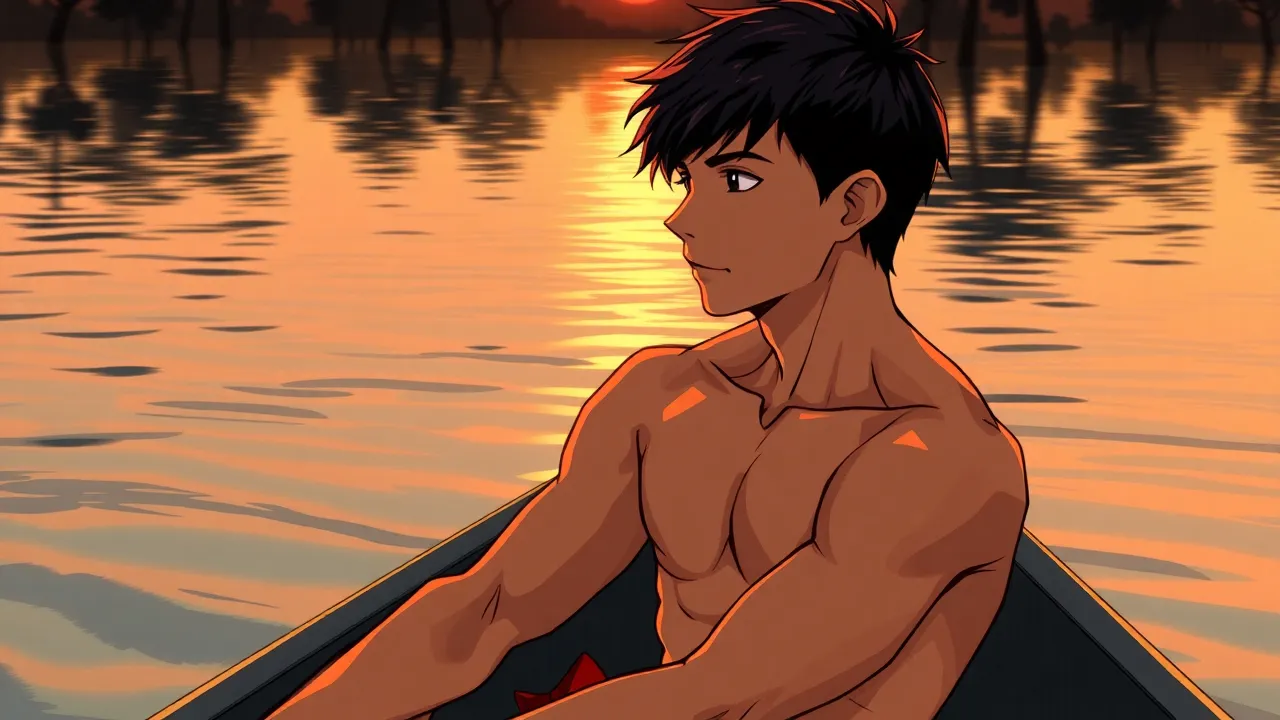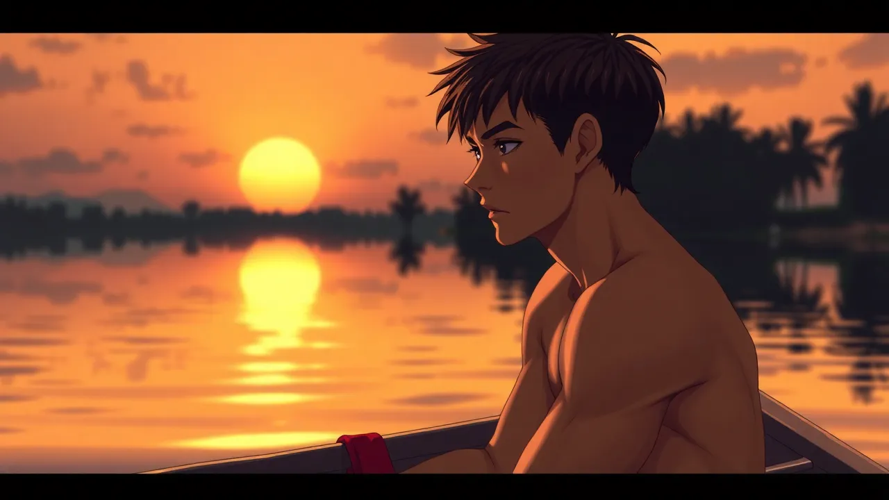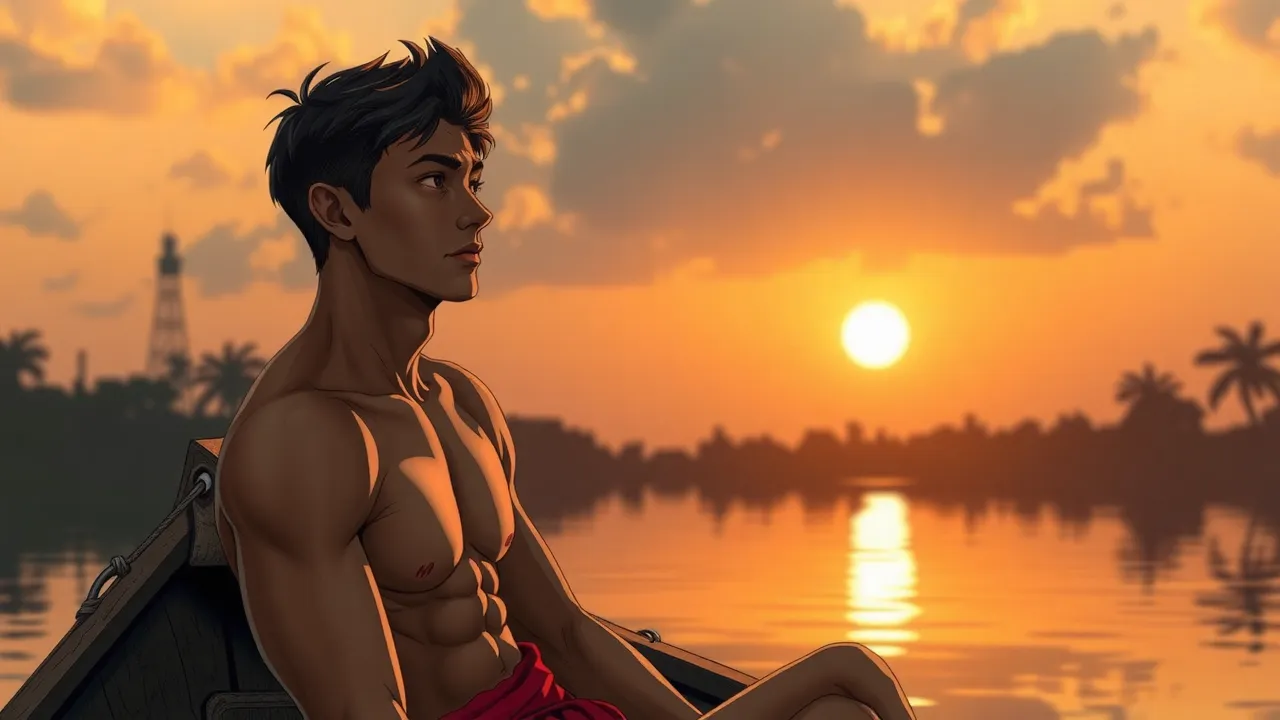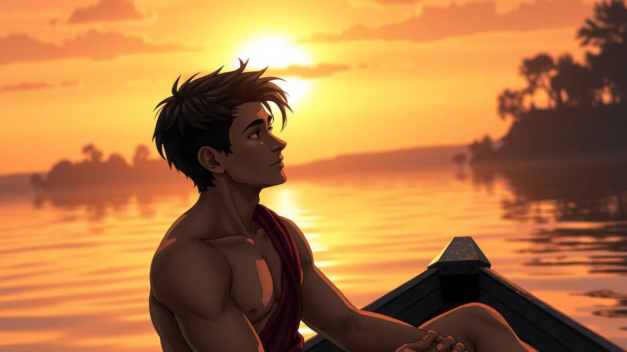 A young man sits in a boat, staring thoughtfully into the distance. He has short, dark hair, is shirtless, and sports muscular arms with a red cloth around his waist. The background features a serene surface of water reflecting the warm tones of a sunset, along with silhouettes of trees.