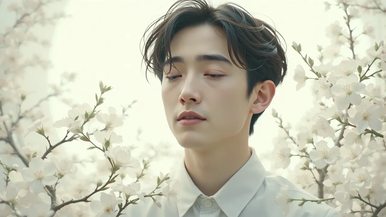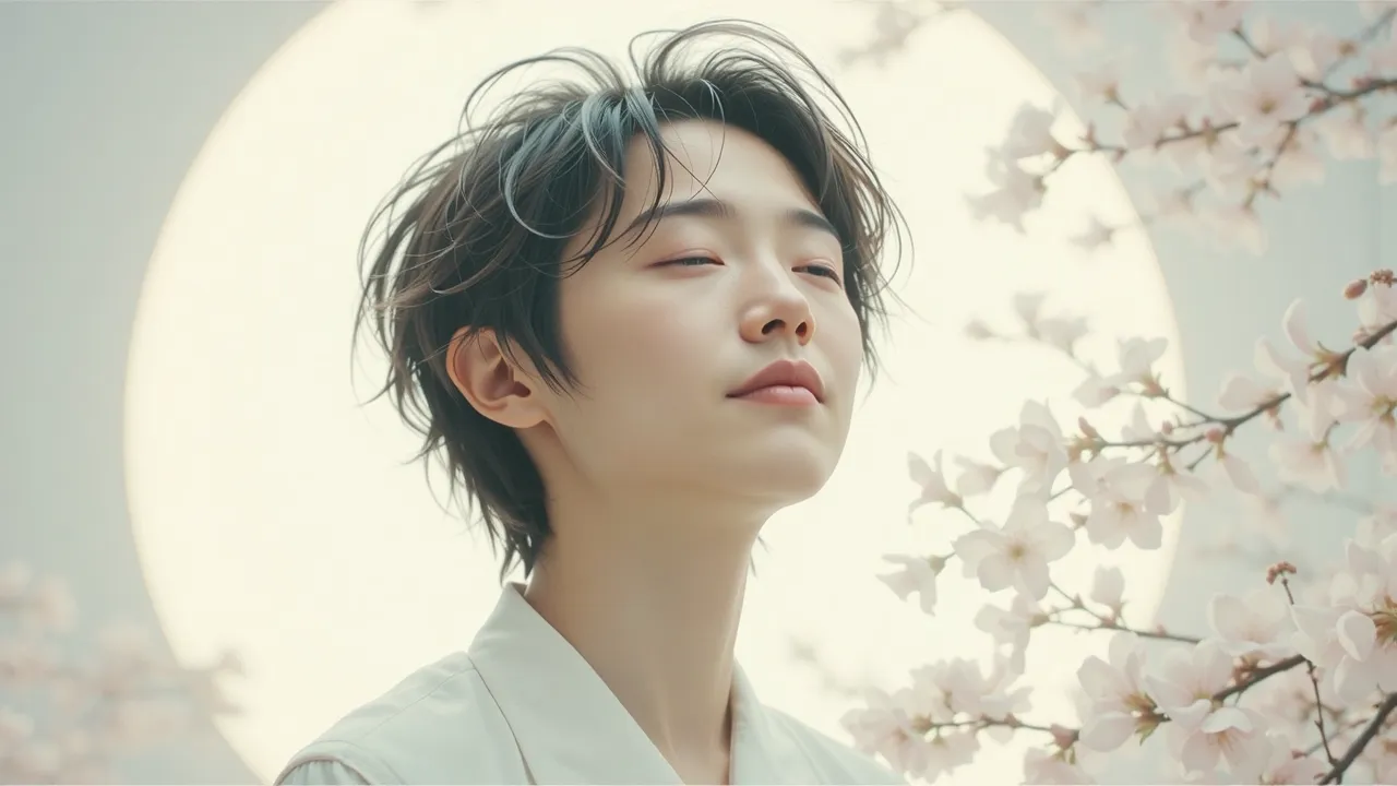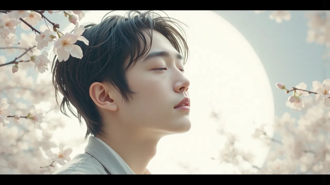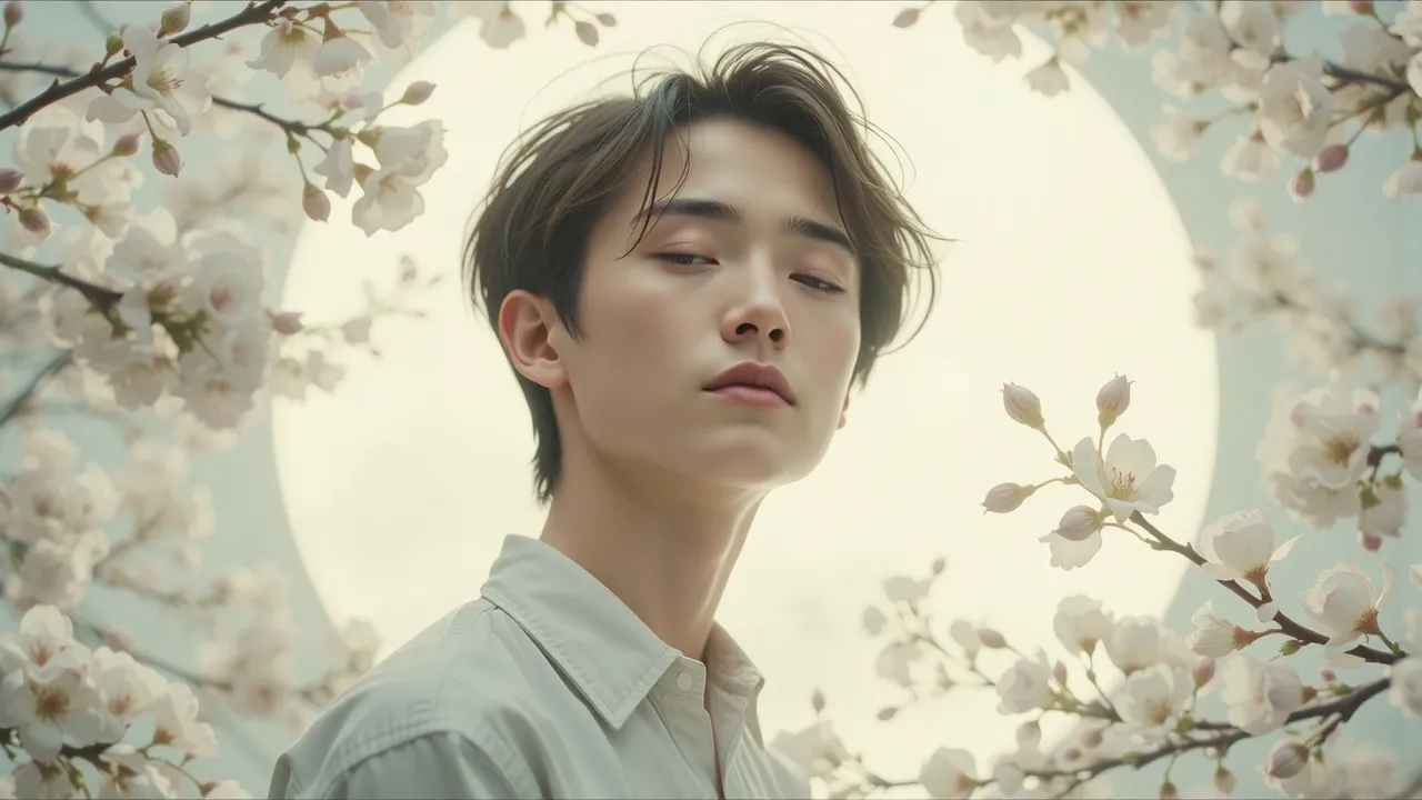 A serene portrait of a young man with his eyes closed, presented against a soft, circular background resembling a glowing moon. His angular face and tousled hair blend harmoniously with the delicate, light-colored cherry blossoms surrounding him, creating a dreamy, ethereal atmosphere. The artwork employs a palette of soft grays, whites, and pastels, enhancing the sense of tranquility.