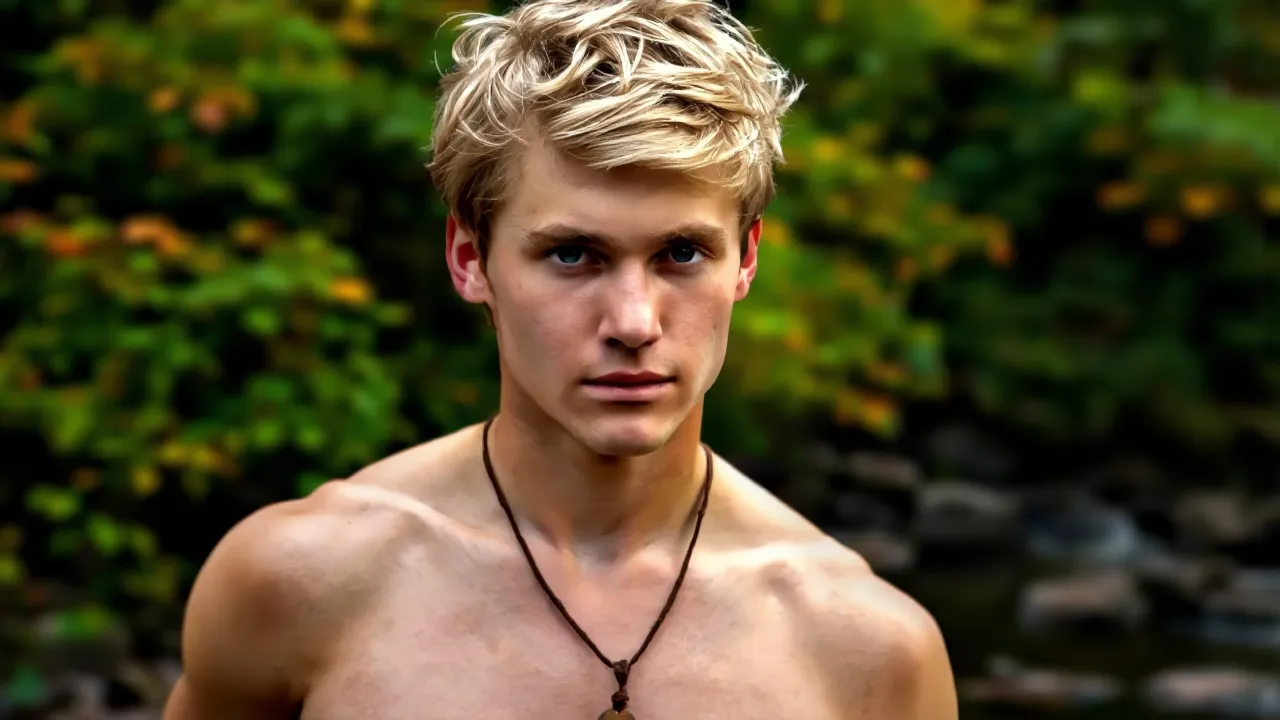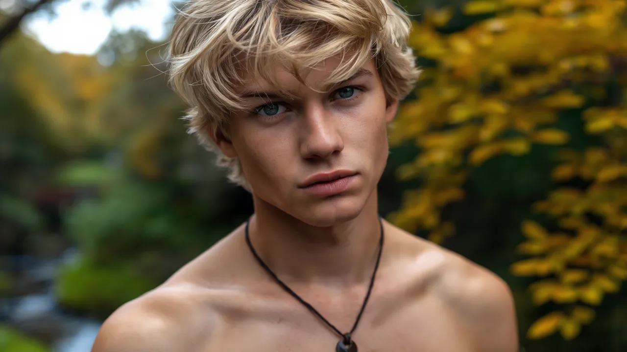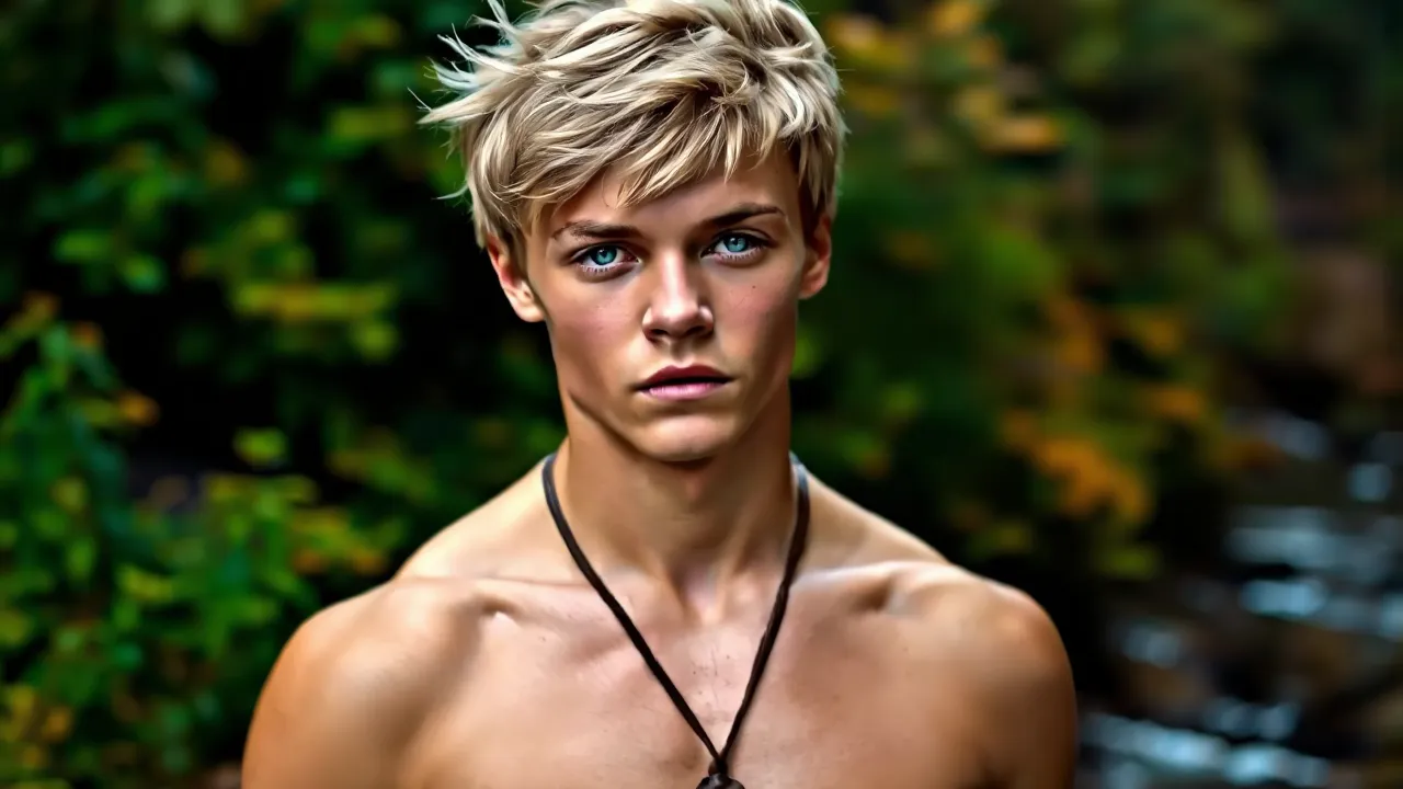 A young man with tousled blond hair goes shirtless and displays a muscular physique. He has striking blue-green eyes and a contemplative expression. Around his neck is a simple brown leather necklace with a pendant. The background features a lush, natural setting with vibrant green foliage and pops of autumn colors, suggesting a serene outdoor environment near a stream.