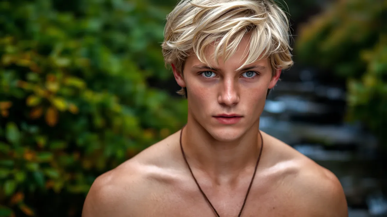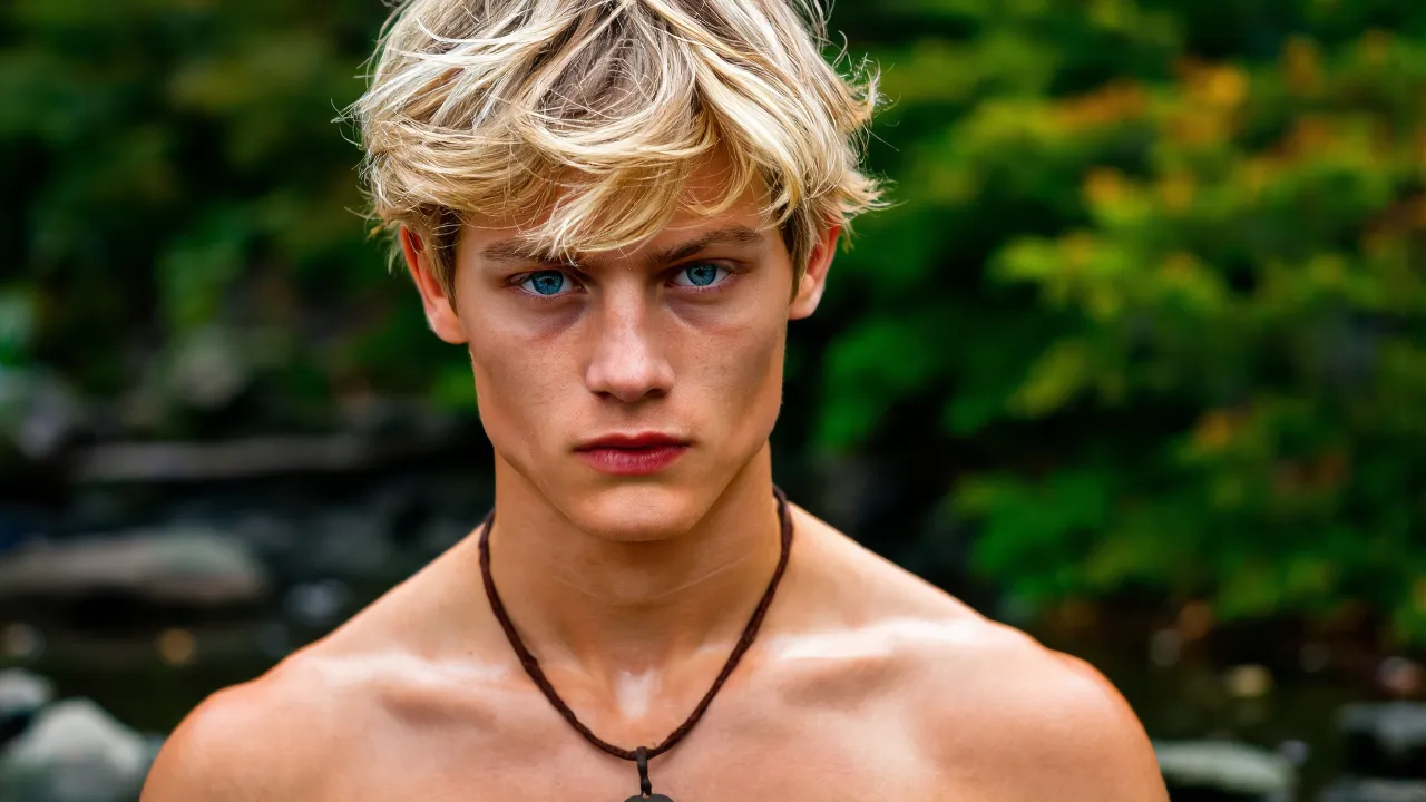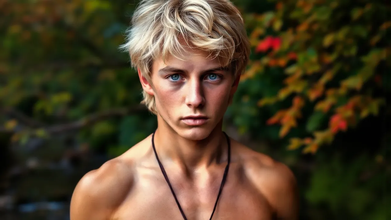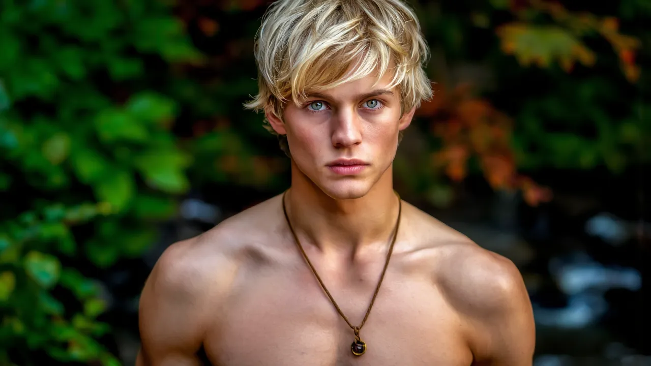 A young man with tousled blond hair goes shirtless and displays a muscular physique. He has striking blue-green eyes and a contemplative expression. Around his neck is a simple brown leather necklace with a pendant. The background features a lush, natural setting with vibrant green foliage and pops of autumn colors, suggesting a serene outdoor environment near a stream.