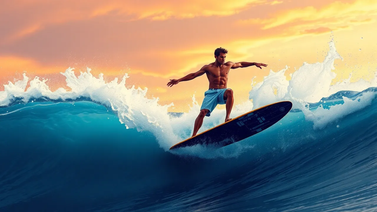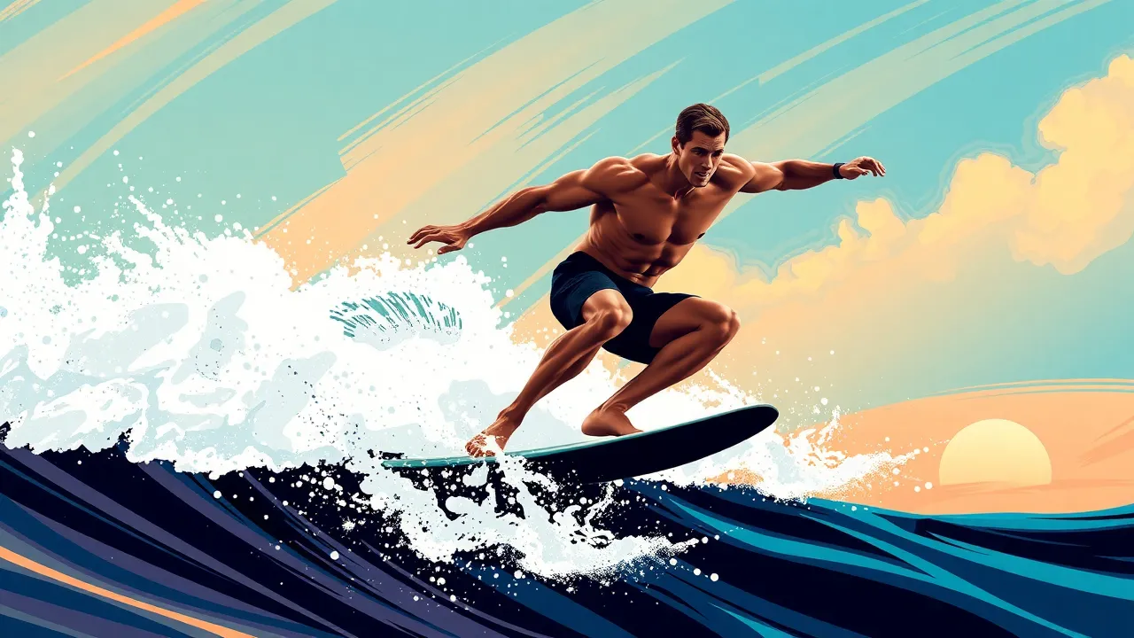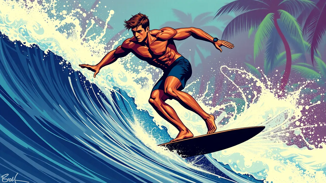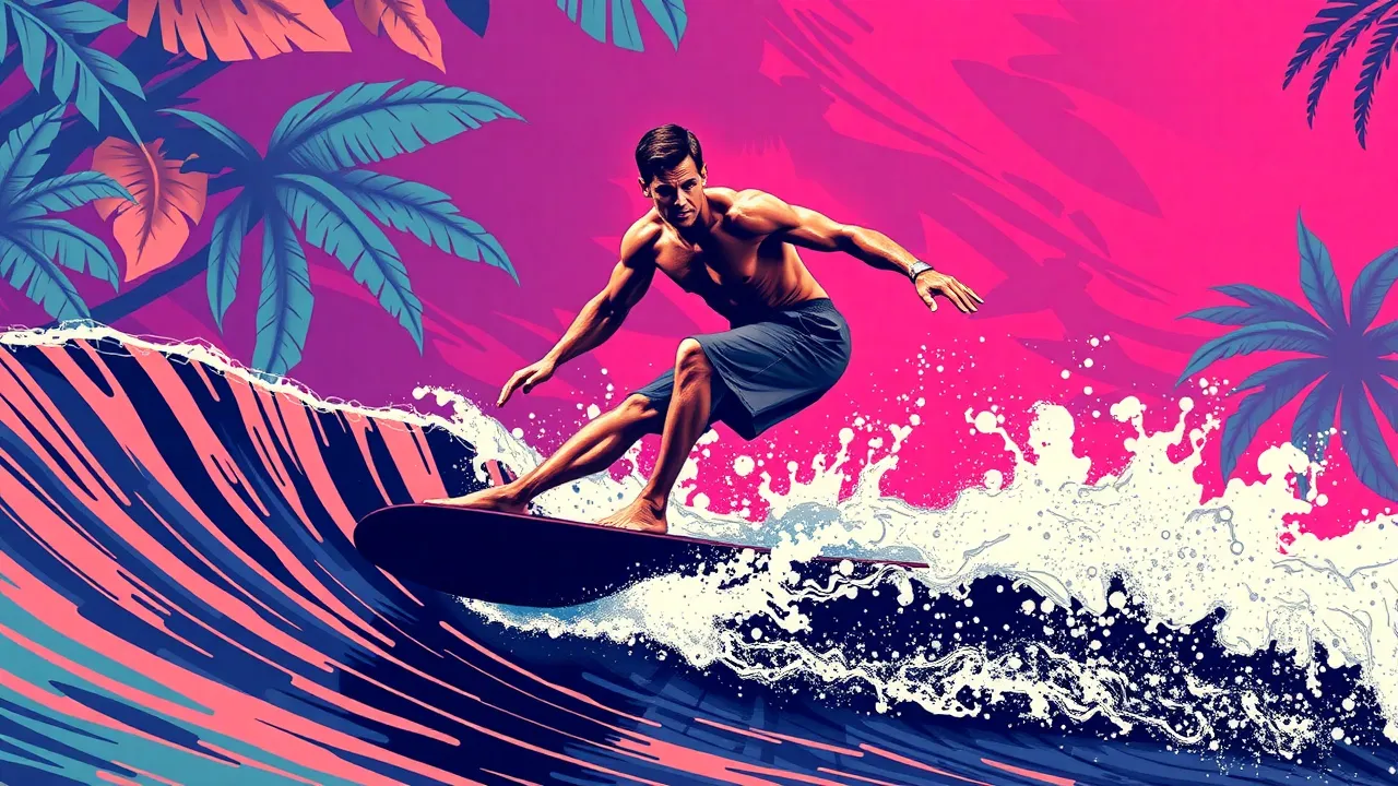 A muscular male surfer riding a wave, with dynamic lines and water splashes. The surfer is shown in motion, balancing on a dark surfboard, against a background of vibrant tropical hues that create a sense of energy and movement.