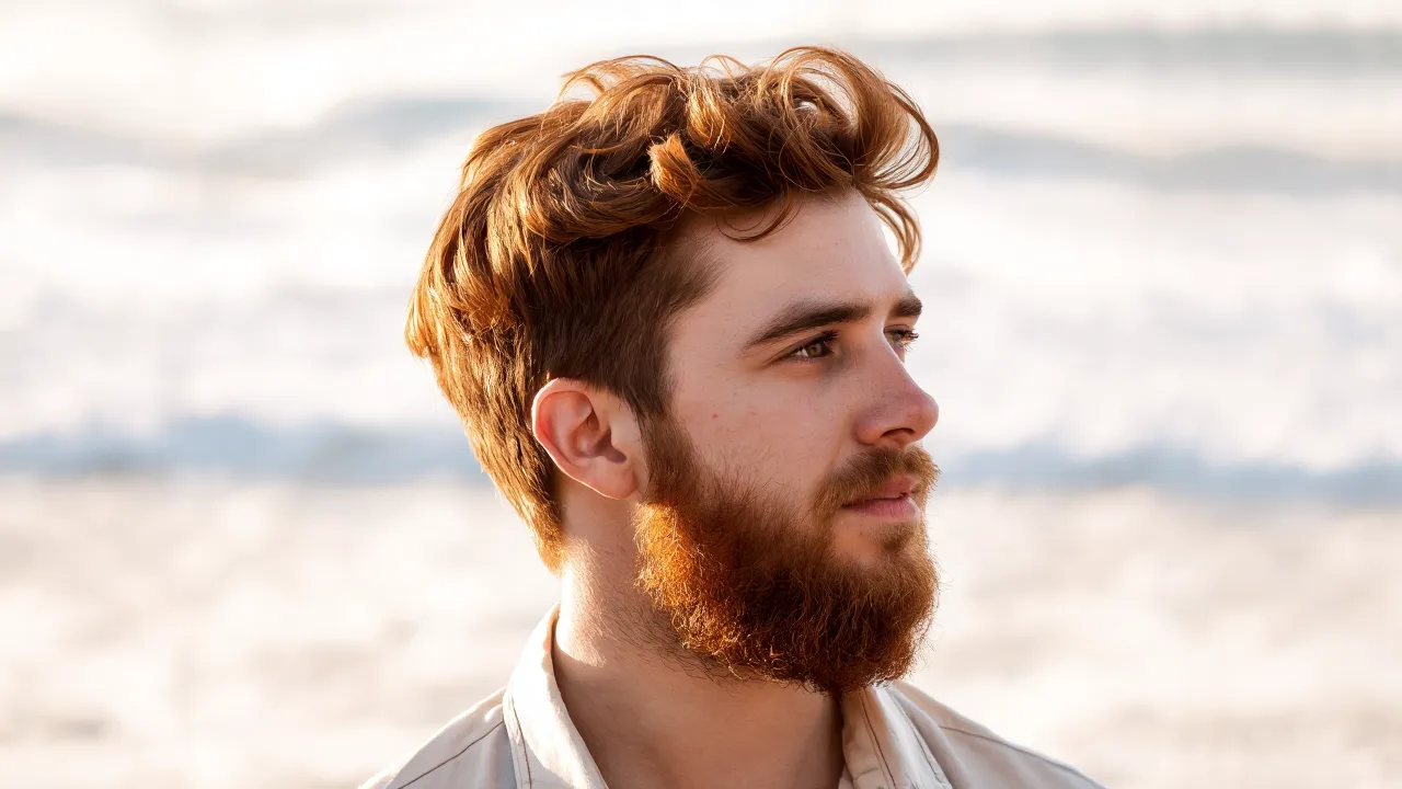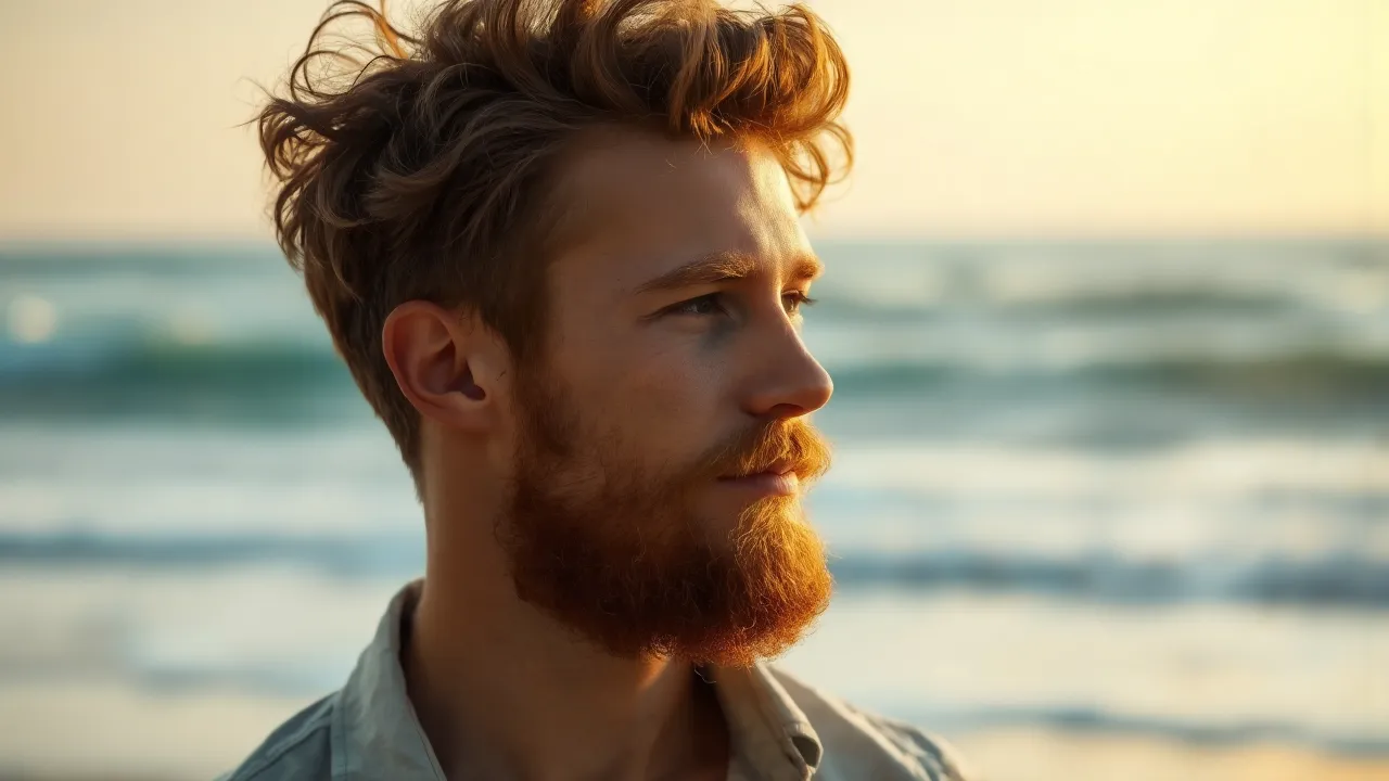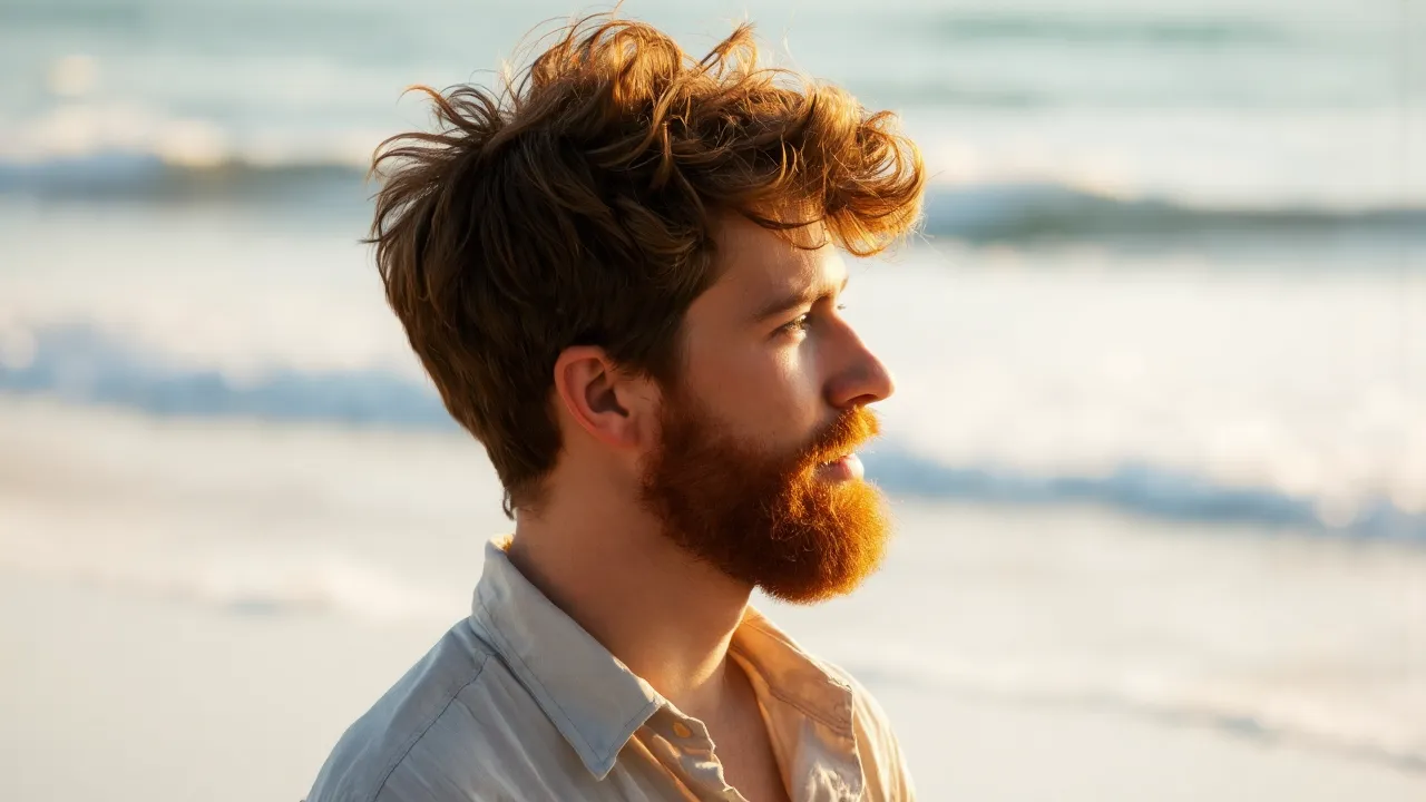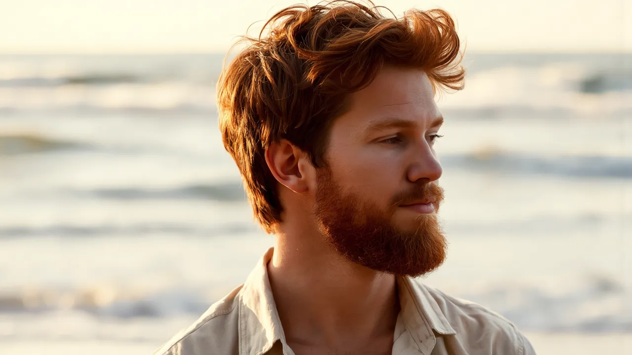 A young man with tousled, curly hair and a well-groomed red beard stands profile against a soft beach backdrop. He wears a light, open-collared shirt, and his expression is serene, suggesting contentment as he gazes off into the distance. The warm sunlight illuminates his face, enhancing the peaceful ambiance of the ocean waves behind him.