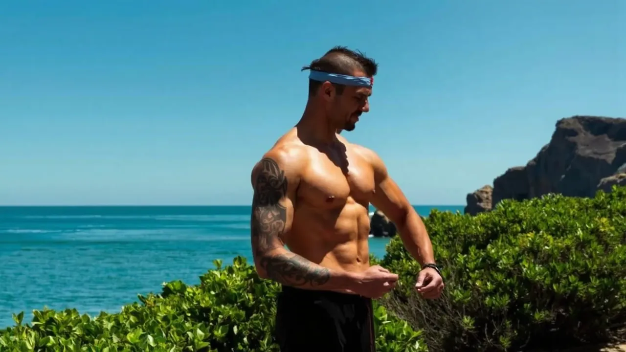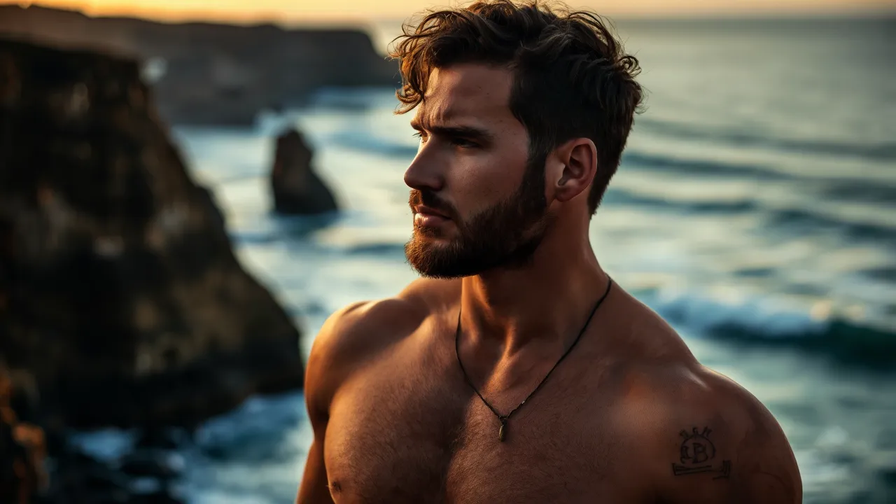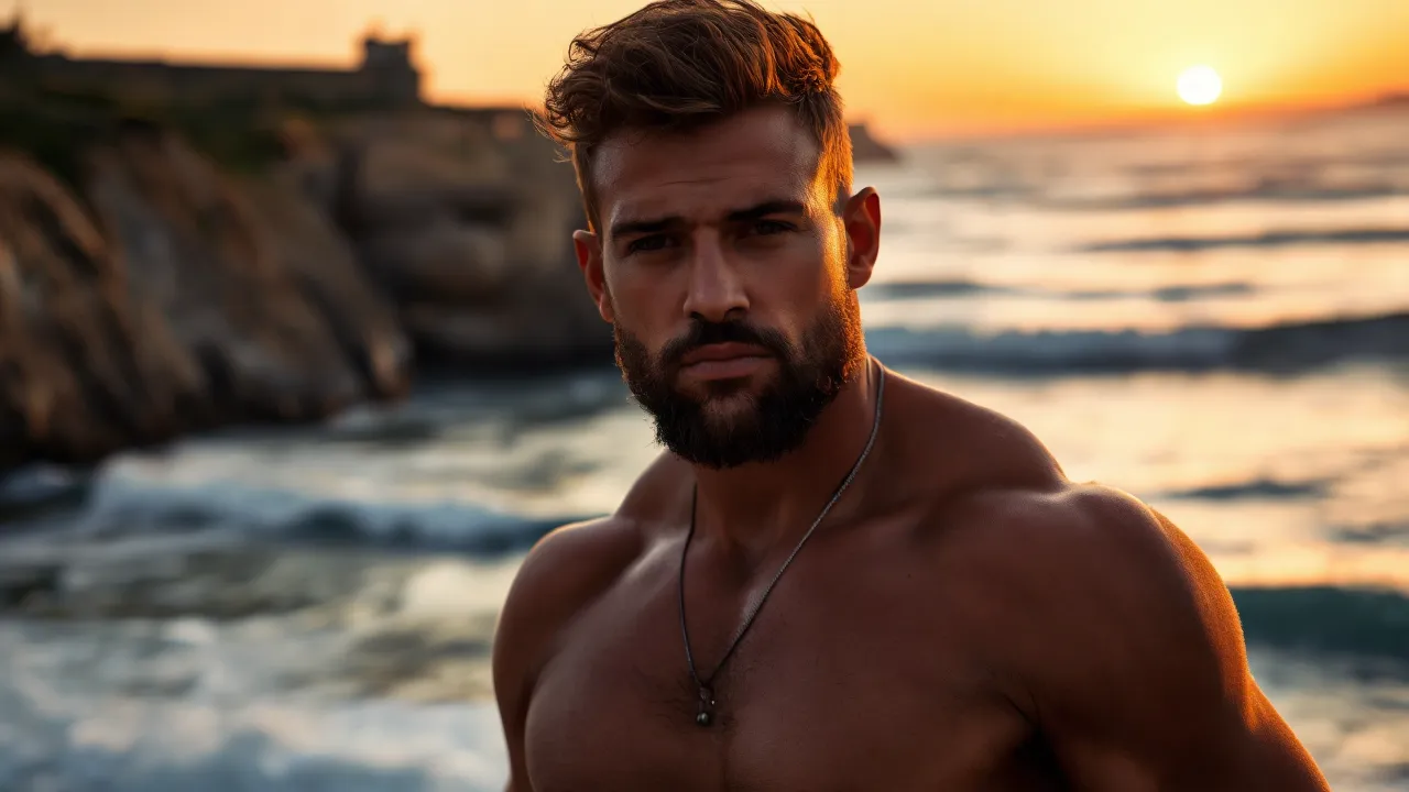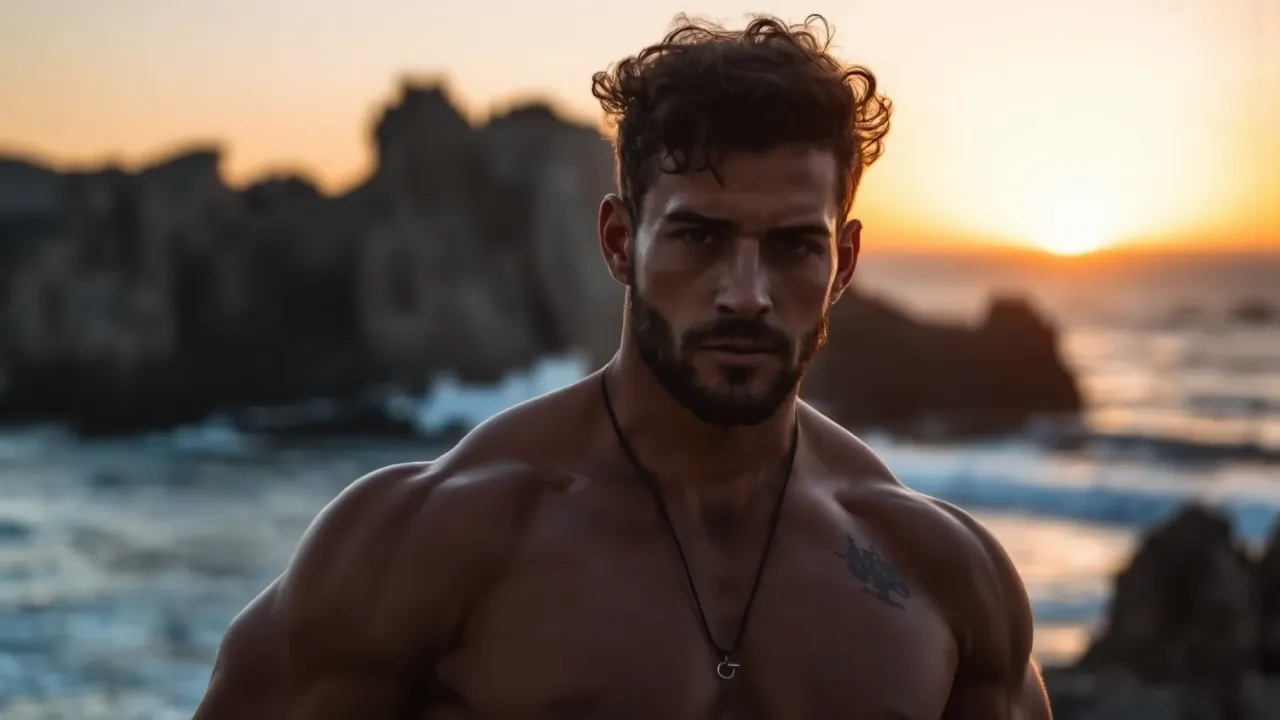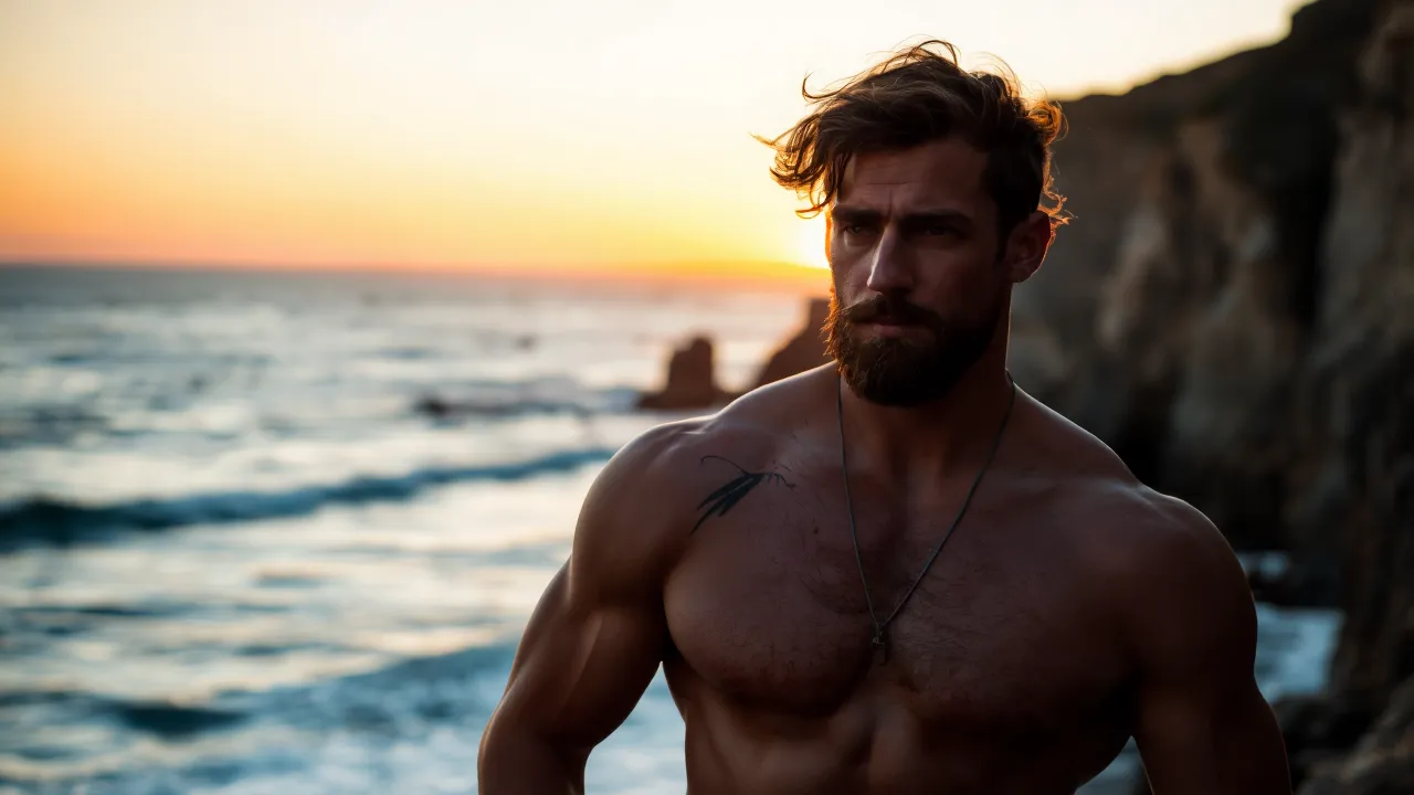A muscular man with curly hair and a short beard stands by the ocean at sunset. He has a prominent tattoo on his shoulder and wears a simple necklace. The background features rugged cliffs and waves gently crashing against the shore, illuminated by the warm tones of the setting sun. The scene conveys a sense of strength and tranquility.