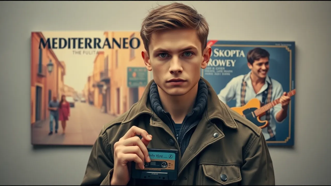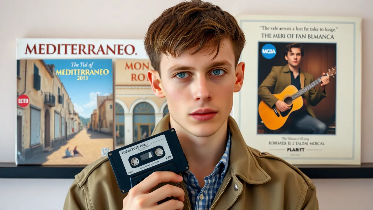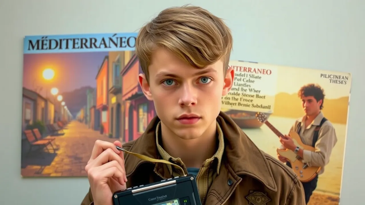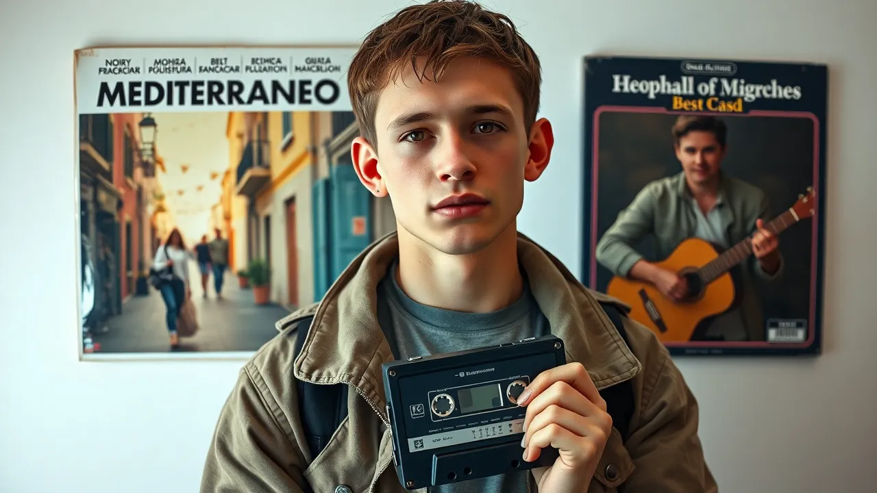 A young man with short hair, wearing a sturdy jacket and holding a cassette player. Behind him are two album covers: one titled MEDITERRANEO with a sunlit street scene, and the other featuring a man with a guitar. The overall color palette includes soft pastels and muted tones, creating a nostalgic atmosphere.