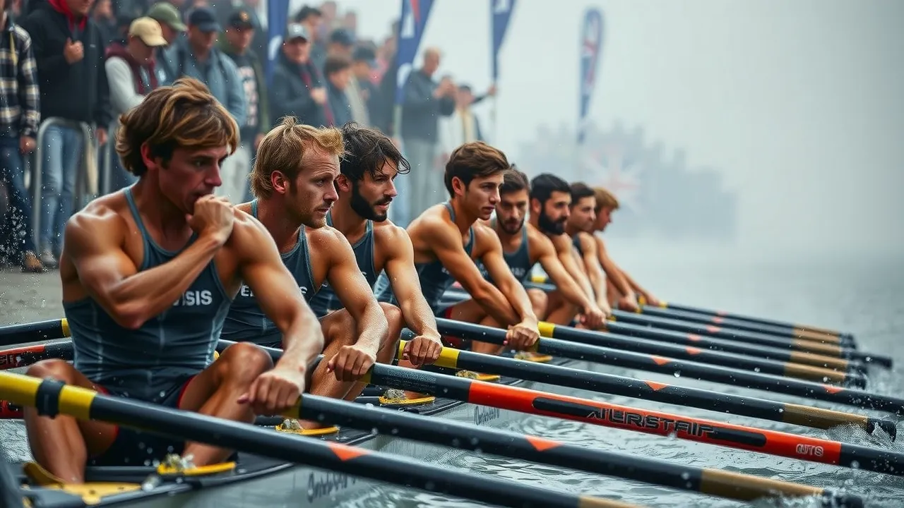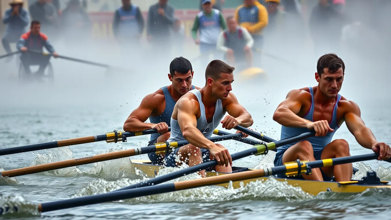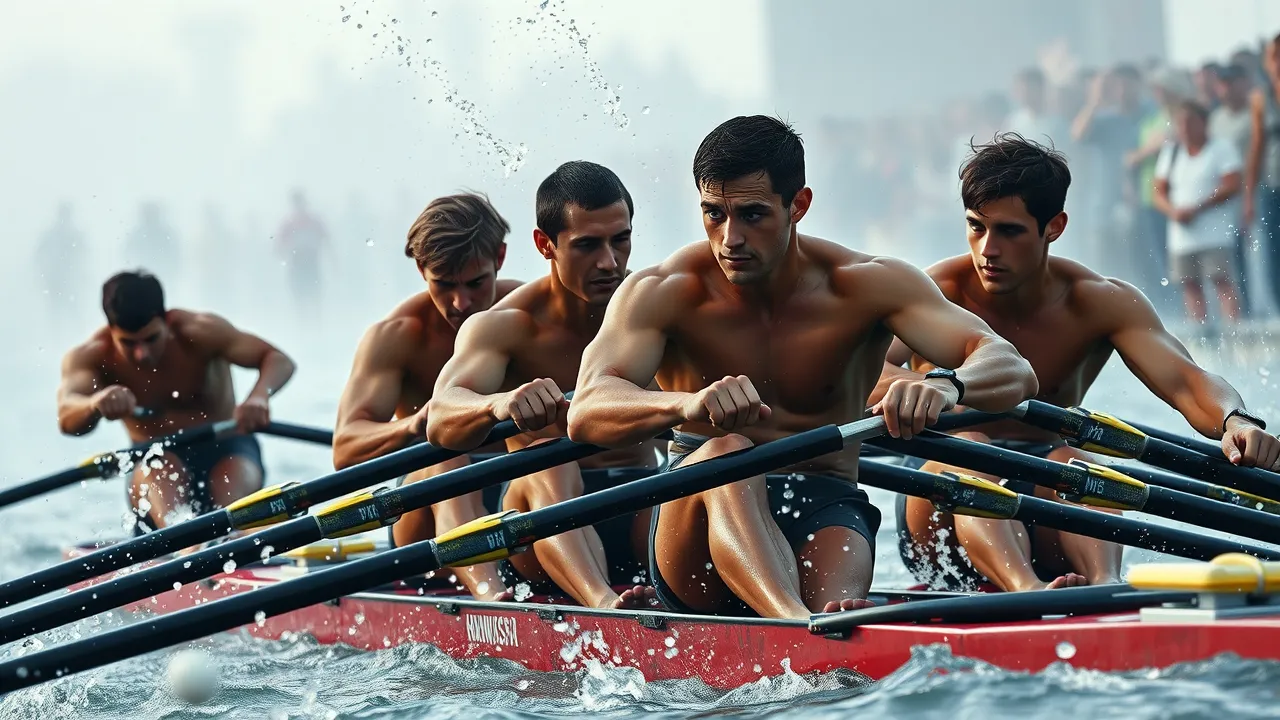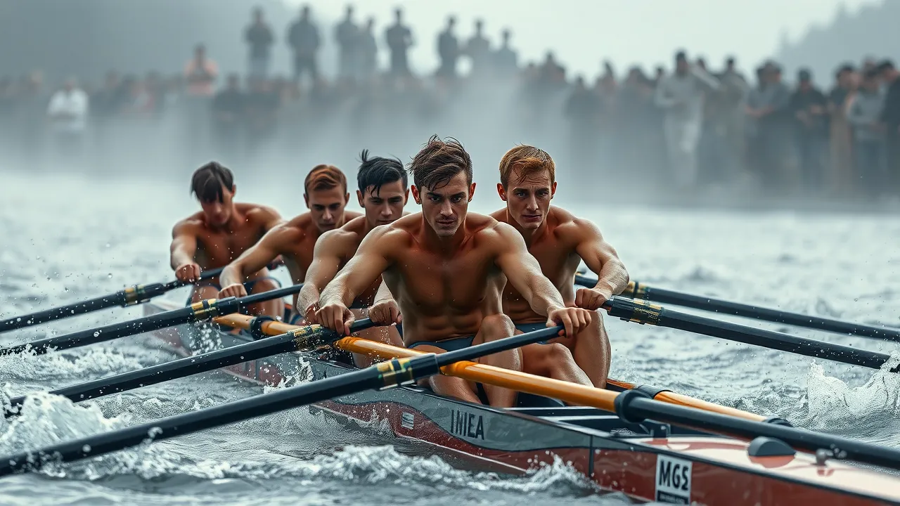 A group of muscular rowers, focused and in sync, powerfully stroke their oars in the water. The scene conveys intensity and determination, with splashes of water around them. In the background, a crowd of onlookers is silhouetted against a misty atmosphere, enhancing the dramatic tension of the rowing competition.