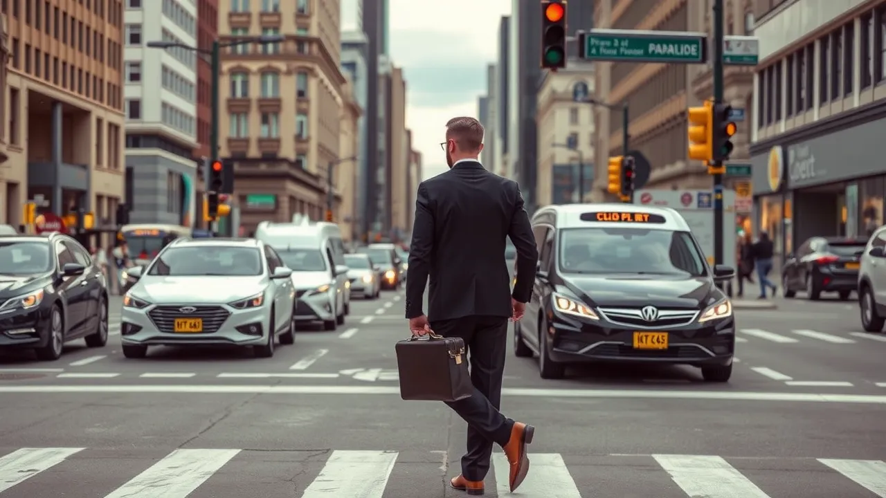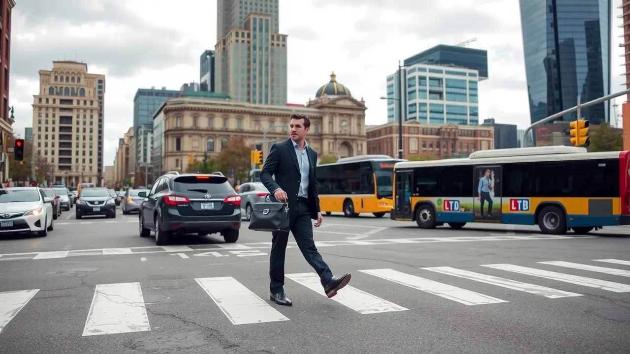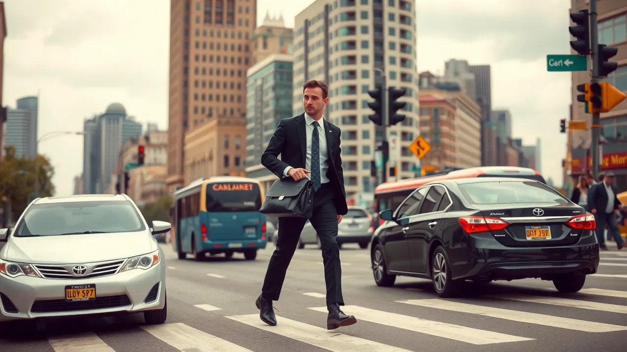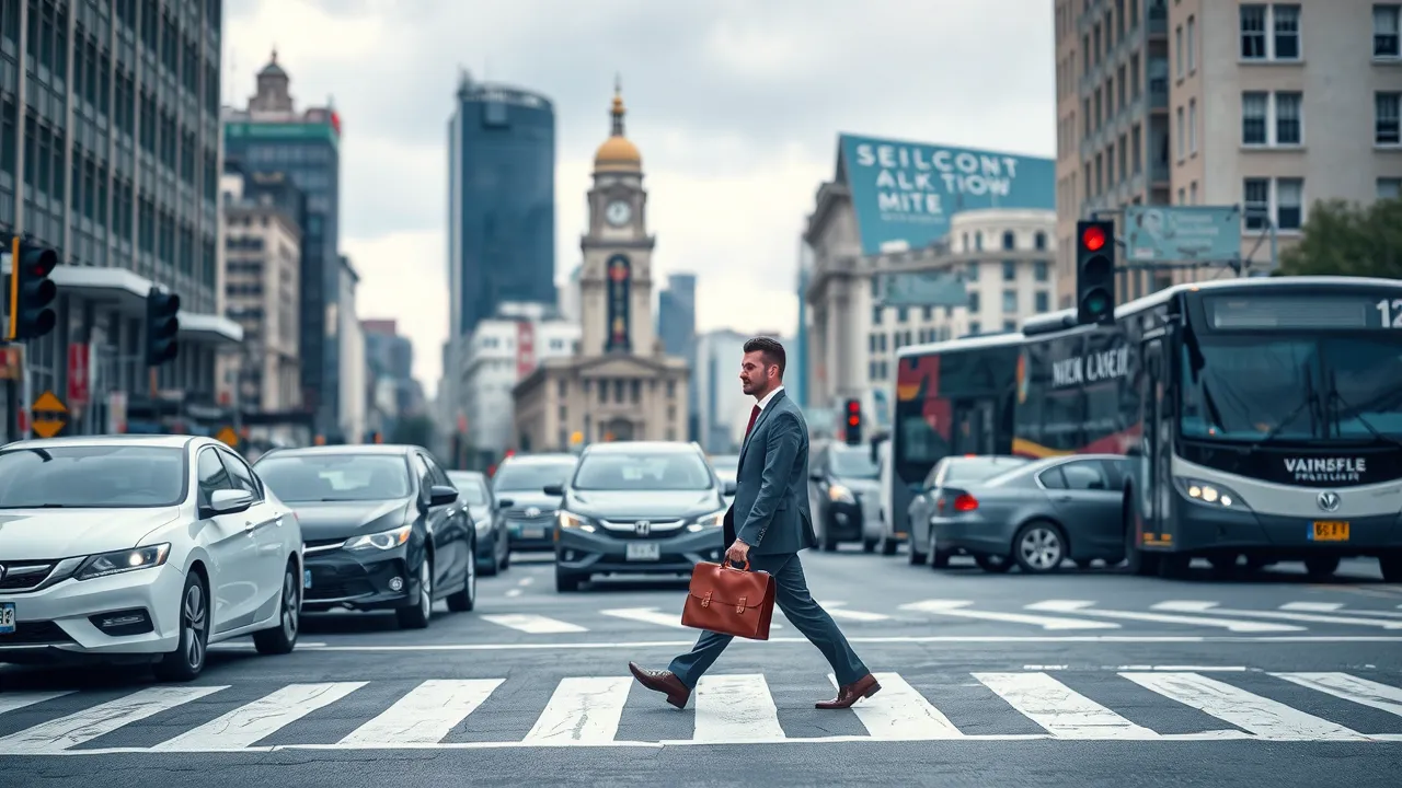 A busy urban street scene depicts a man in a suit crossing a pedestrian crossing with a briefcase. Surrounding him are several cars and a bus, against a backdrop of blurred city buildings under a gray sky. Traffic lights and pedestrian figures are visible, adding to the bustling atmosphere.