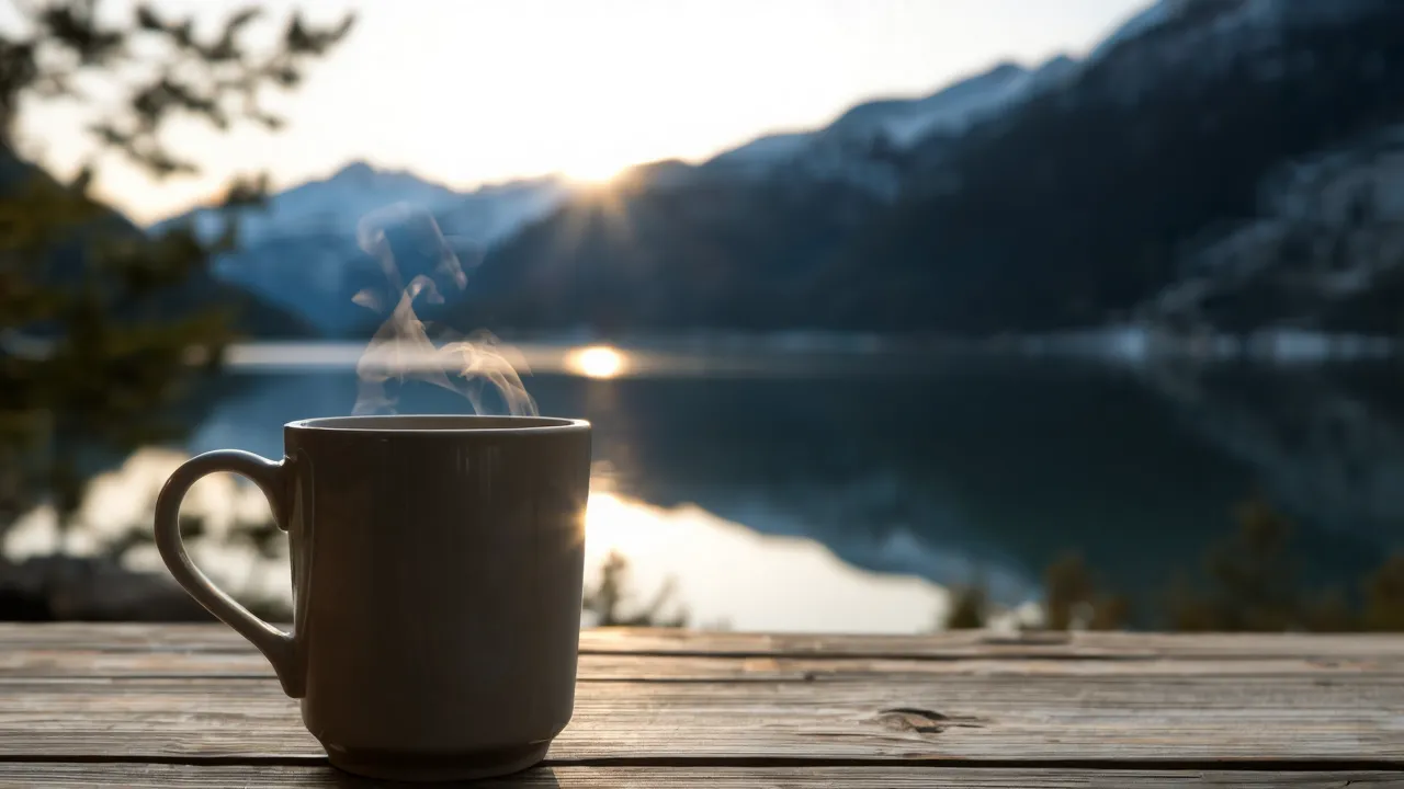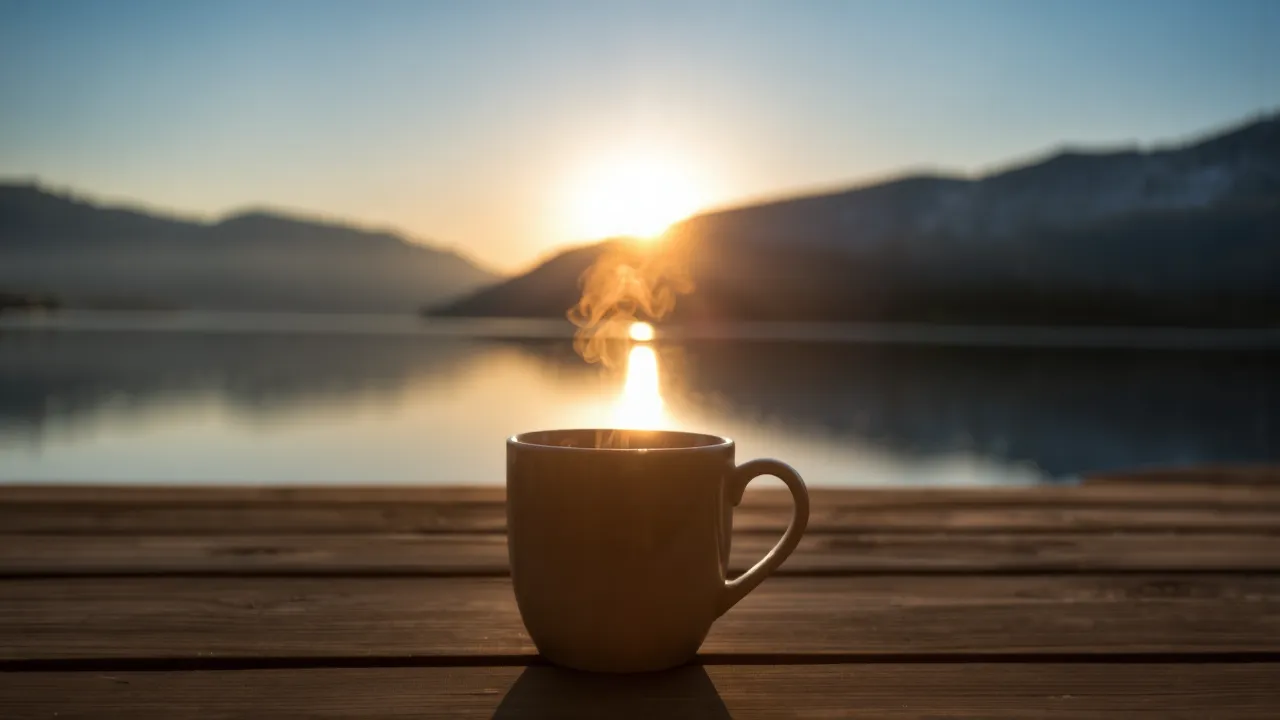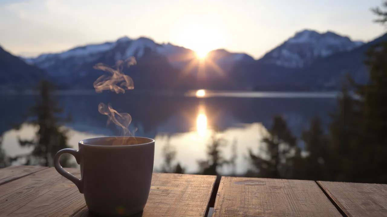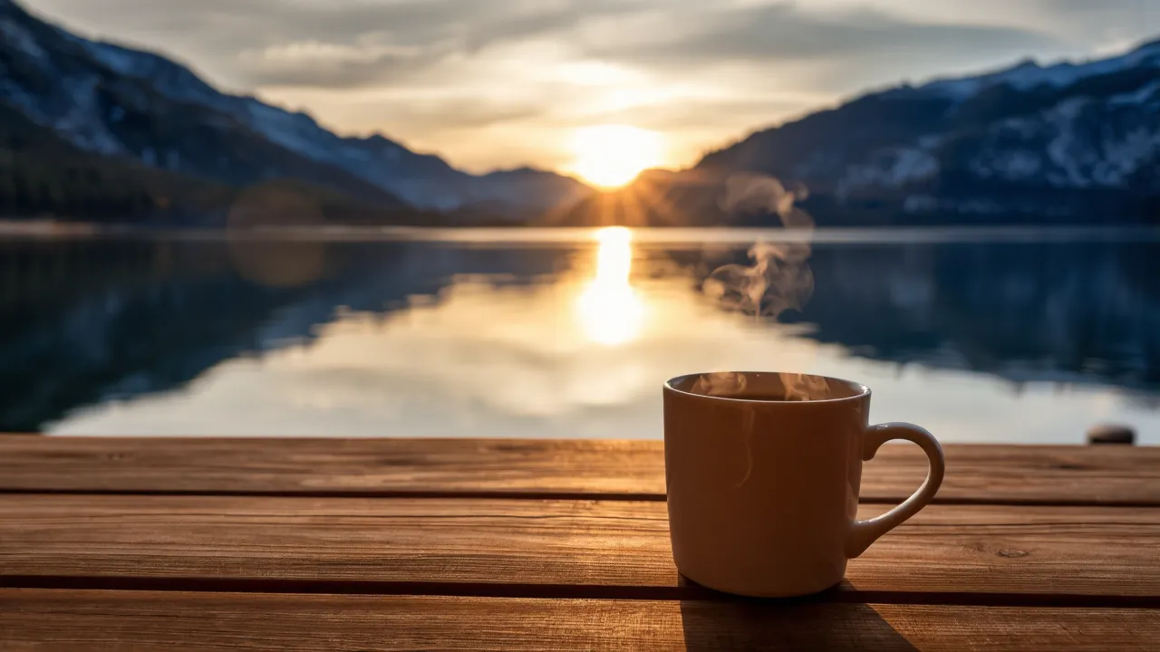 A steaming cup of coffee sits on a wooden table in the foreground, with a serene lake and snow-capped mountains in the background. The sun rises over the horizon, casting a warm glow over the water’s surface, creating a peaceful atmosphere. The scene captures the essence of morning tranquility in nature.