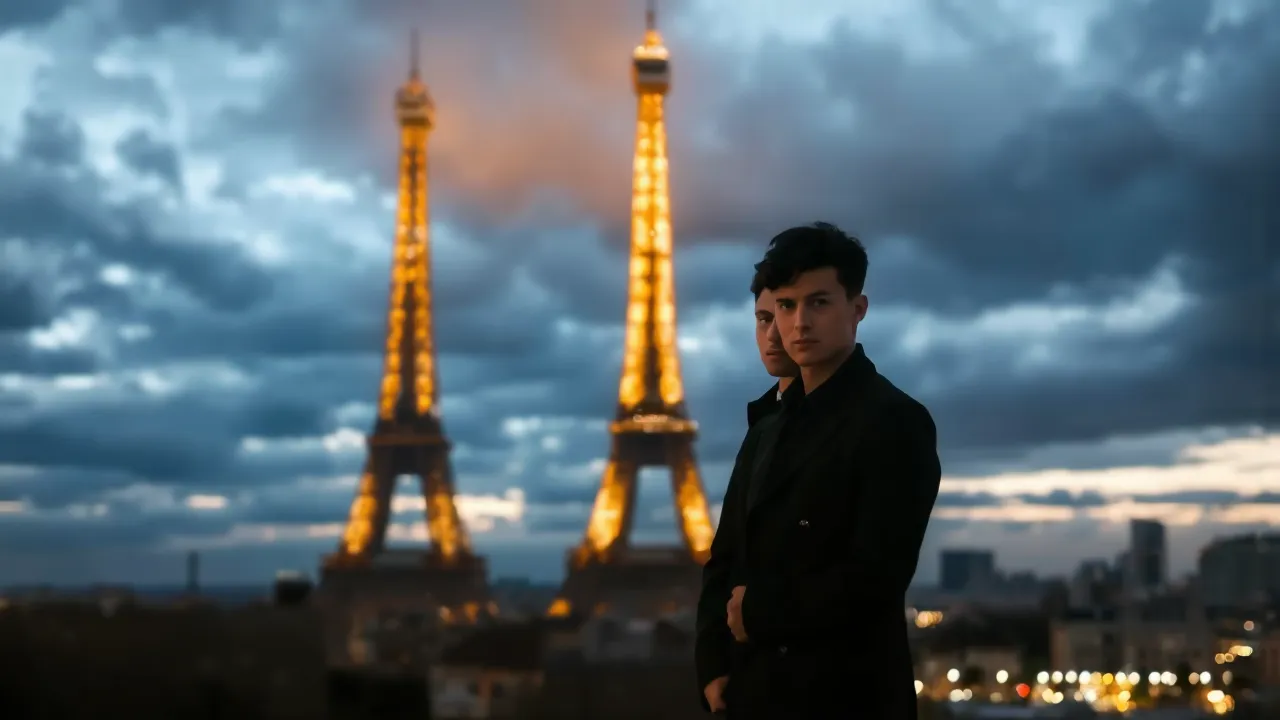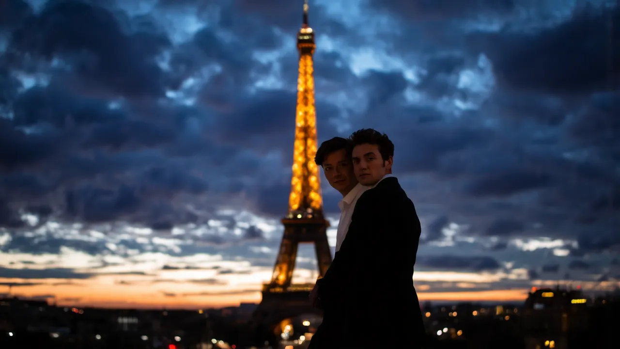Two young men stand, embracing, looking at the viewer. Behind them, the Eiffel Tower rises against a spectacular cloudy sky, illuminated by the soft, warm lights of the city below. The scene captures a blend of elegance, tenderness, romance, and serenity at dusk.