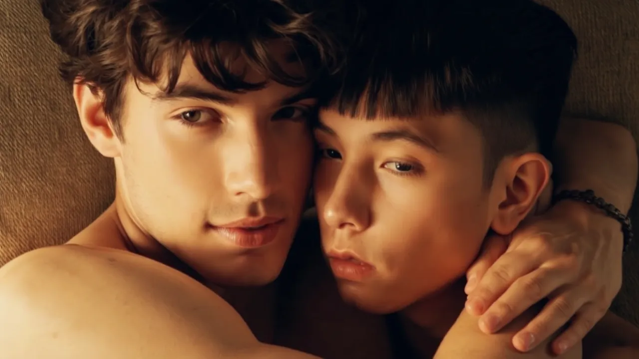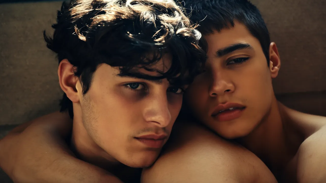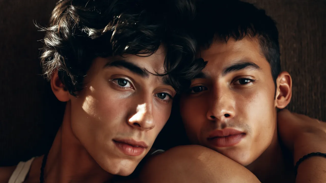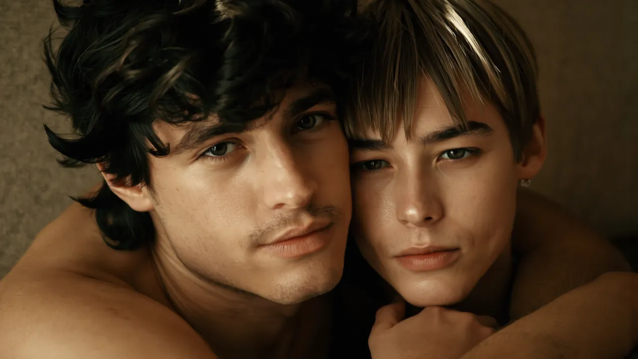 A warm-toned, intimate portrait of two young men embracing, with one resting his head on the other’s shoulder. The man in the foreground has tousled dark curls and soft, chiseled features, while the other has straight, short hair and a serene expression. Light filters softly over them, highlighting their skin and creating a sense of warmth and closeness. The background features a textured surface, adding to the overall cozy ambiance of the scene.
