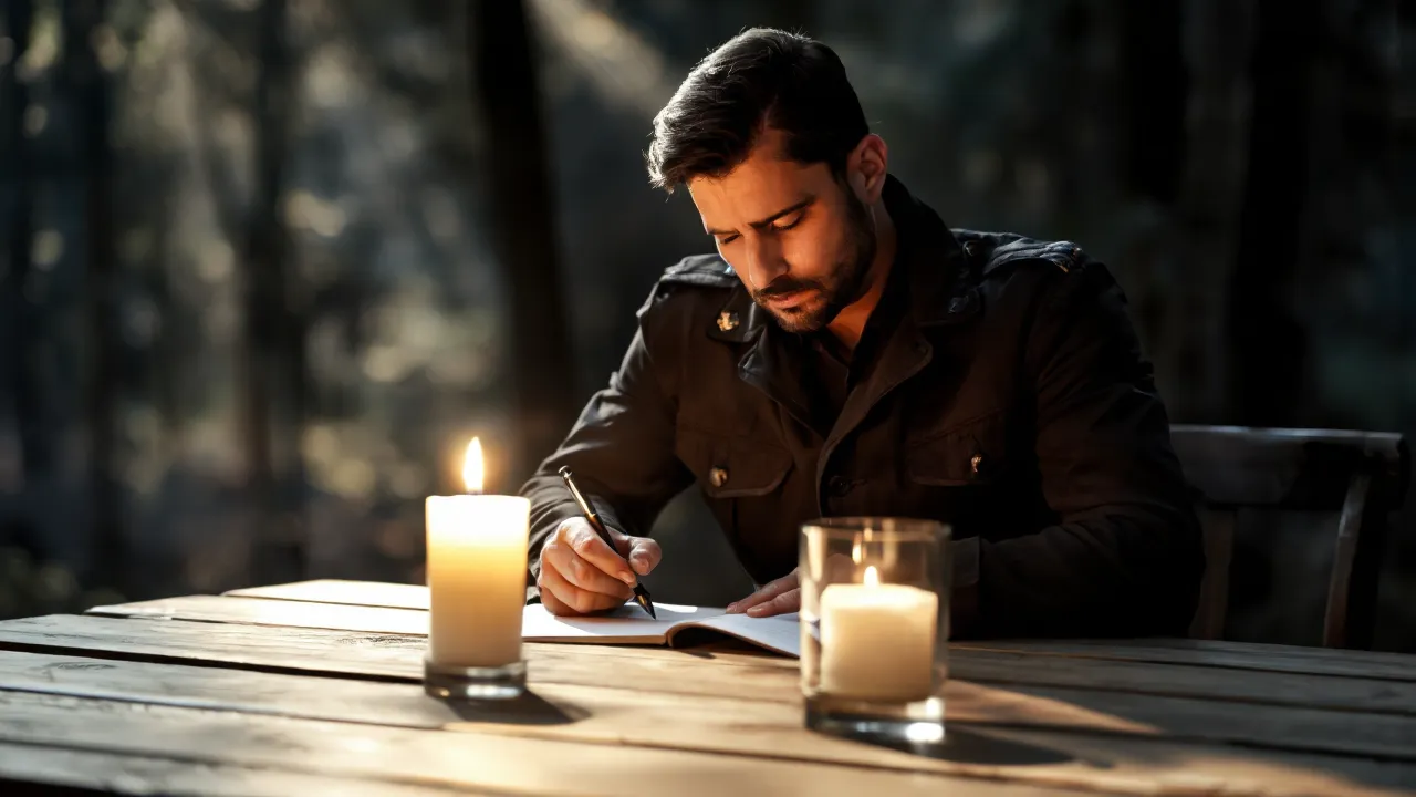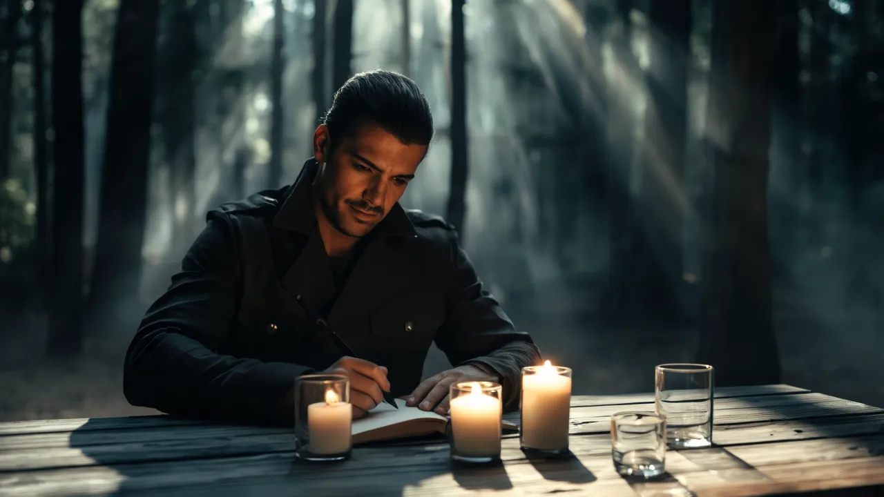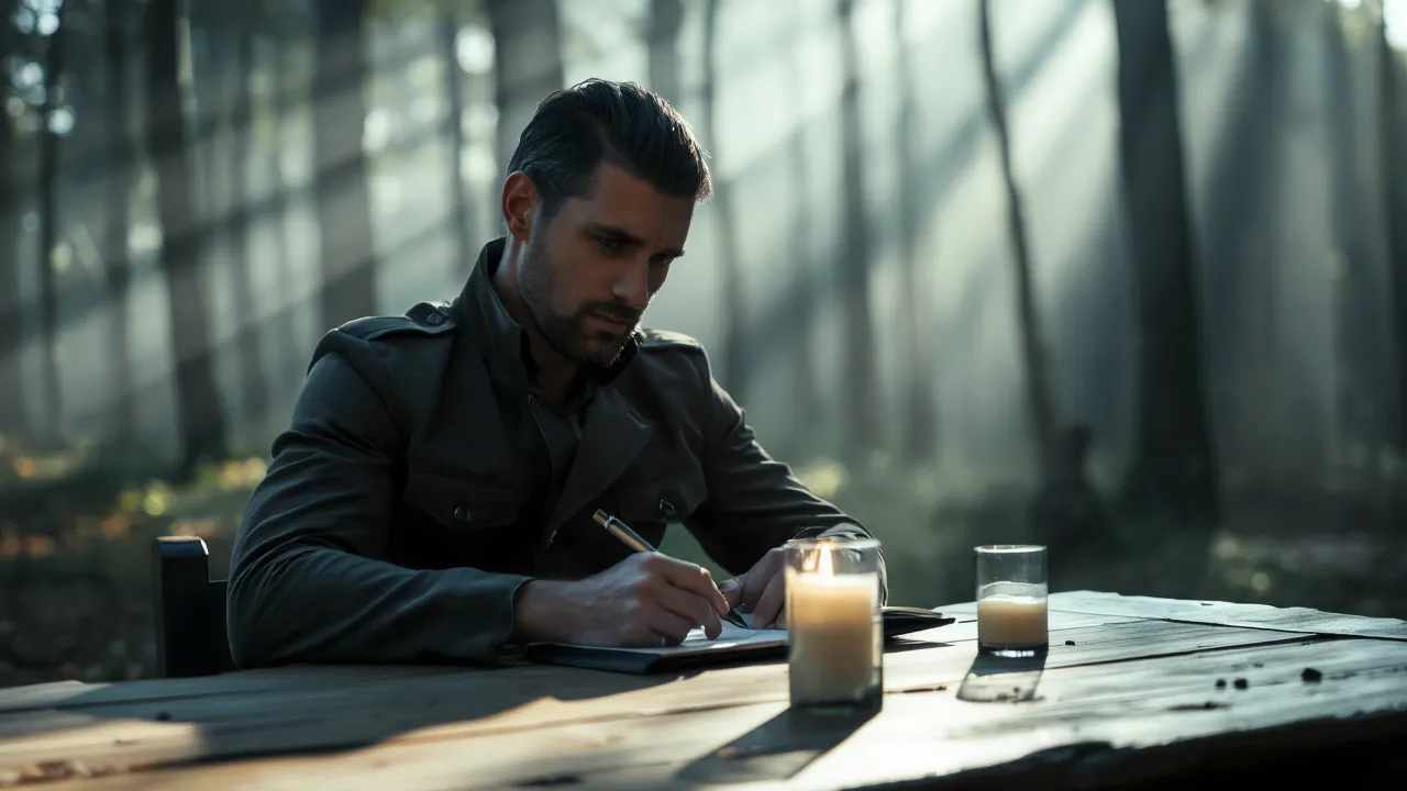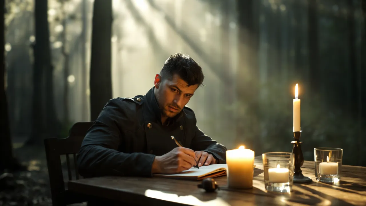 A muscular man wearing a military-style jacket sits at a wooden table in a misty forest. He focuses on writing with a pen, illuminated by the soft glow of a lit candle in front of him. Two clear glass candles are placed on the table, adding to the serene atmosphere. Sunlight filters through the trees, casting a dramatic light that enhances the contemplative mood of the scene.