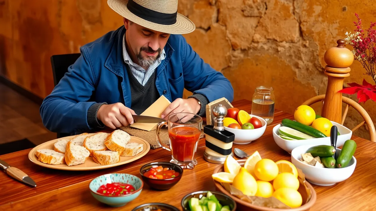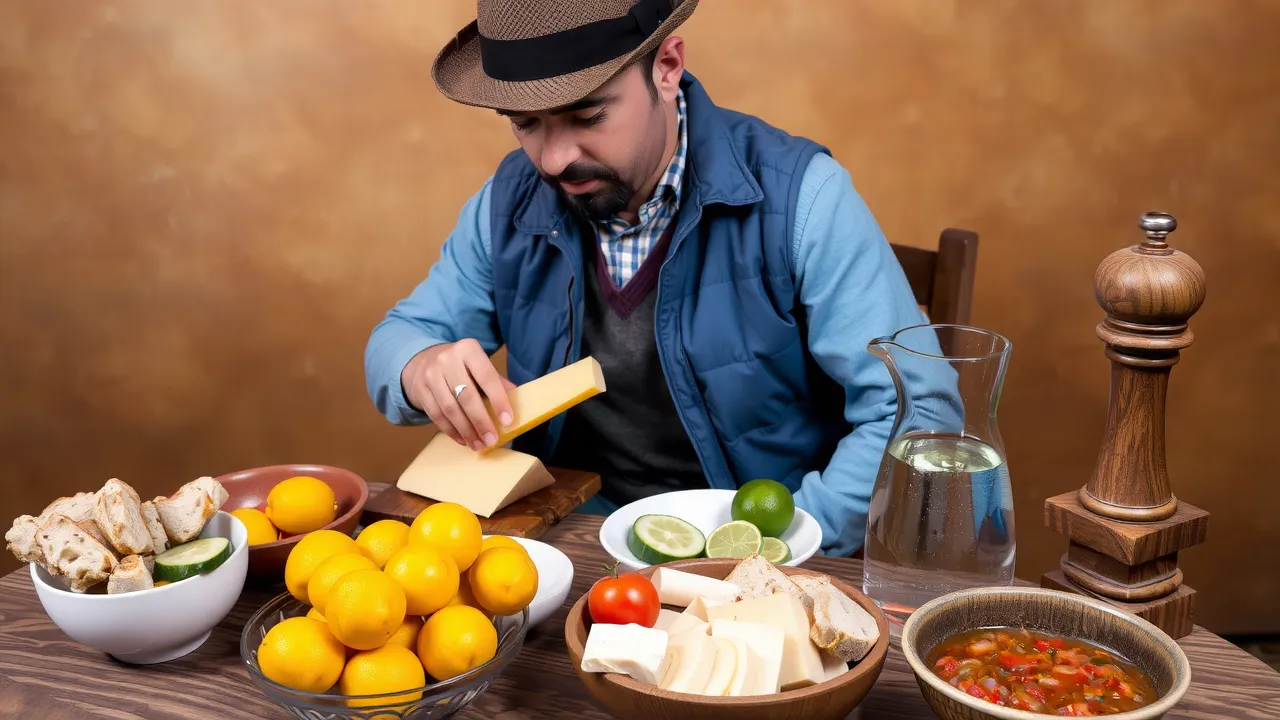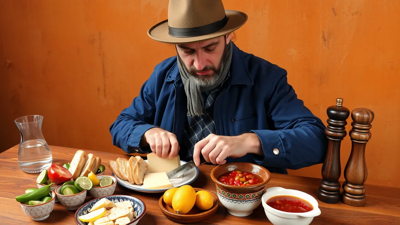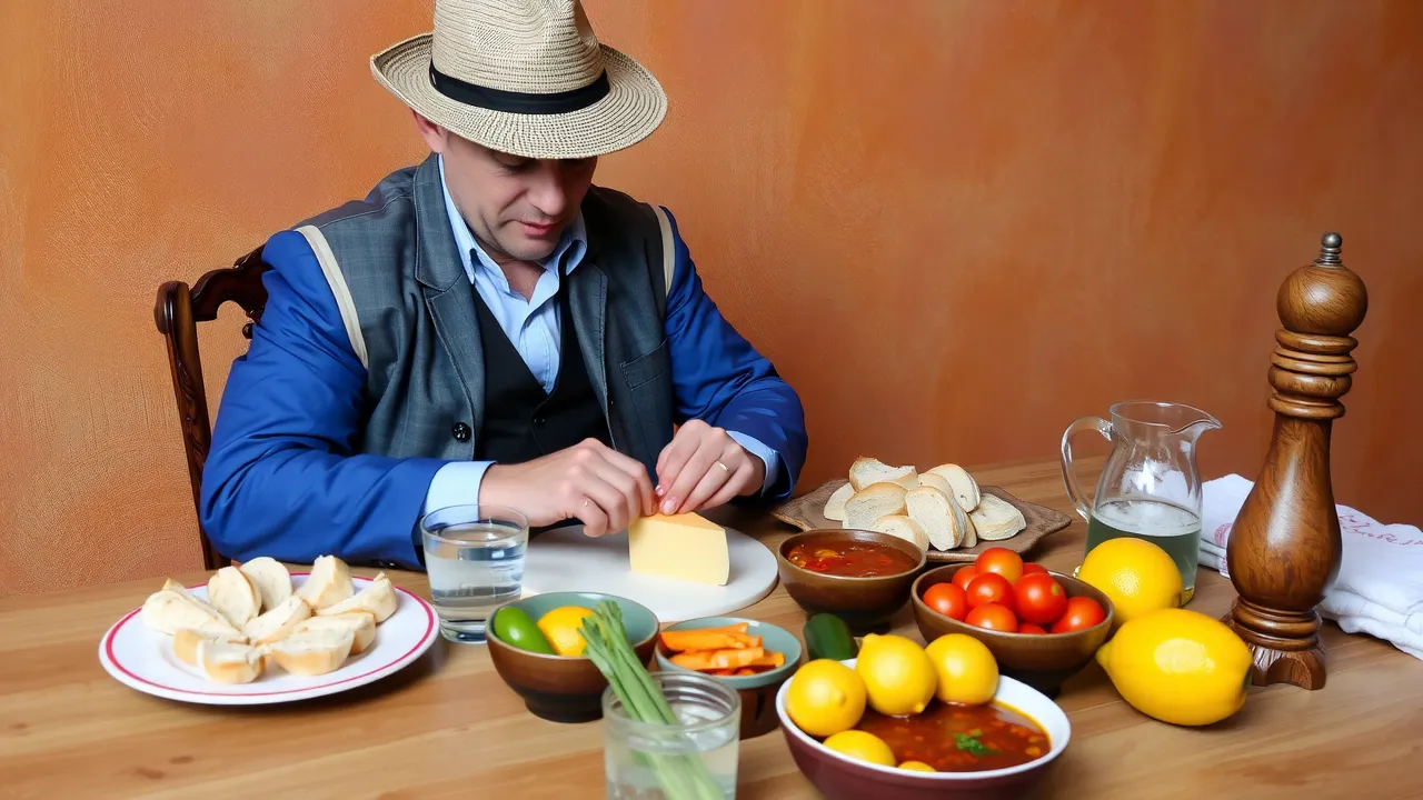 A man wearing a hat sits at a wooden table, carefully cutting cheese. He wears a blue jacket over a vest and shirt. Various foods are placed on the table: a plate of sliced bread, bowls of vibrant fruits and vegetables, such as cucumbers and lemons, and a bowl of salsa. Nearby is a pitcher of water, next to a wooden pepper mill. The background features warm, textured colors that enhance the rustic atmosphere of the scene.