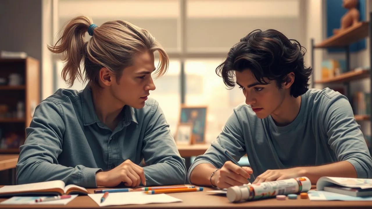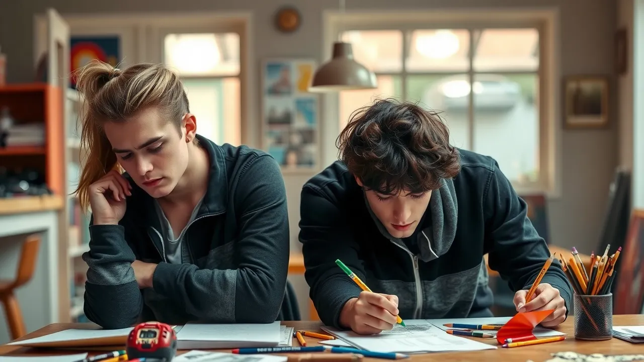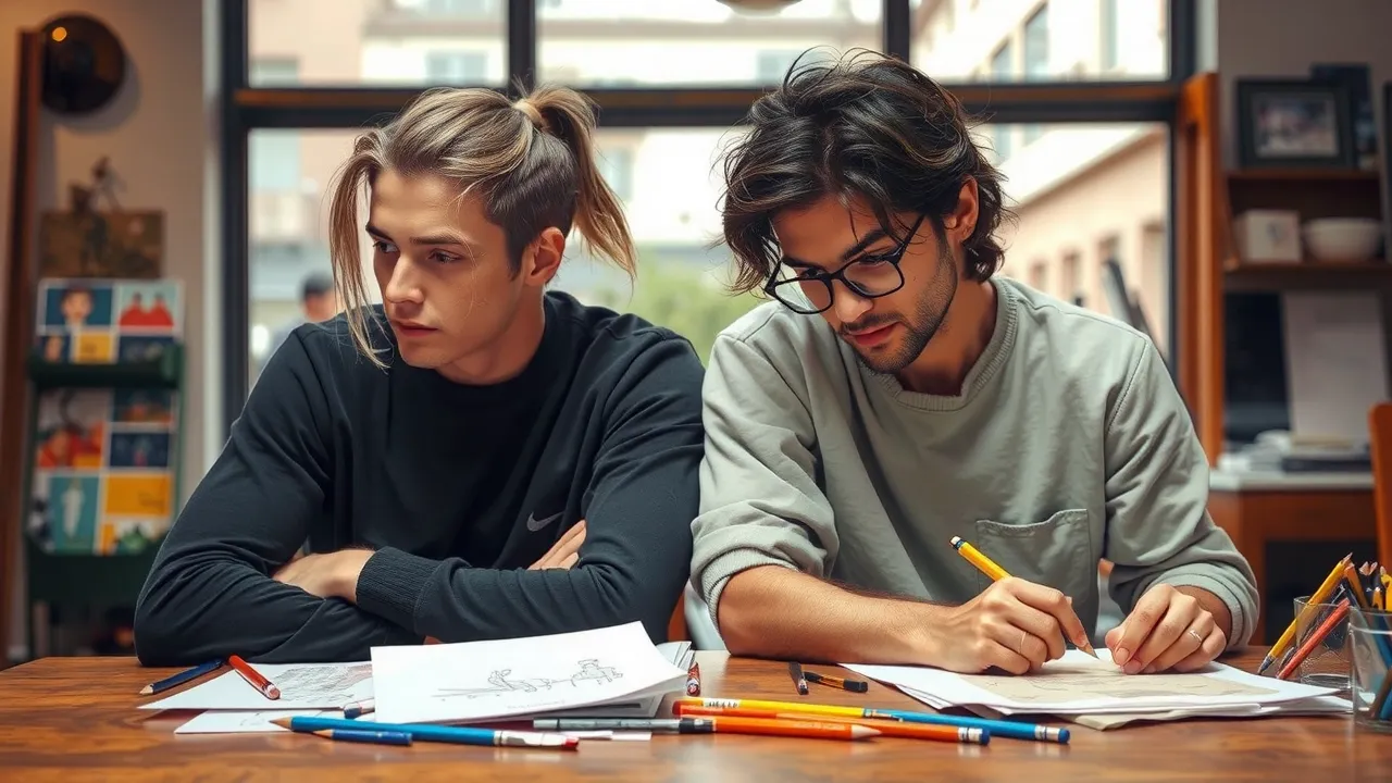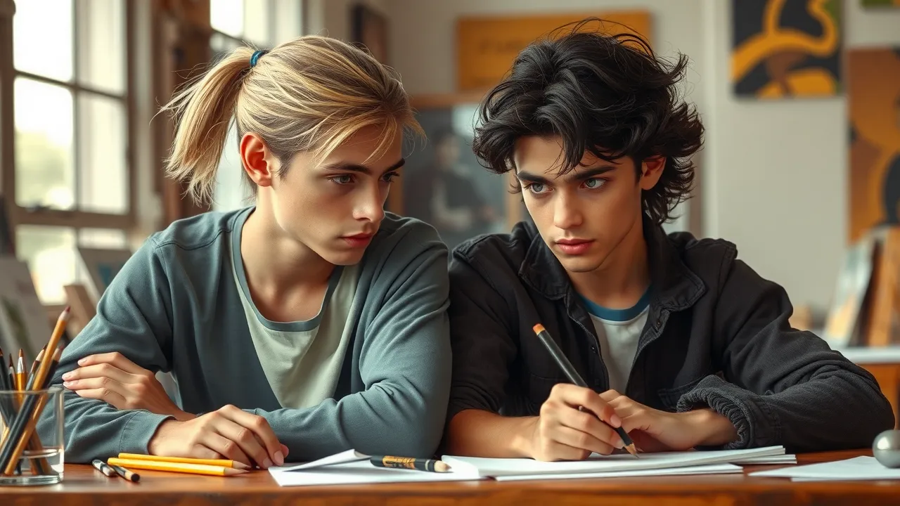 Two young men sitting side by side at a table. The first man, with long, light hair tied in a ponytail, appears deep in thought, while the second man, with dark, wavy hair, stares intently at his work. The background features a softly lit interior, suggesting an art studio or café atmosphere. Pencils, paintbrushes, and papers are scattered across the table, emphasizing his creative activity.