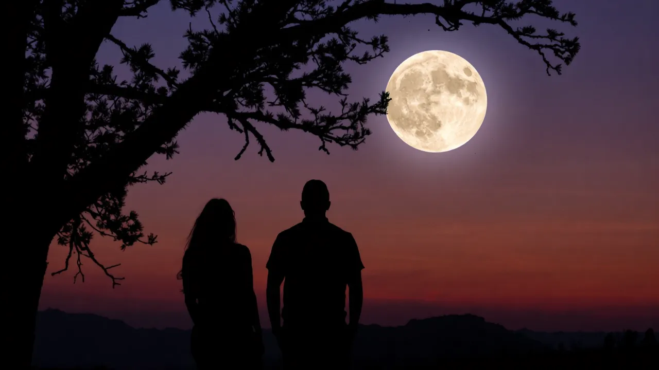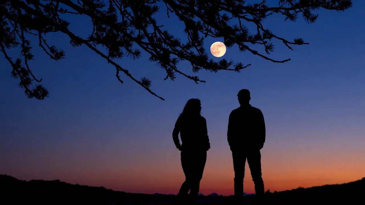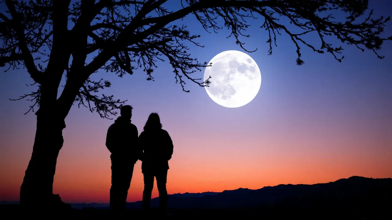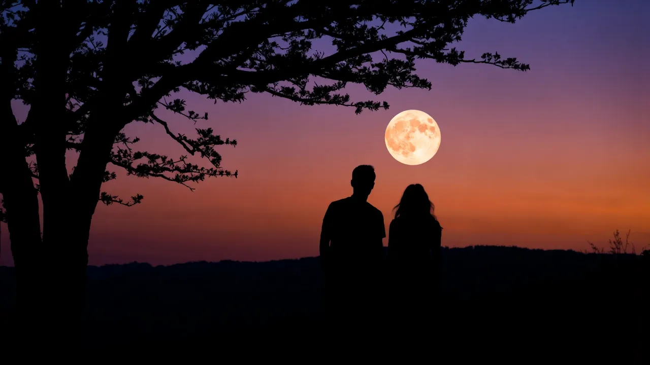 Silhouettes of two people standing beneath tree branches against a twilight sky, featuring a large, bright full moon in the background. The landscape is serene, with mountains and a soft gradient of colors from the sunset.