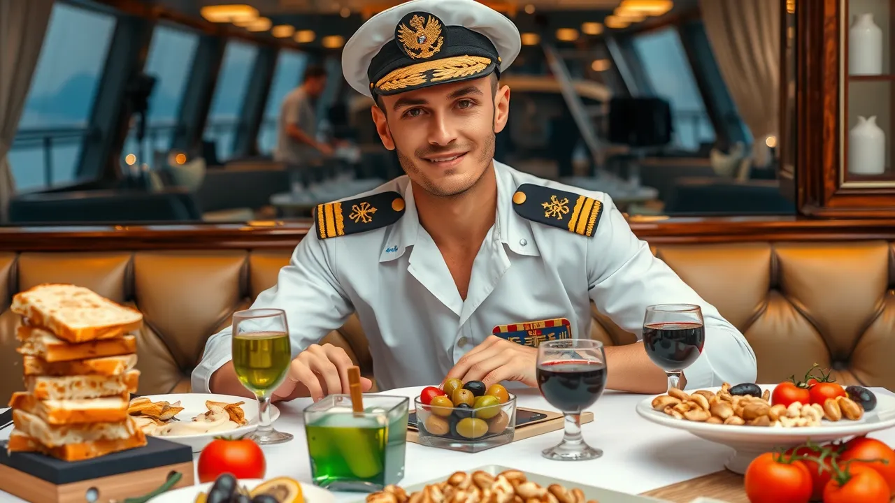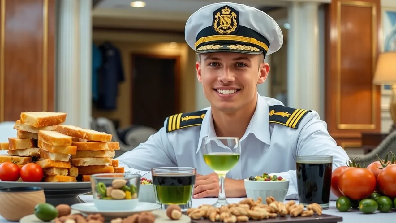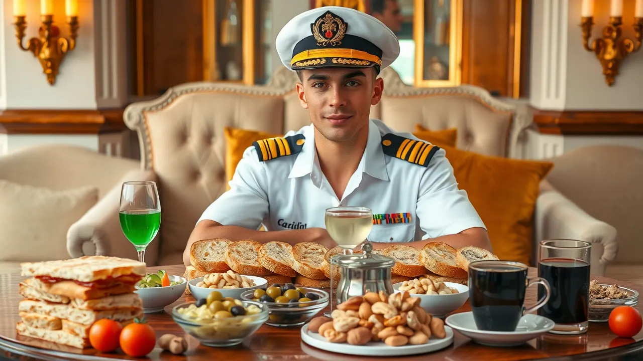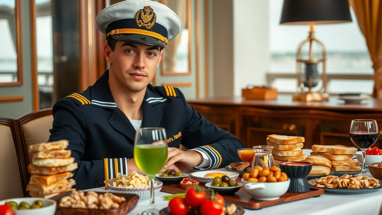A handsome young man in a naval officer’s uniform sits at a luxurious table. He wears a captain’s hat adorned with a gold emblem and epaulettes. The table is spread with a variety of foods, including stacked slices of bread, small bowls of vegetable spread, olives, and nuts. In front of him are a glass of green liquid and a cup of a dark drink. Fresh tomatoes and more nuts are placed on the table, creating a welcoming and celebratory atmosphere.