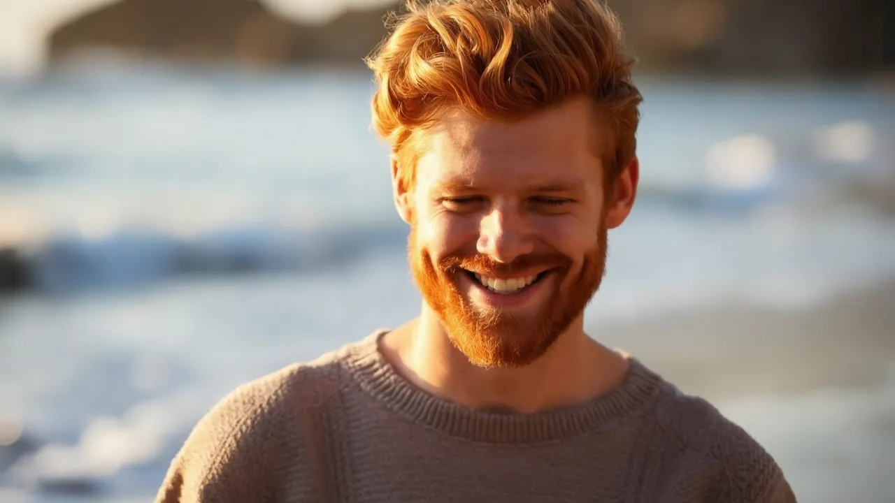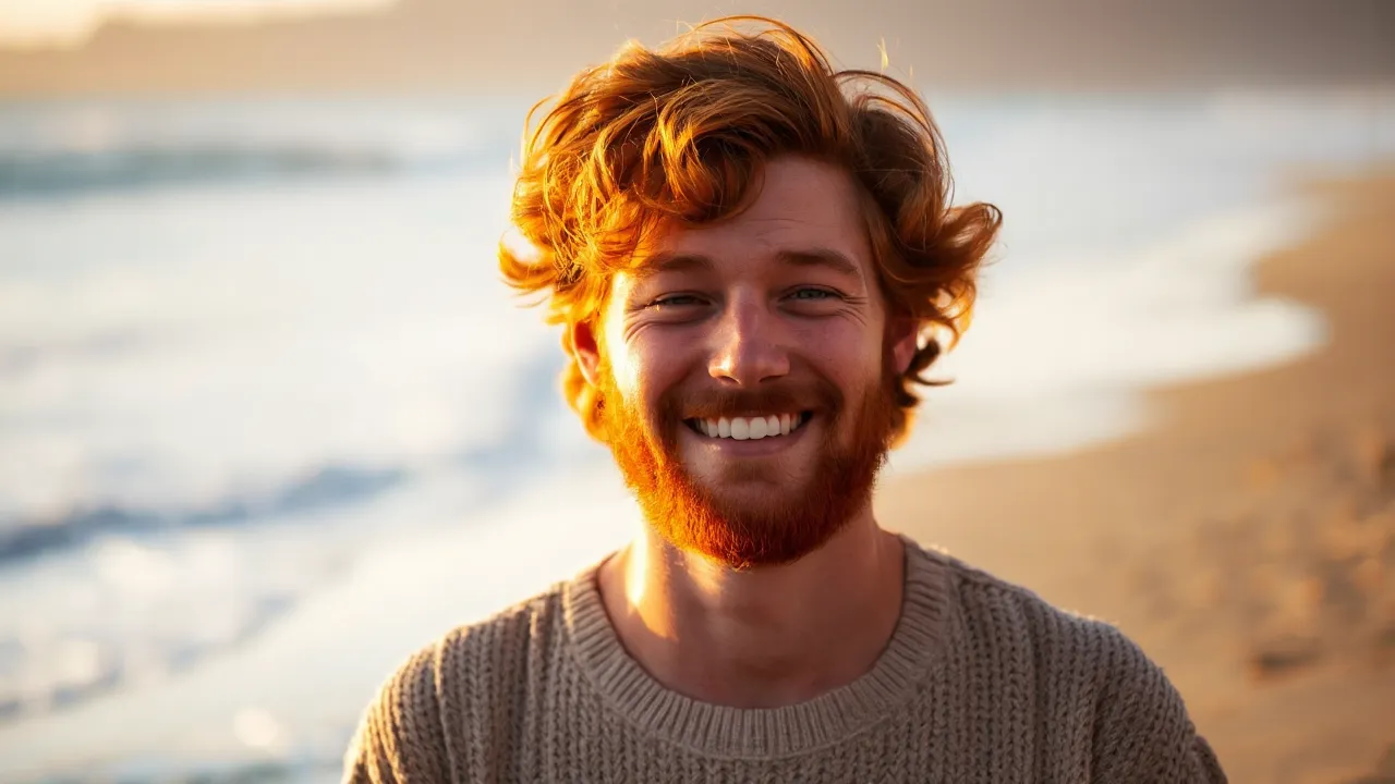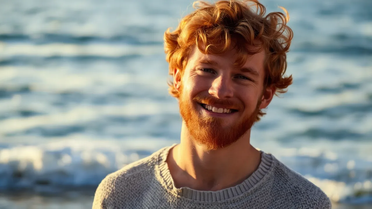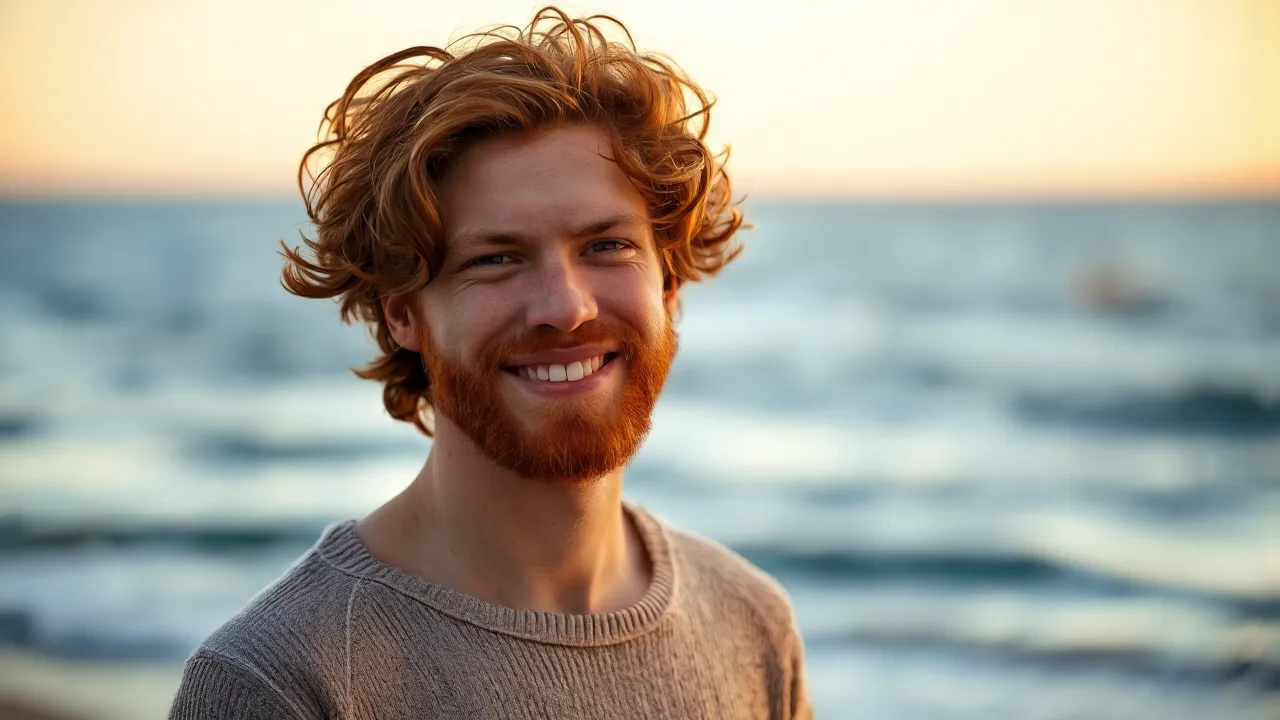 A young man with wavy red hair and a red beard stands on the beach, smiling gently. He’s wearing a loose-fitting light-colored knit shirt, and the soft glow of golden hour sunlight highlights his facial features. The ocean is visible in the background, creating a serene atmosphere.
