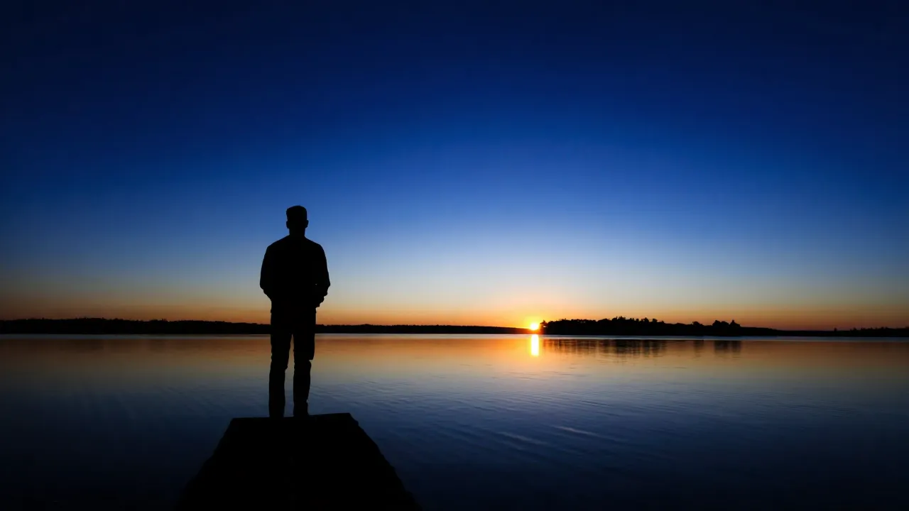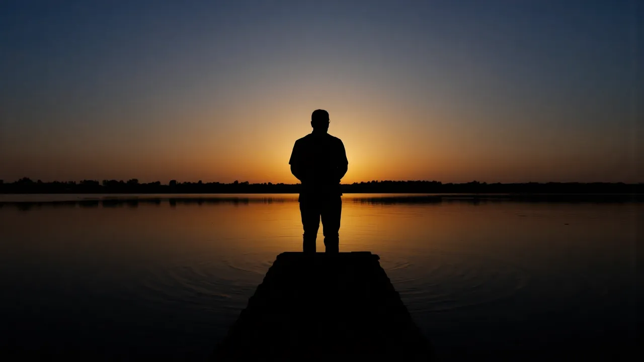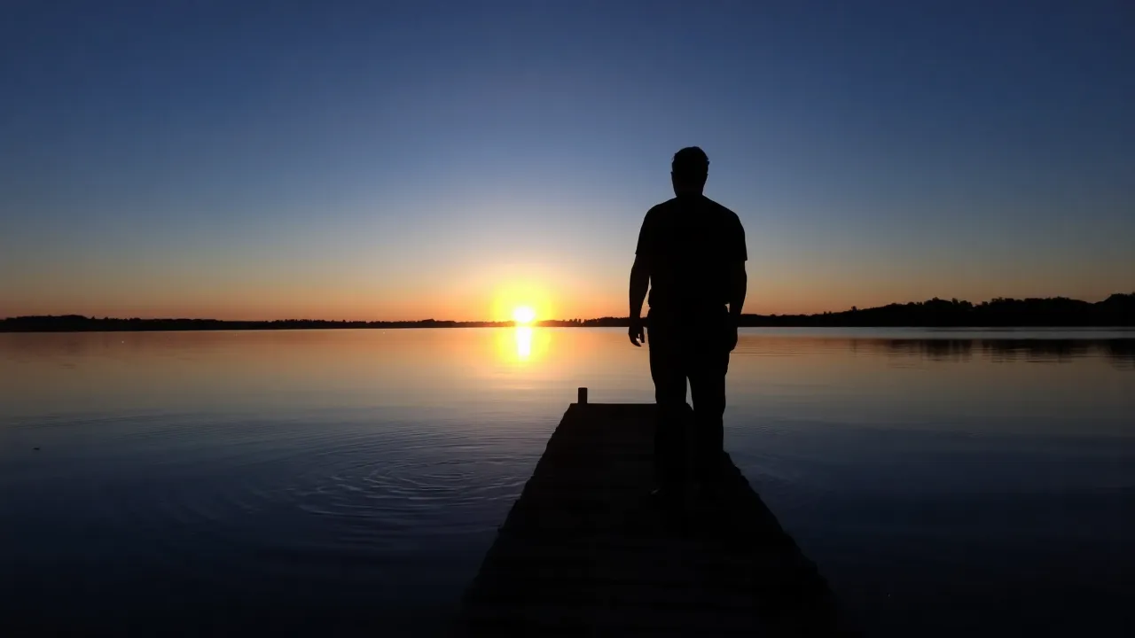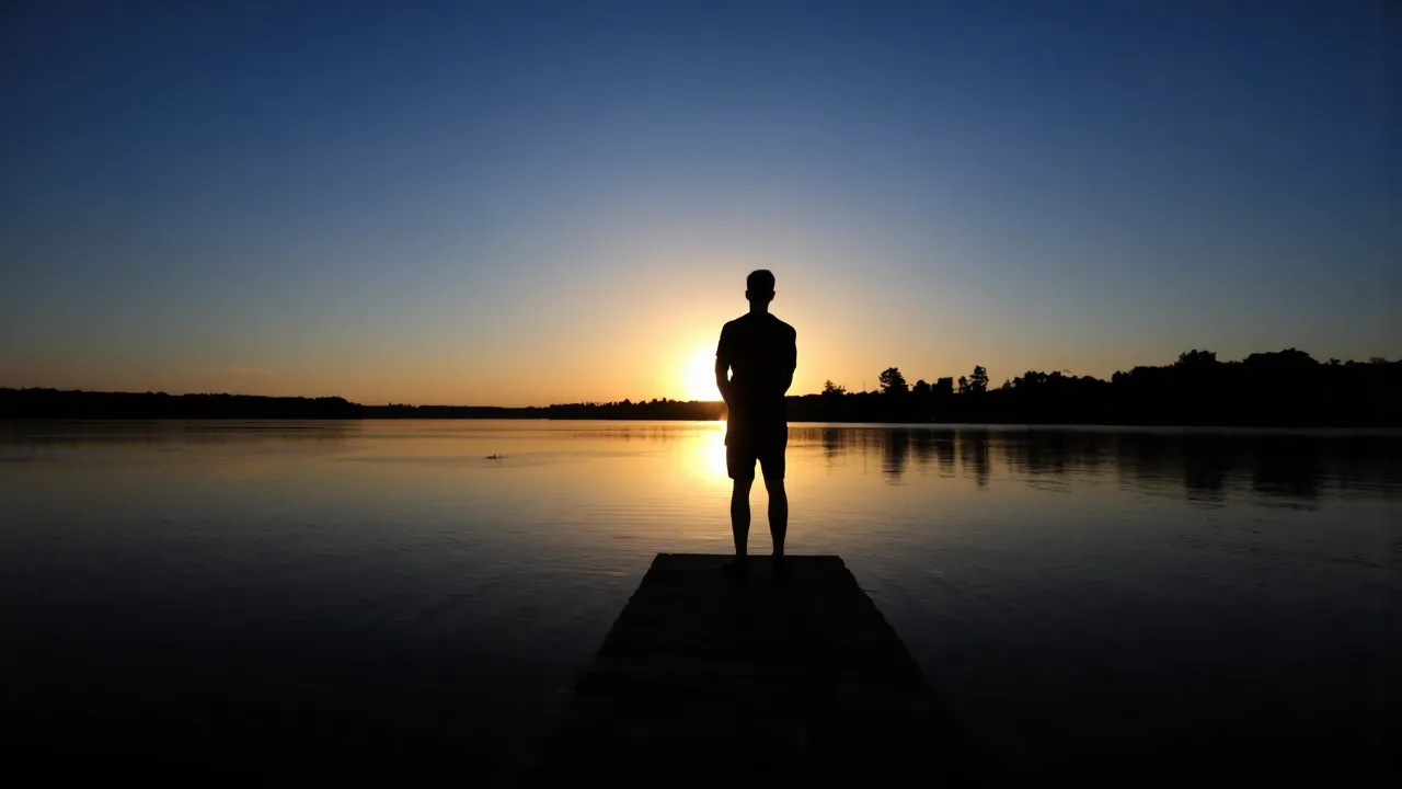 A person stands silhouetted on a wooden pier at dawn, gazing at the horizon where the sun rises above the water’s surface. The tranquil lake reflects the soft hues of the sunrise, while gentle ripples reflect the surrounding trees. The sky transitions from a deep blue to lighter shades, creating a serene atmosphere filled with tranquility.