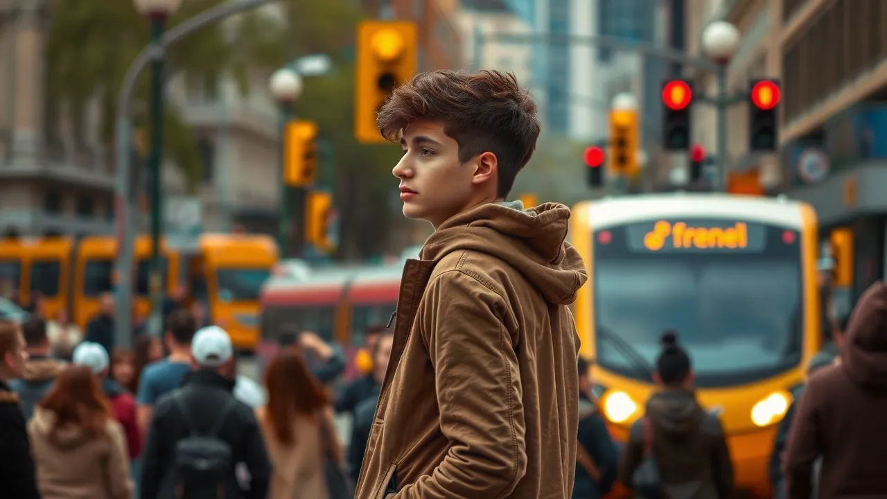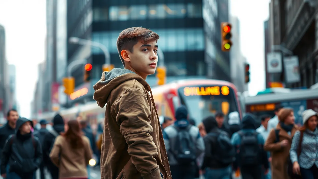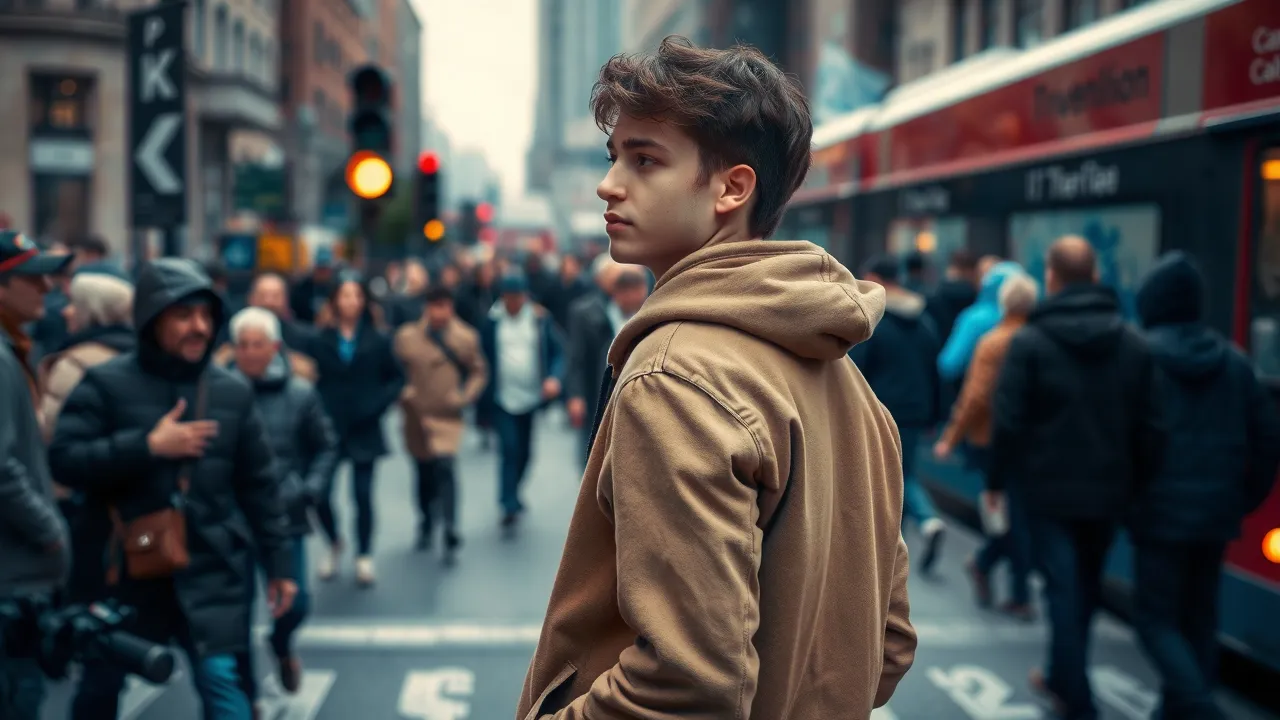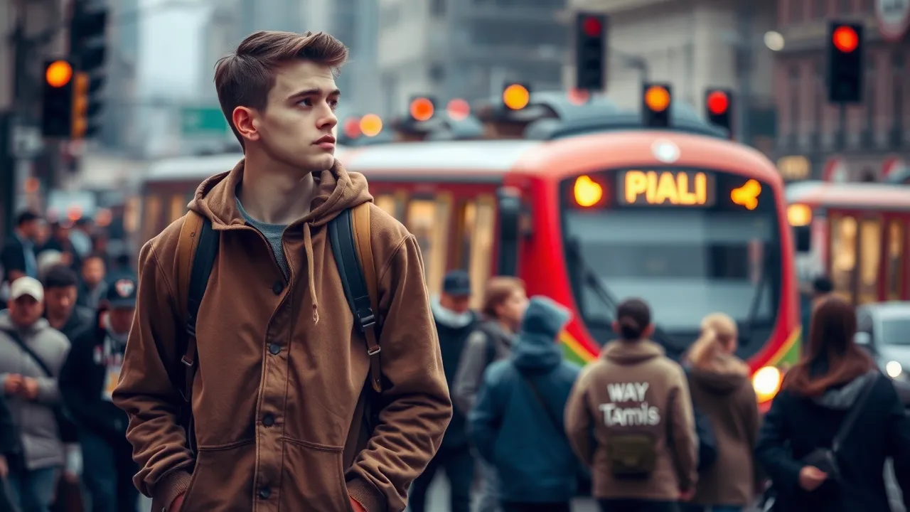 A young man stands in the foreground of a busy city scene, staring contemplatively away from the camera. He’s dressed in a brown hooded jacket, hands in his pockets, against the backdrop of a chaotic crowd rushing past him. Blurry figures and a train in the background create a sense of movement and urgency, while traffic lights and urban structures are barely visible.