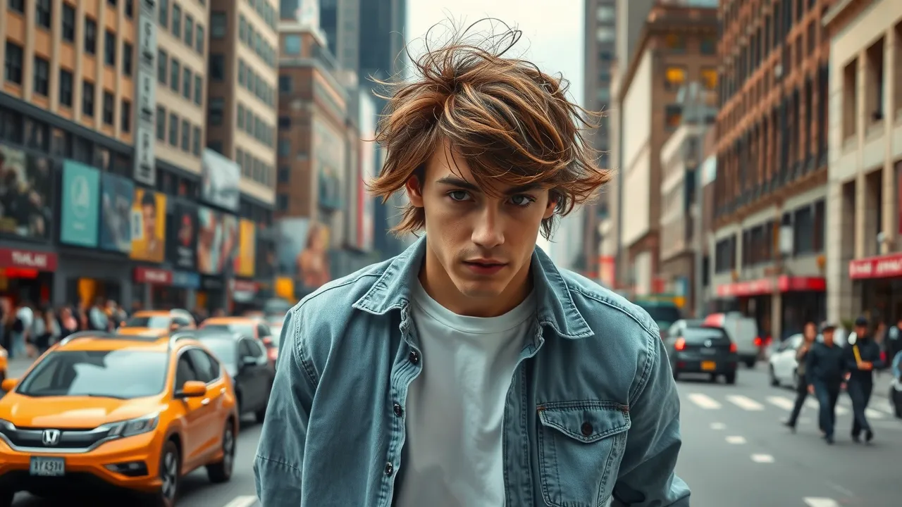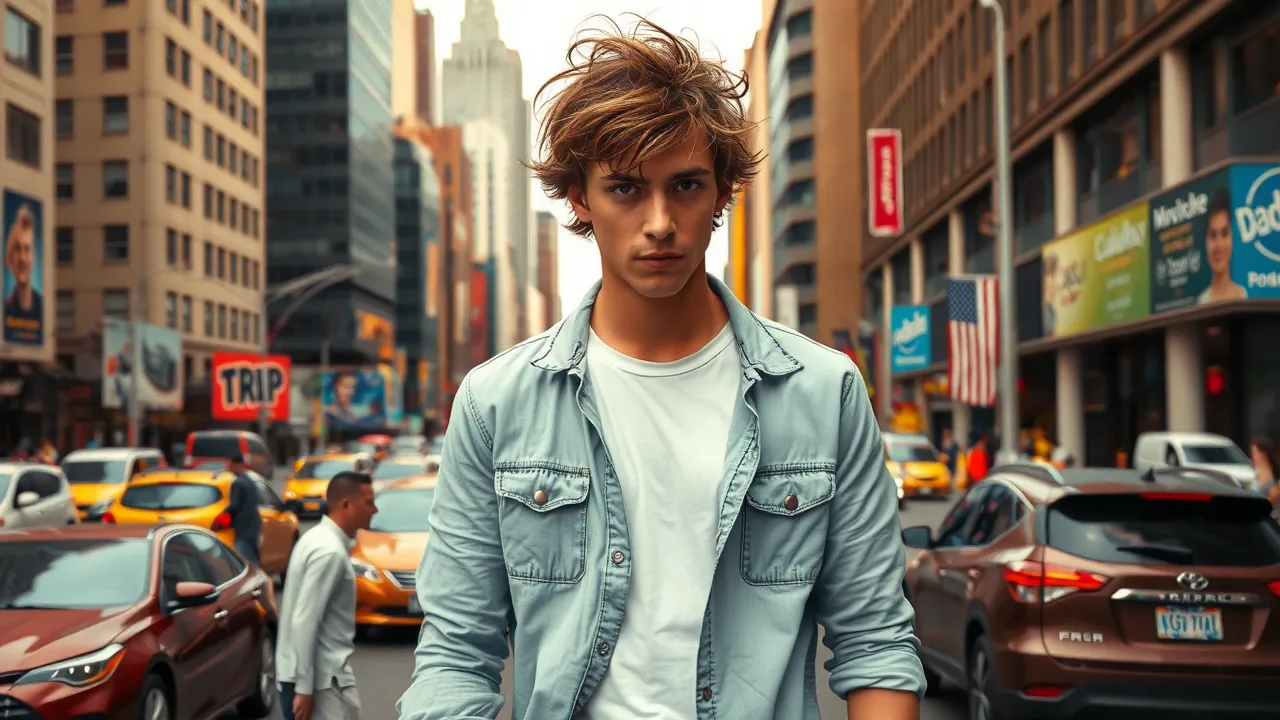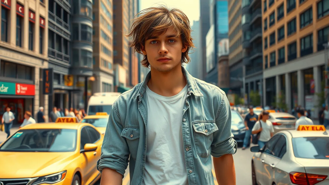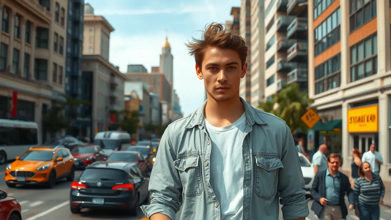 In a bustling urban setting, a large, stylized figure of a young man with disheveled hair is depicted. He wears a light denim shirt over a white T-shirt and appears to be moving toward the viewer, his expression focused. The background features a busy street filled with cars, pedestrians, and tall urban buildings, creating a dynamic cityscape.