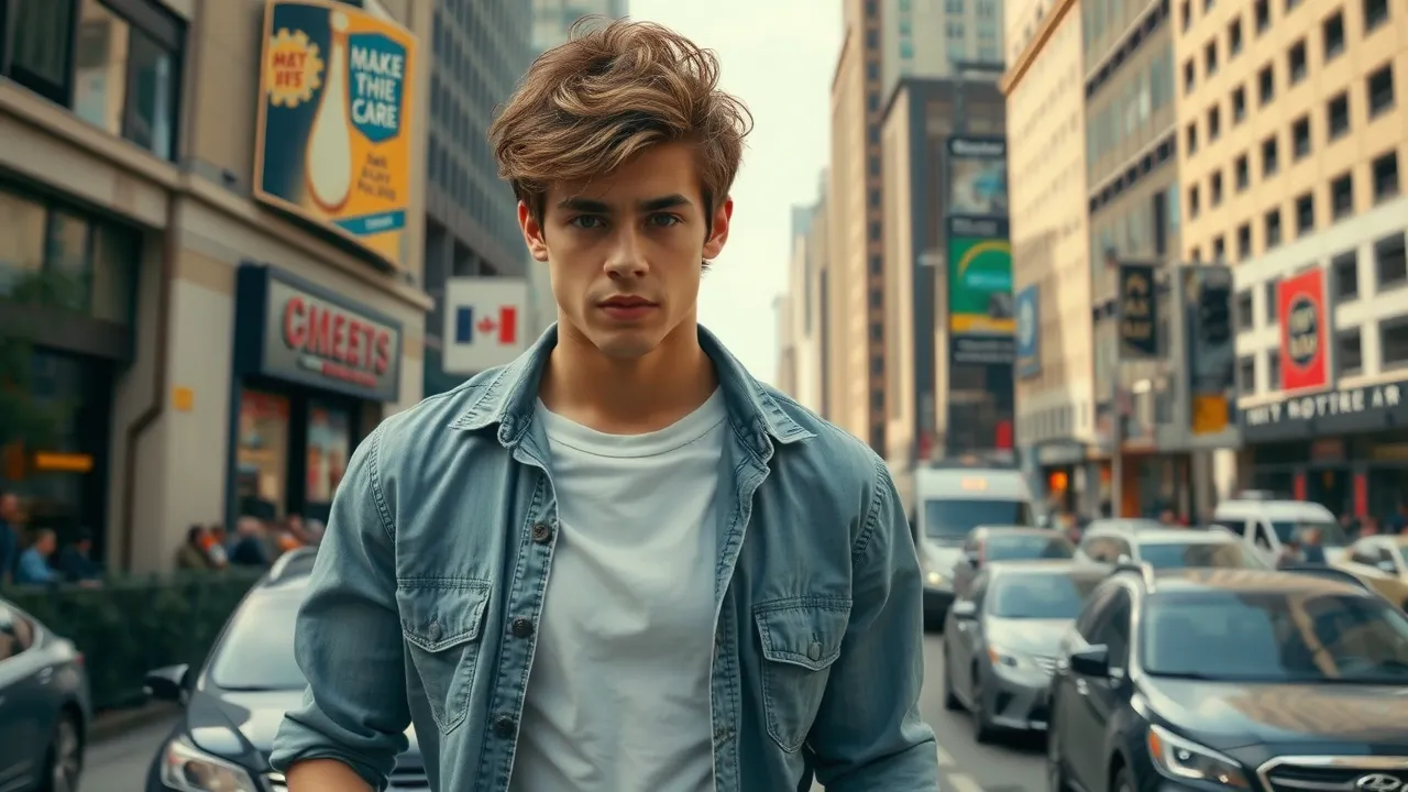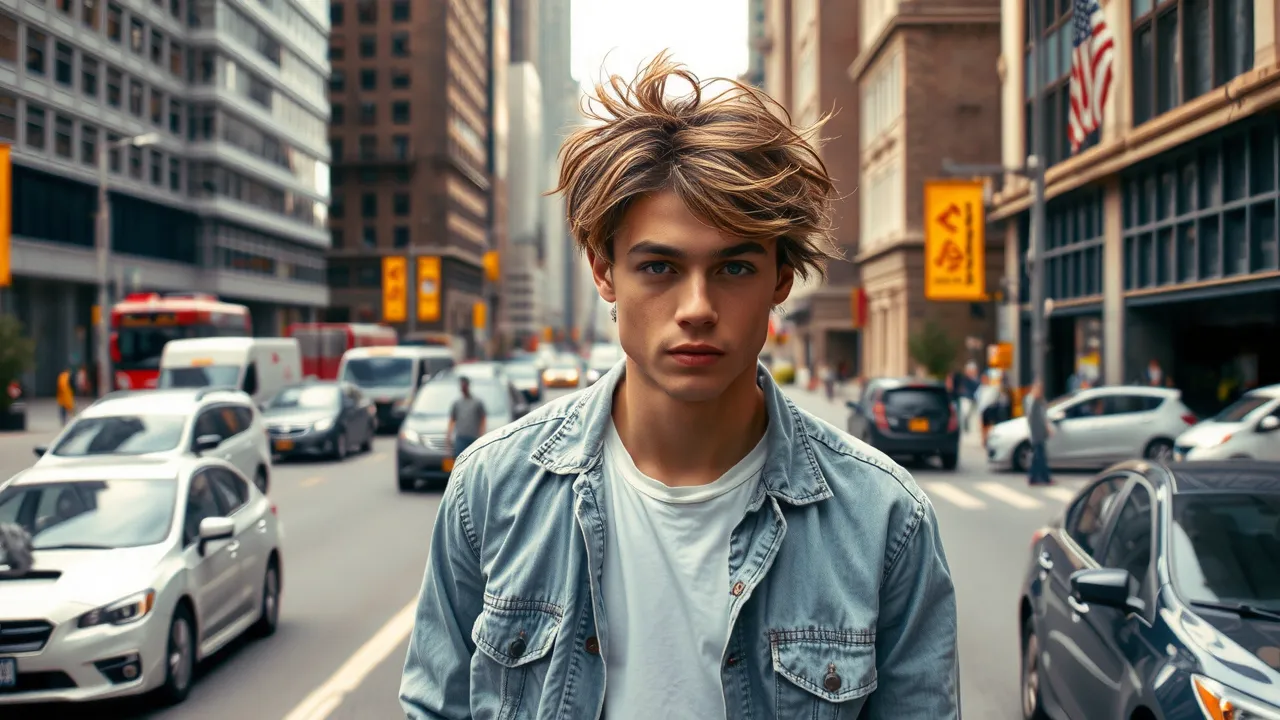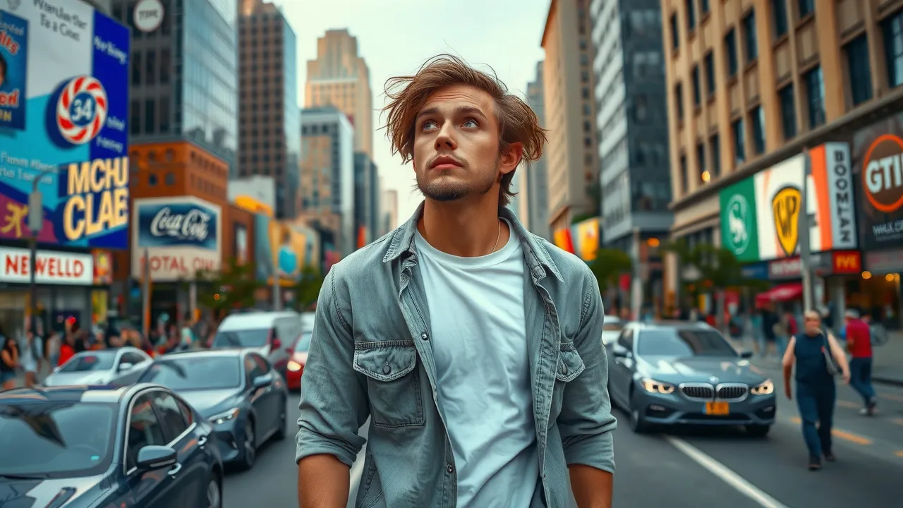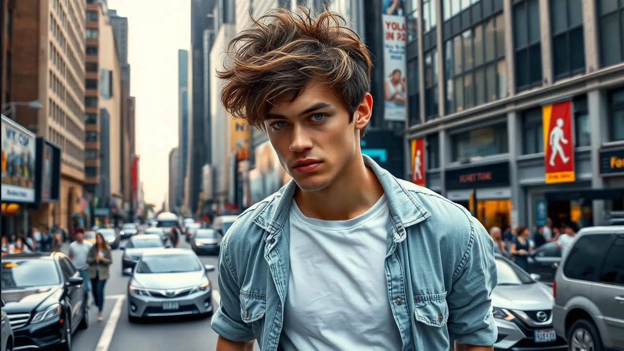 In a bustling urban setting, a large, stylized figure of a young man with disheveled hair is depicted. He wears a light denim shirt over a white T-shirt and appears to be moving toward the viewer, his expression focused. The background features a busy street filled with cars, pedestrians, and tall urban buildings, creating a dynamic cityscape.