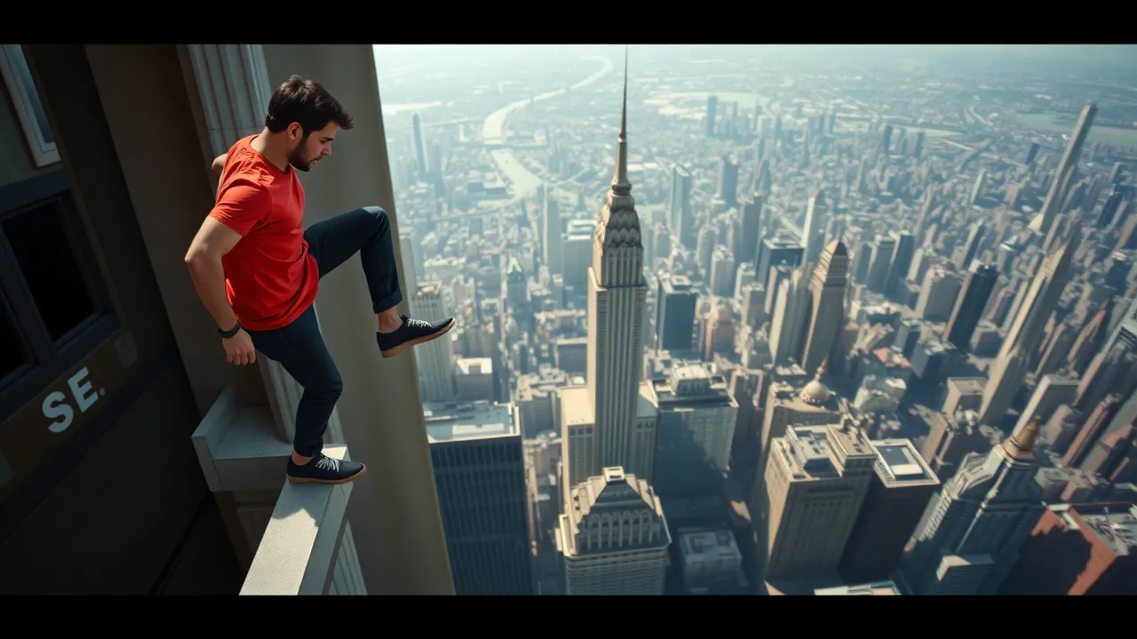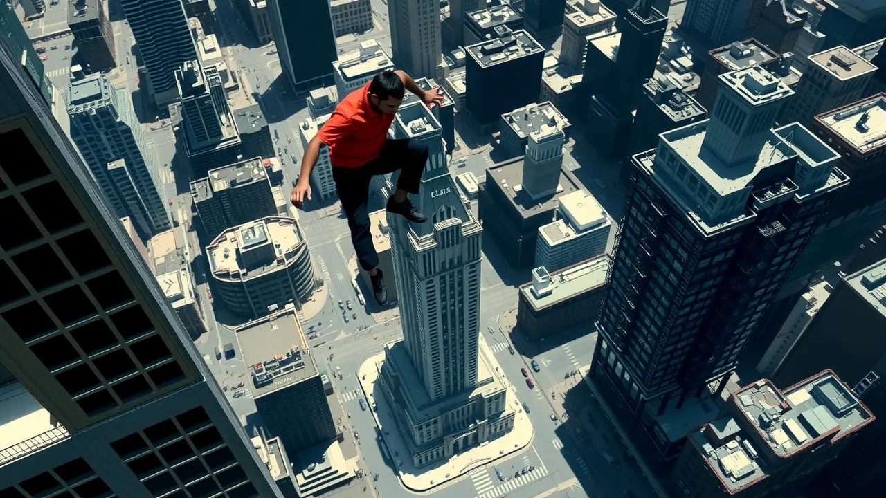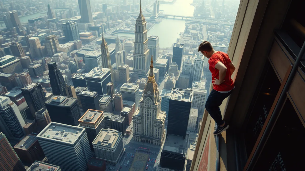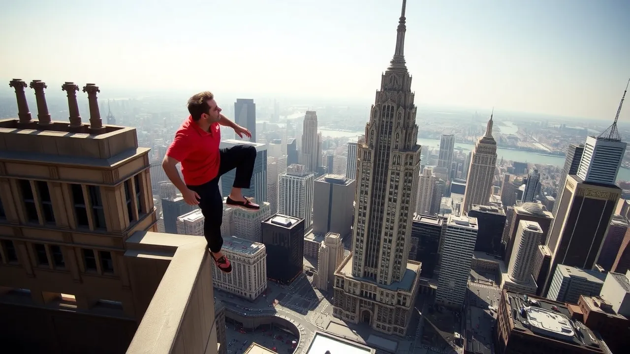 A casually dressed person, wearing a red shirt and black pants, balances precariously on the edge of a tall building. Below, the iconic Chrysler Building occupies a prominent position among a landscape of skyscrapers in a bustling cityscape. The scene is rendered in a dramatic style with stark contrasts, emphasizing the height and danger of the position. A sense of excitement and tension is palpable as the individual appears focused, looking down at the street far below.