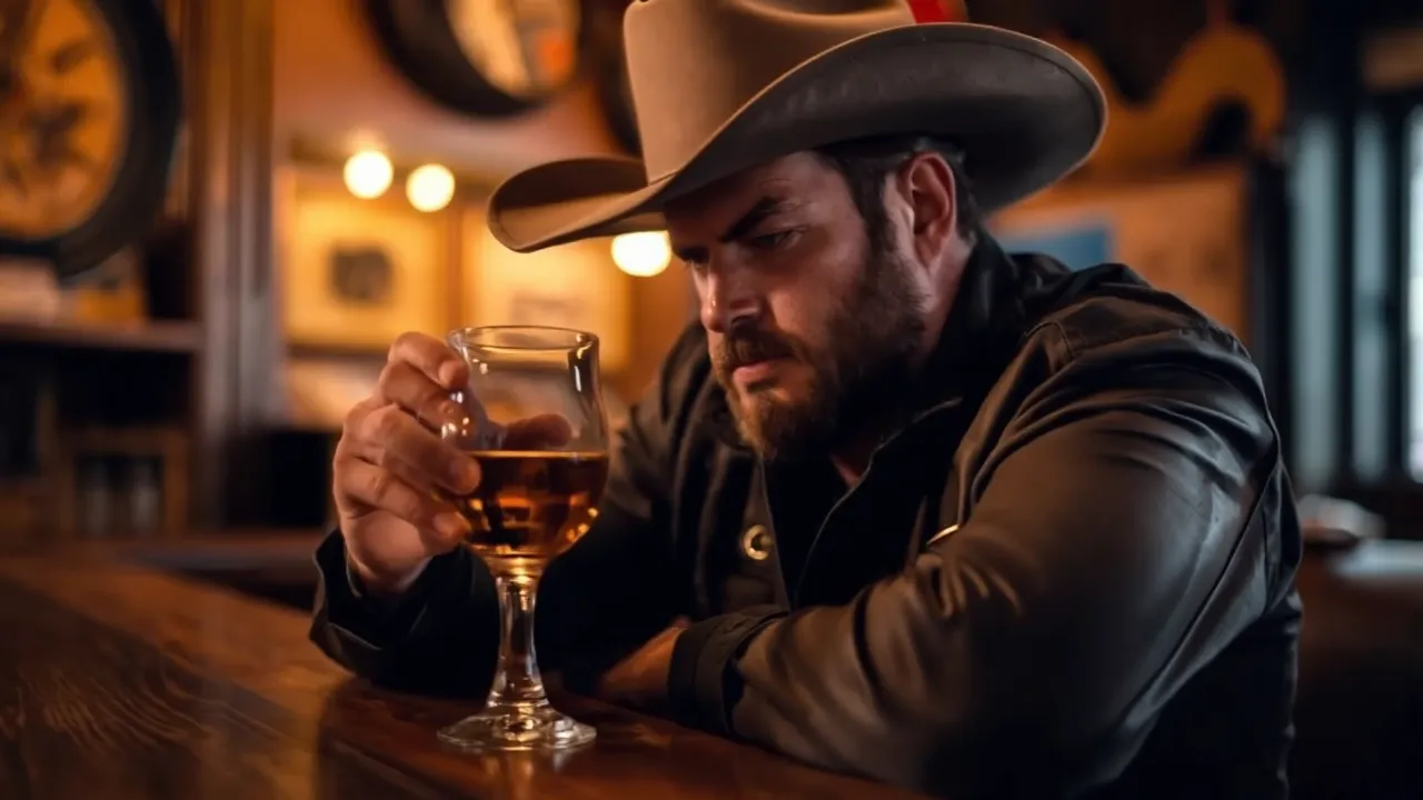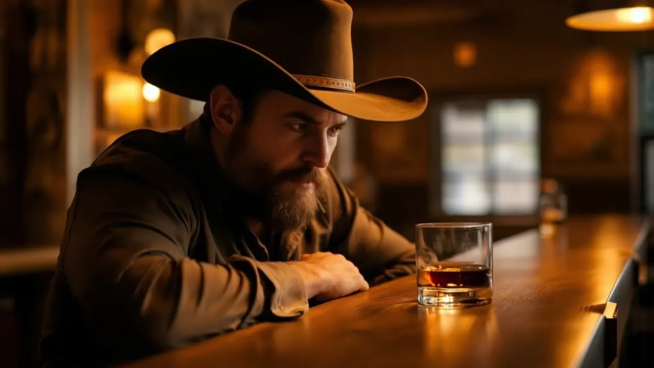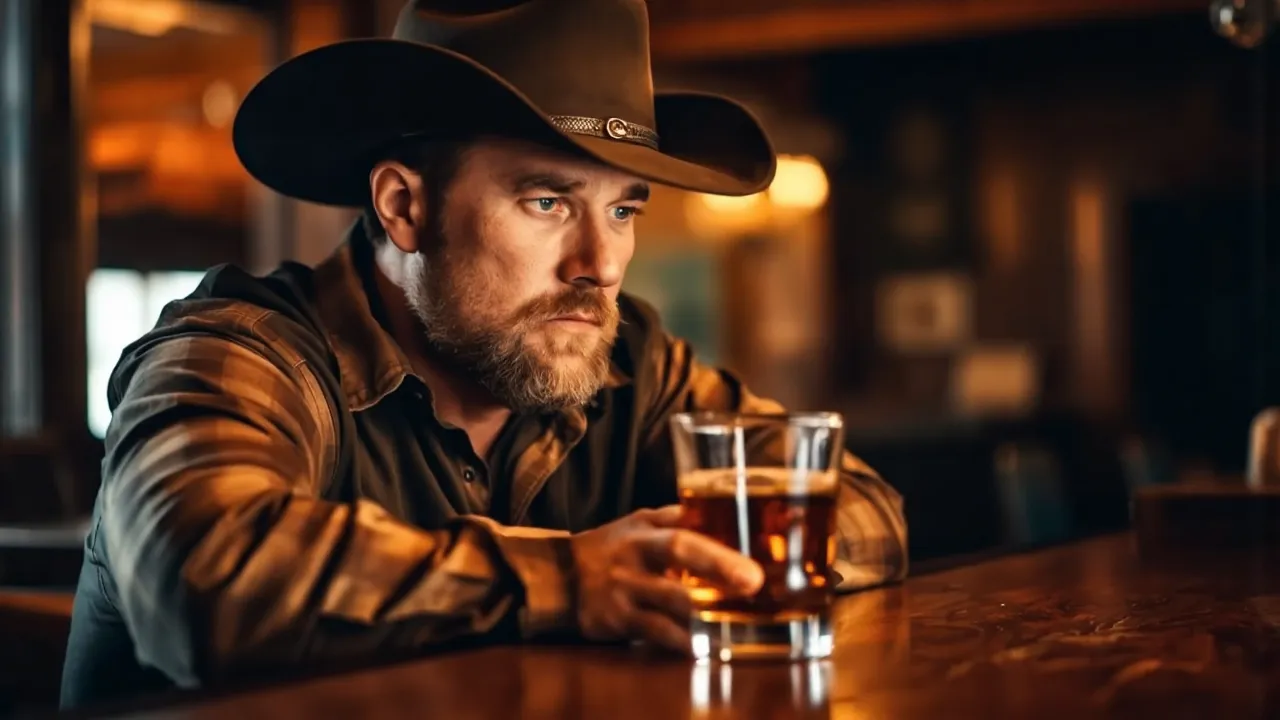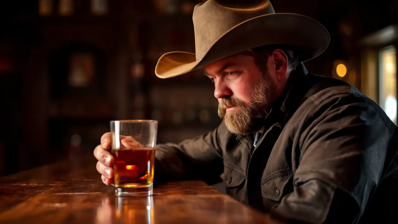 A sturdy man wearing a cowboy hat and western shirt sits at a wooden bar. He peers intently into a glass of amber whiskey resting on the counter. The warm ambient lighting creates a cozy atmosphere, enhancing the man’s thoughtful expression.
